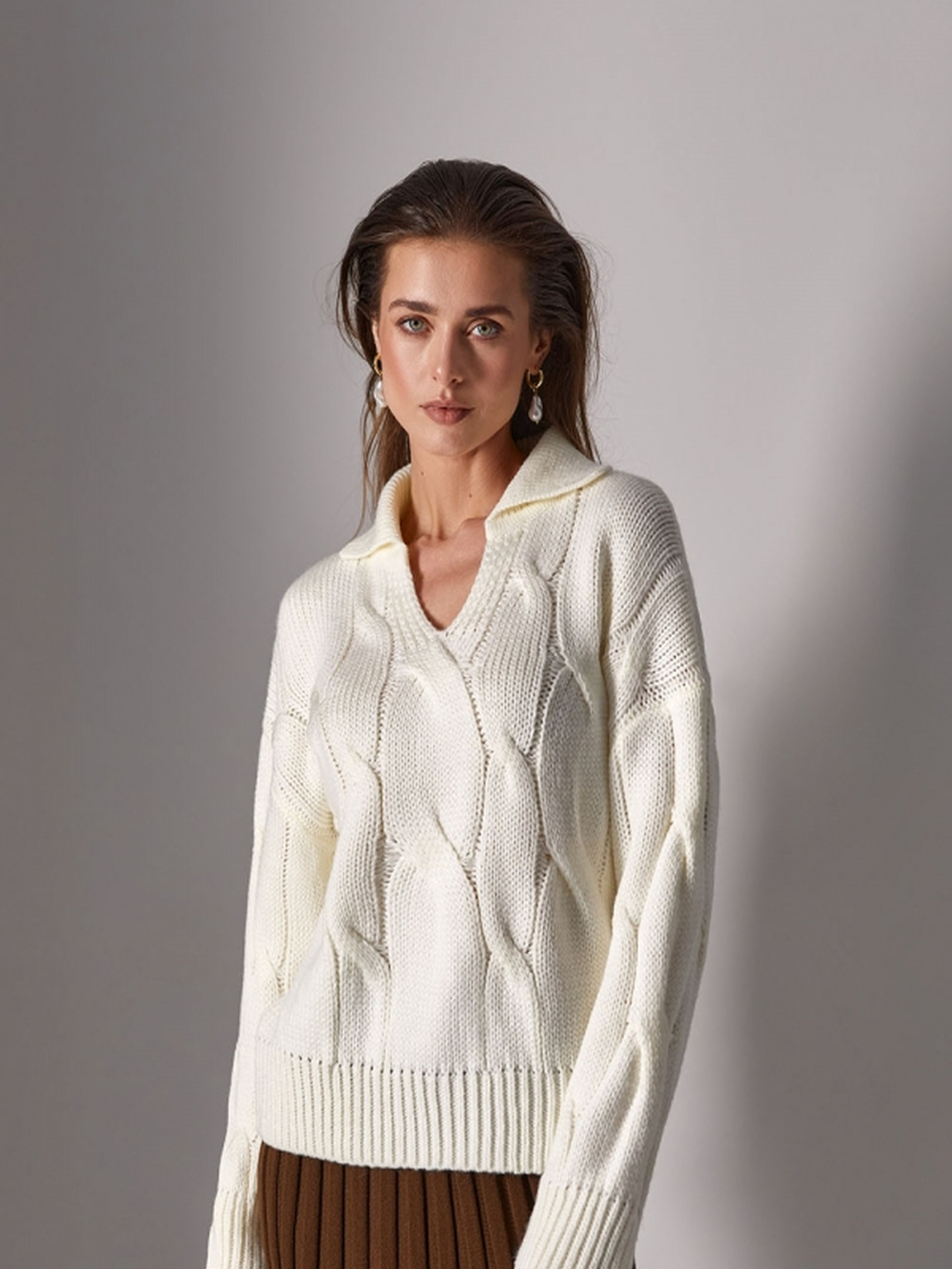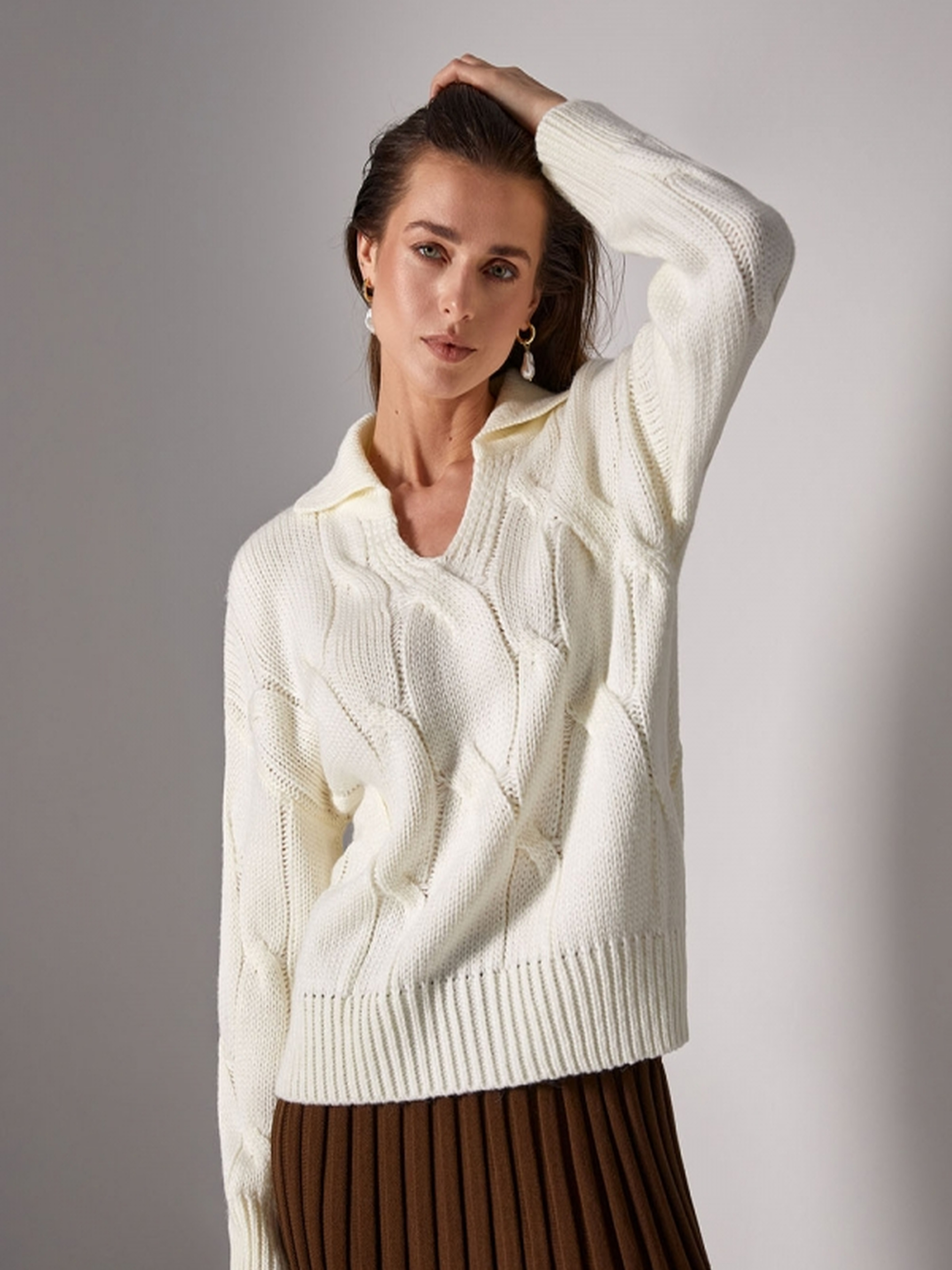 Цей стильний джемпер поло виконаний з ніжної напіввовняної пряжі в актуальній кольоровій гамі, що надає йому елегантності та комфорту. Завдяки фактурному переплетенню "коси" та середній товщині матеріалу, він ідеальний для прохолодної погоди. Джемпер має комфортний об'єм, спущений рукав на манжеті та стильну горловину-поло, що додає виробу вишуканості та універсальності. Особливості:• Матеріал: ніжна напіввовняна пряжа, середньої товщини.• Переплетення: фактурне "коса", що додає текстури.• Довжина: близько 58-59 см (+- 2 см).• Ширина під проймою та у талії в спокійному нерозтягнутому стані: 53-58 см, в розтягнутому стані: 58-63 см.• Ширина по низу в спокійному нерозтягнутому стані: 44-46 см, в розтягнутому стані: 54-56 см.• Довжина рукава: 47-46 см.• Ширина плеча: 20-22 см.• Висота коміру: 14 см.• Висота манжети: 9 см. Цей джемпер поло є відмінним варіантом для створення стильних та комфортних образів в холодну пору року.