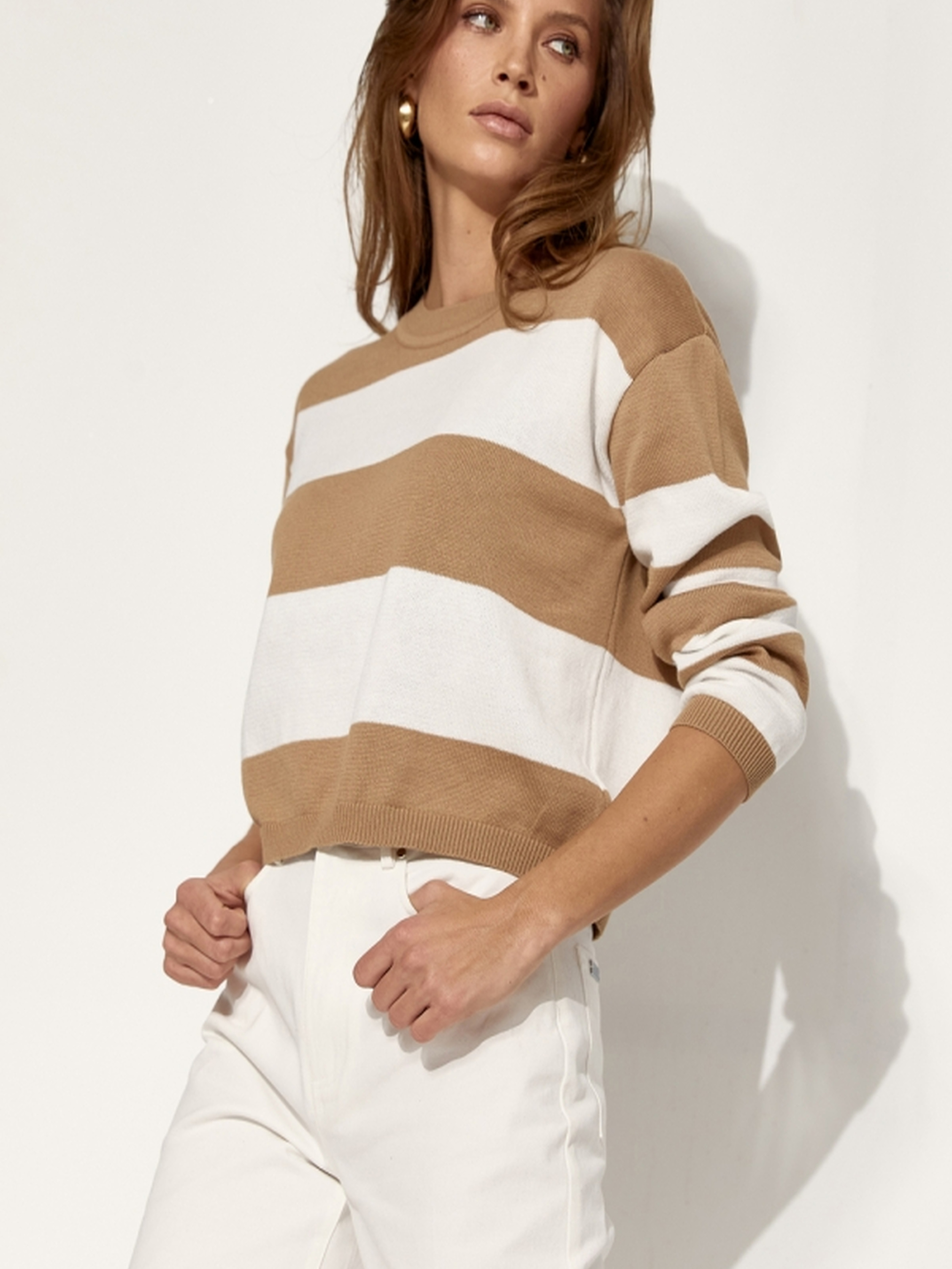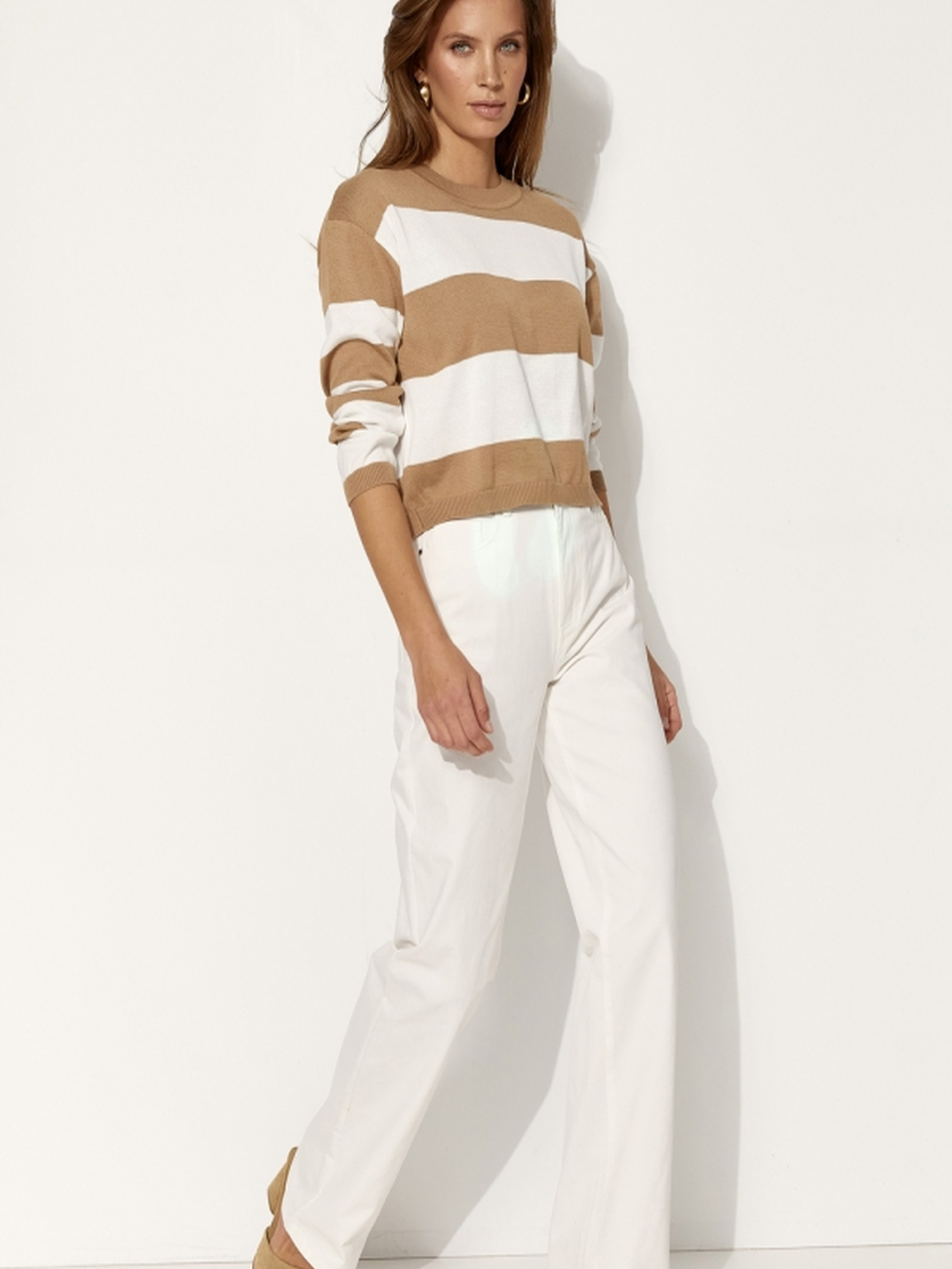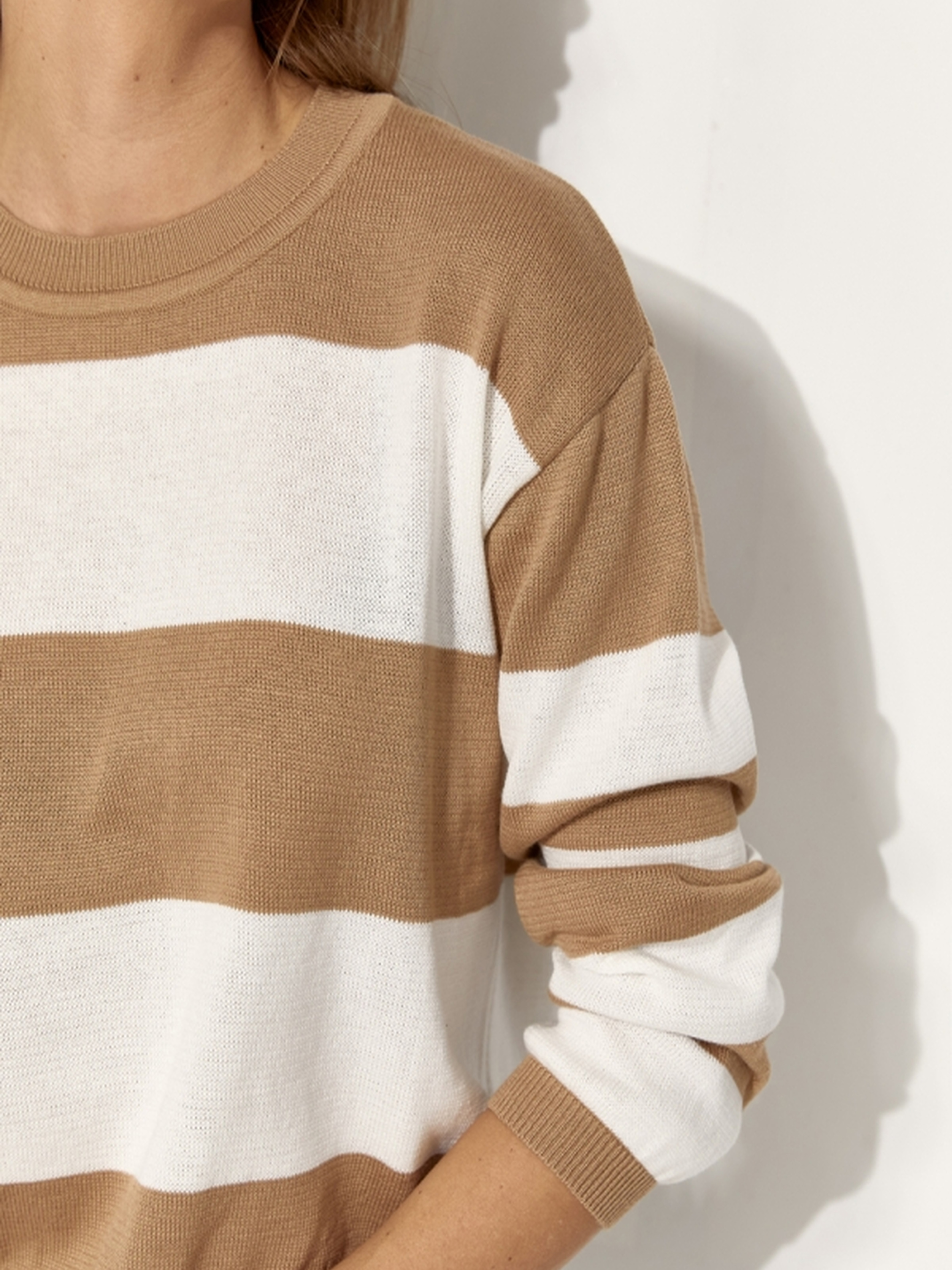 Базовий джемпер у смужкуЦей стильний джемпер у смужку виконаний з натуральної пряжі, що містить бавовну та віскозу, гарантуючи комфорт та м'якість. Вільний силует і спущена лінія плеча додають легкості та зручності. Ідеальний для створення як повсякденних, так і більш елегантних образів. Базова модель, що стане чудовим доповненням до будь-якого гардеробу. Довжина: 53-55 см (+- 2 см)Ширина в спокійному нерозтягнутому стані: 53-59 см, в розтягнутому стані 57-63 смДовжина рукава: 55-52 смШирина плеча: 15-18 смШирина рукава по низу: 9,5-10 см Ключові слова: базовий джемпер, джемпер у смужку, джемпер з бавовни та віскози, стильний джемпер, комфортний джемпер для жінок.