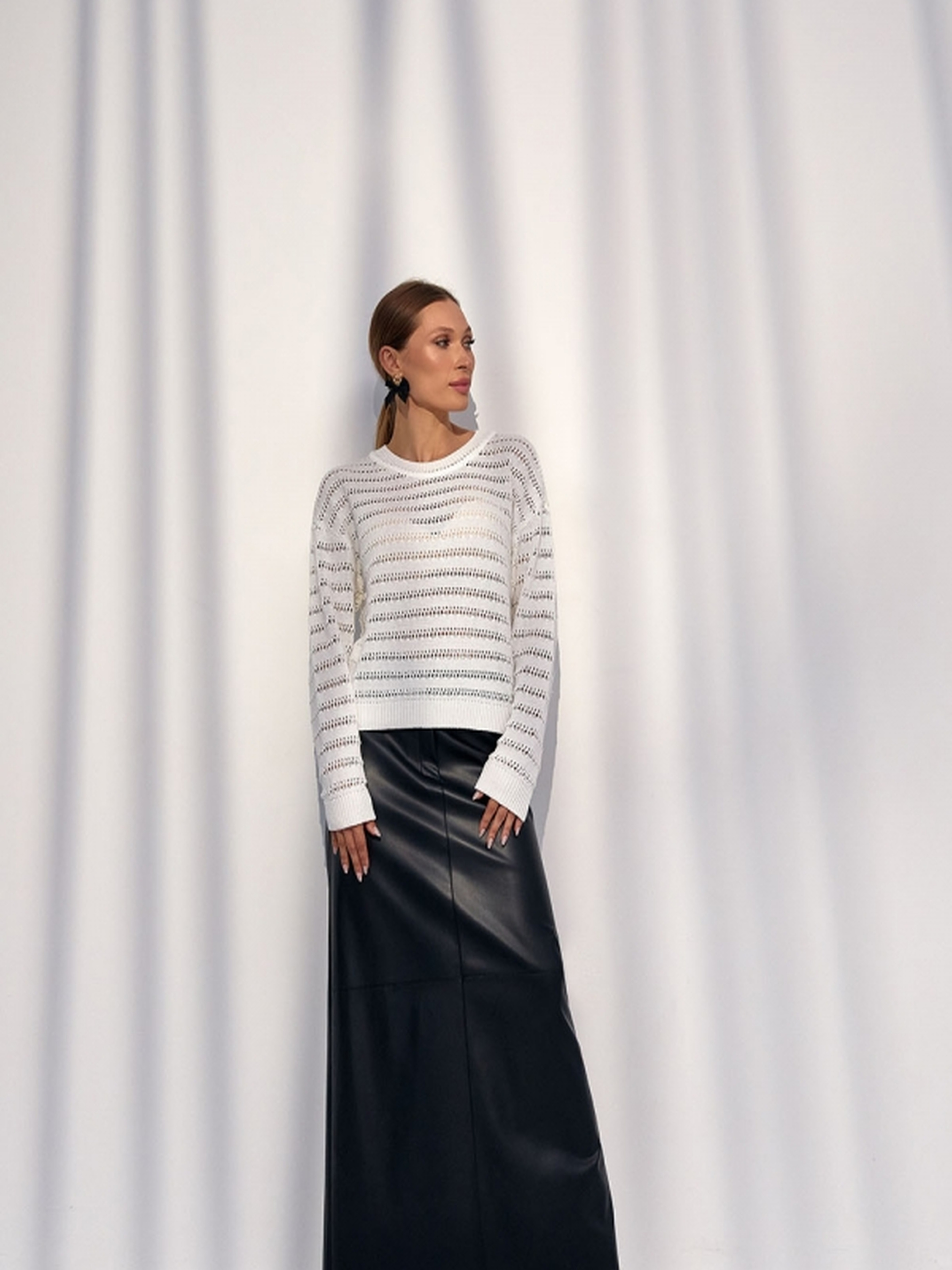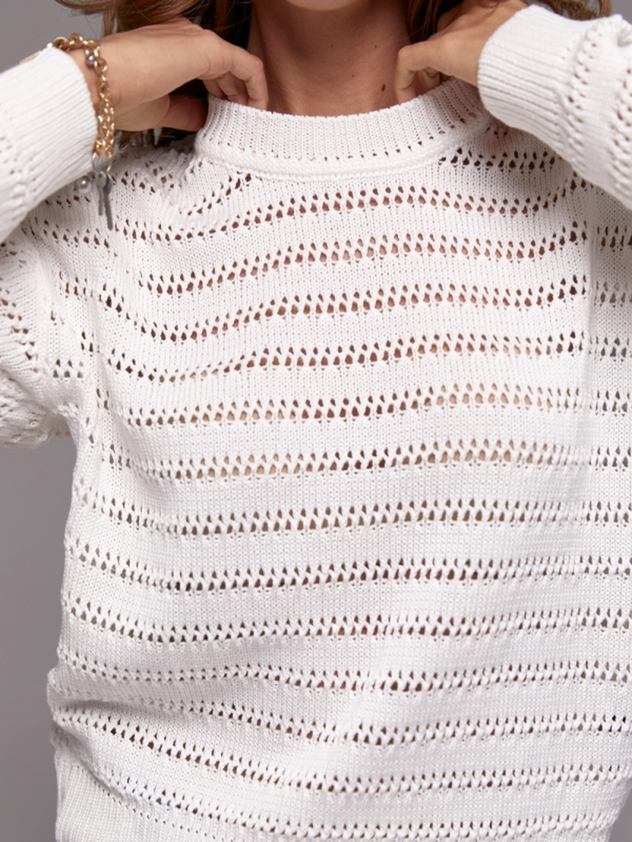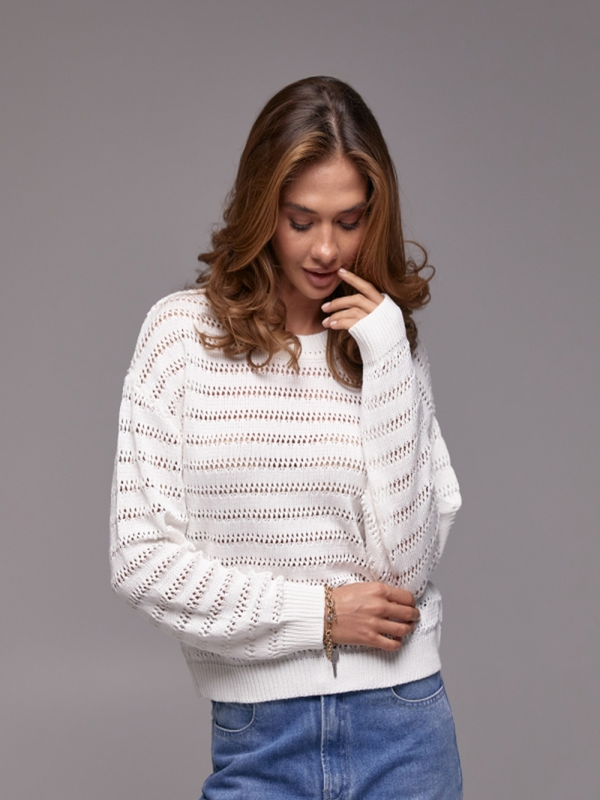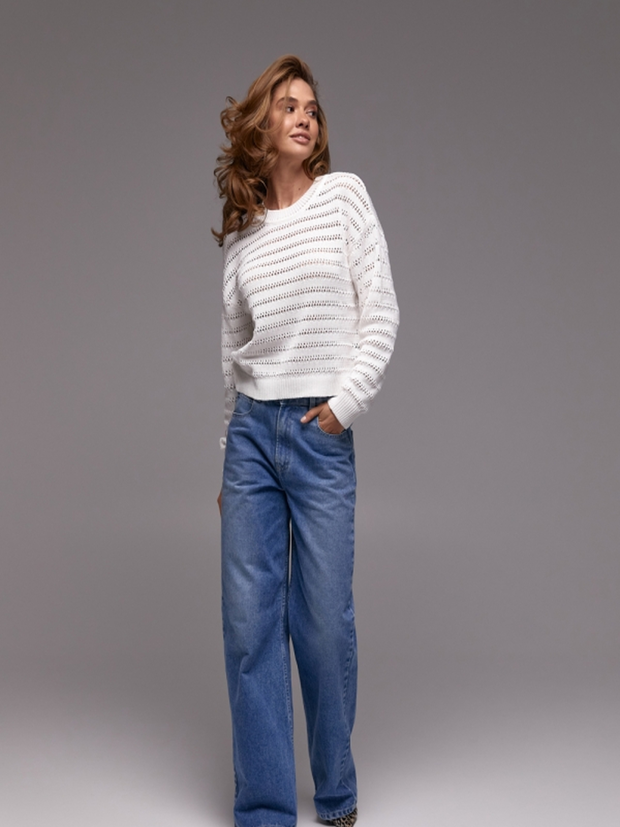 Ніжний джемпер з ажурними лініями – ваш вибір для легкості та комфорту! Додайте витонченості та легкості своєму гардеробу з нашим новим джемпером. Виготовлений з м'якої бавовняної пряжі, оздоблений ажурними горизонтальними лініями, він поєднує в собі комфорт та елегантний дизайн. Переваги: Бавовняна пряжа: м'яка, приємна до тіла, дозволяє шкірі дихати, забезпечує комфорт. Ажурні горизонтальні лінії: додають образу витонченості та оригінальності. Легкий оверсайз: забезпечує свободу рухів та розслаблений стиль. Зручні резинки: на манжетах, поясі та горловині, забезпечують ідеальну посадку. Універсальний дизайн: легко поєднується з будь-яким одягом, від джинсів до спідниць. Характеристики: Матеріал: бавовняна пряжа Дизайн: ажурні горизонтальні лінії Крій: легкий оверсайз Резинки: на манжетах, поясі та горловині Довжина: близько 56 см (+- 2 см) Ширина по проймі та у талії: 48-56 см (нерозтягнутий стан), 52-60 см (розтягнутий стан) Ширина по низу: 38-49 см (нерозтягнутий стан), 42-53 см (розтягнутий стан) Довжина рукава: 51-48 см Ширина плеча: 17-19 см Ширина рукава по низу: 8,5-10 см