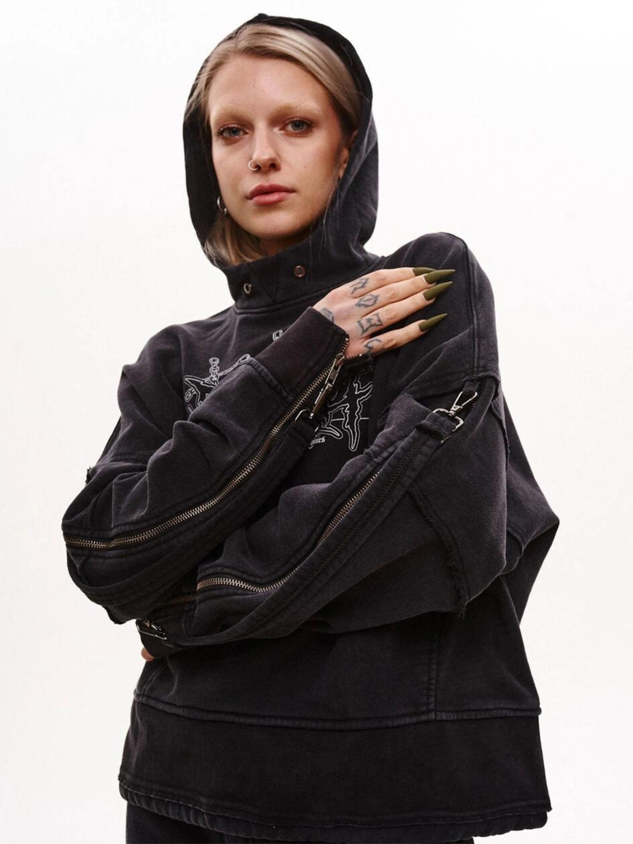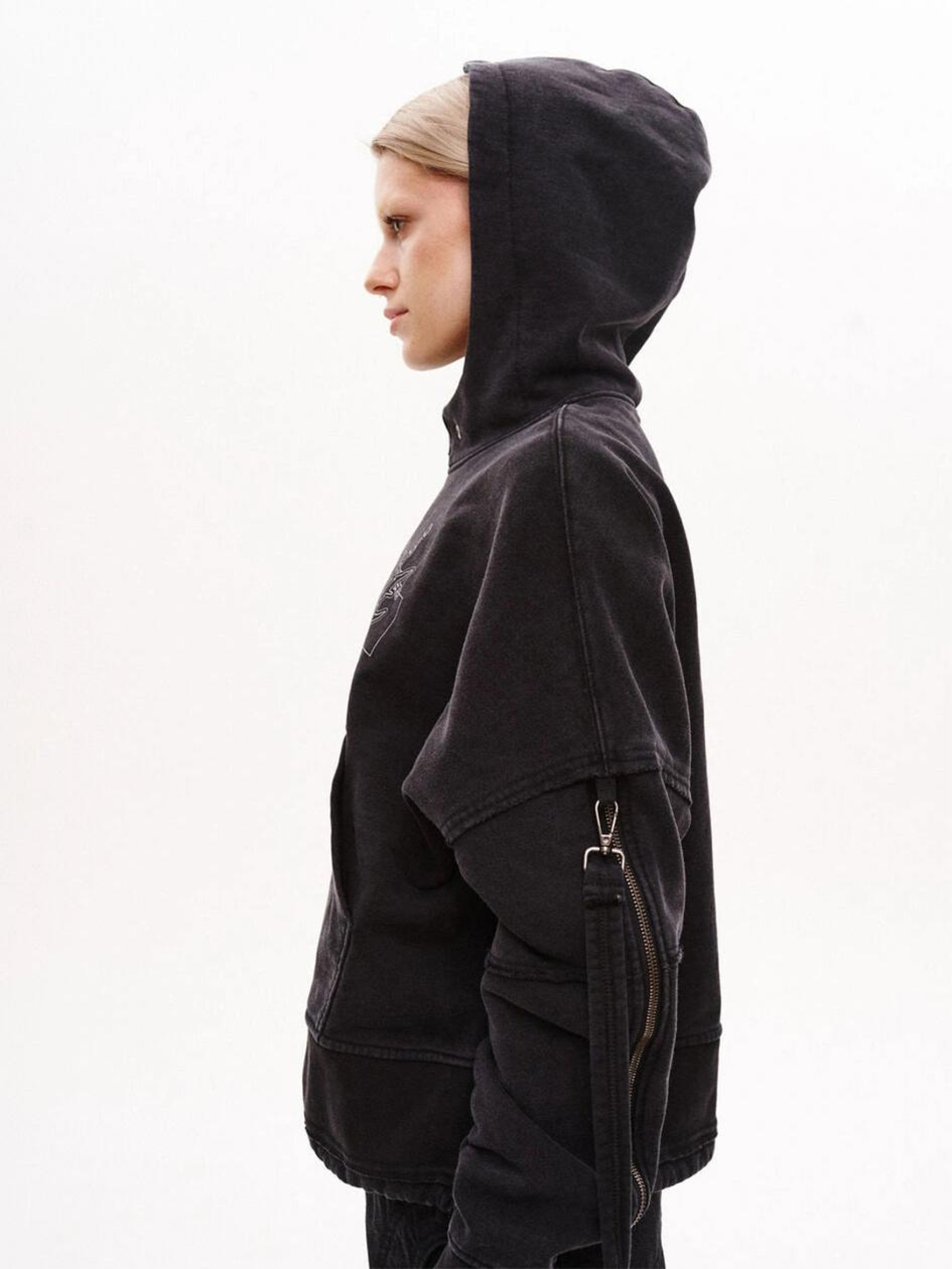 Состав ткани: 100% коттон. Особенности материалов и фурнитуры: Тринитка - плотная трикотажная ткань с высокой прочностью и износостойкостью. Плотность 500 г/м² обеспечивает надежность и комфорт, идеально подходит для изделий, требующих дополнительной защиты от холода или повреждений. Ключевые особенности модели: Оверсайз-худи выполнено из плотной тринитки с технологией промышленной стирки для достижения выцветшего цвета. Капюшон с одним швом, передняя часть имеет небольшую треугольную вставку из рибаны. По низу - пояс из двух частей рибаны, между которыми вставлен тоннель с круглой резинкой и зажимами в боковых швах. Пройма и горизонтальный рельеф рукава с открытыми срезами, металлическая молния от проймы до низа рукава с петлей для карабина. На передней части расположен карман-кенгуру для удобства ношения. Рекомендации по уходу: Машинная стирка при макс. 30 ºC Нельзя использовать отбеливатель Глажка при макс. 150 ºC Химчистка запрещена Можно сушить в сушилке при низкой температуре