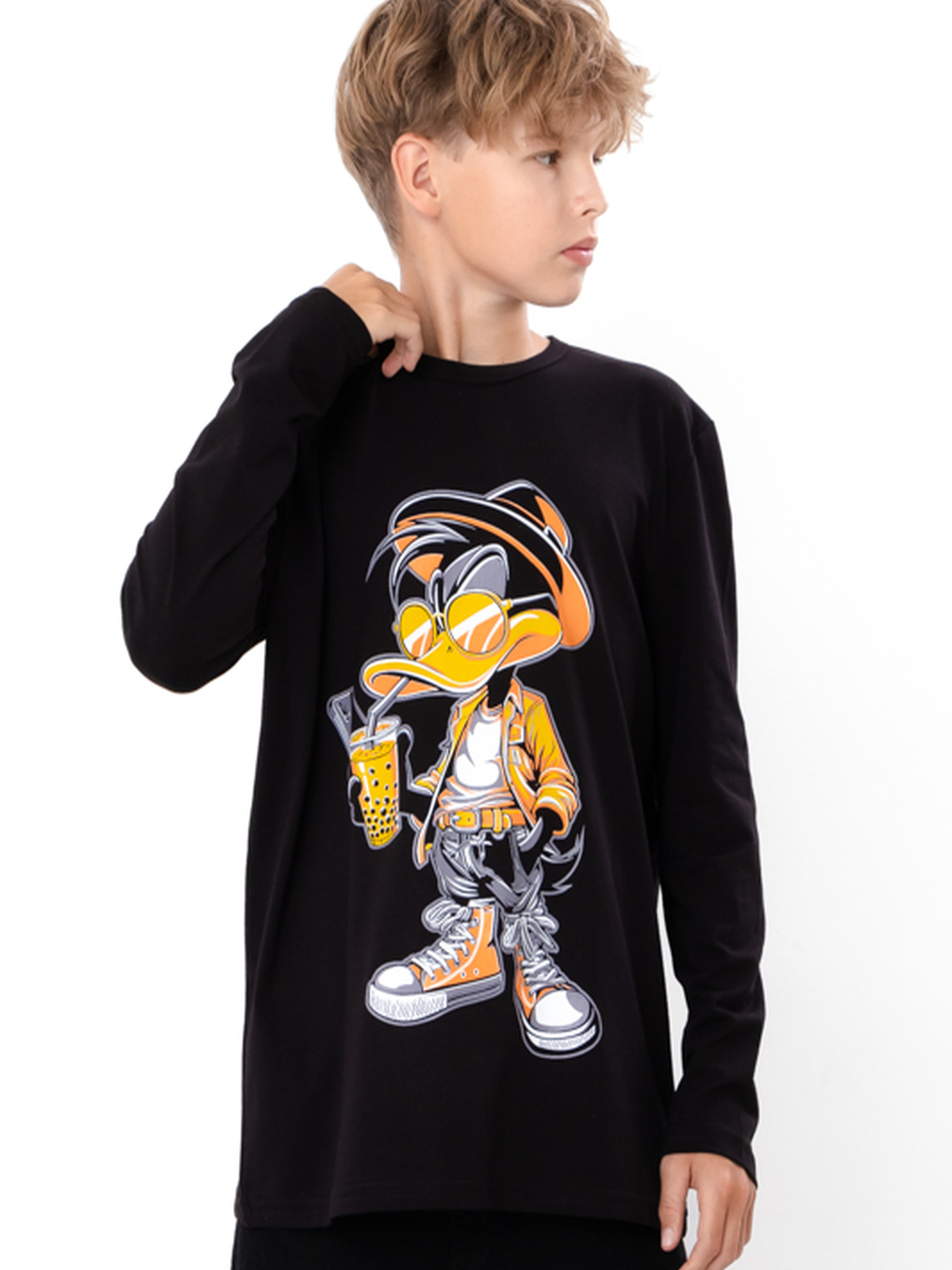 Полотно: фулікра однотонна Склад полотна: 95% бавовна, 5% лайкра Зріст: 140-170 Підлітковий джемпер для хлопчика з принтом Daffy Duck — стильна та комфортна річ для щоденного носіння. Виготовлений із м’якої фулікра, що поєднує бавовну та лайкру, джемпер добре тягнеться, не обмежує рухів та зберігає форму після прання. Прямий крій і довгий рукав роблять його універсальним для школи, прогулянок та активного відпочинку. Яскравий принт додає індивідуальності, роблячи образ сучасним і модним. Модель легко комбінується з джинсами, спортивними штанами чи брюками та будь-яким взуттям, створюючи стильні та практичні образи для підлітків.