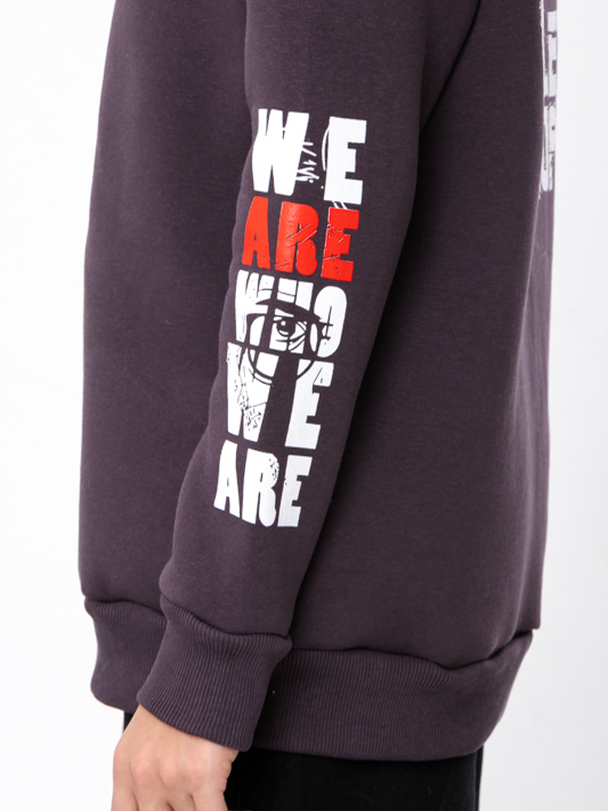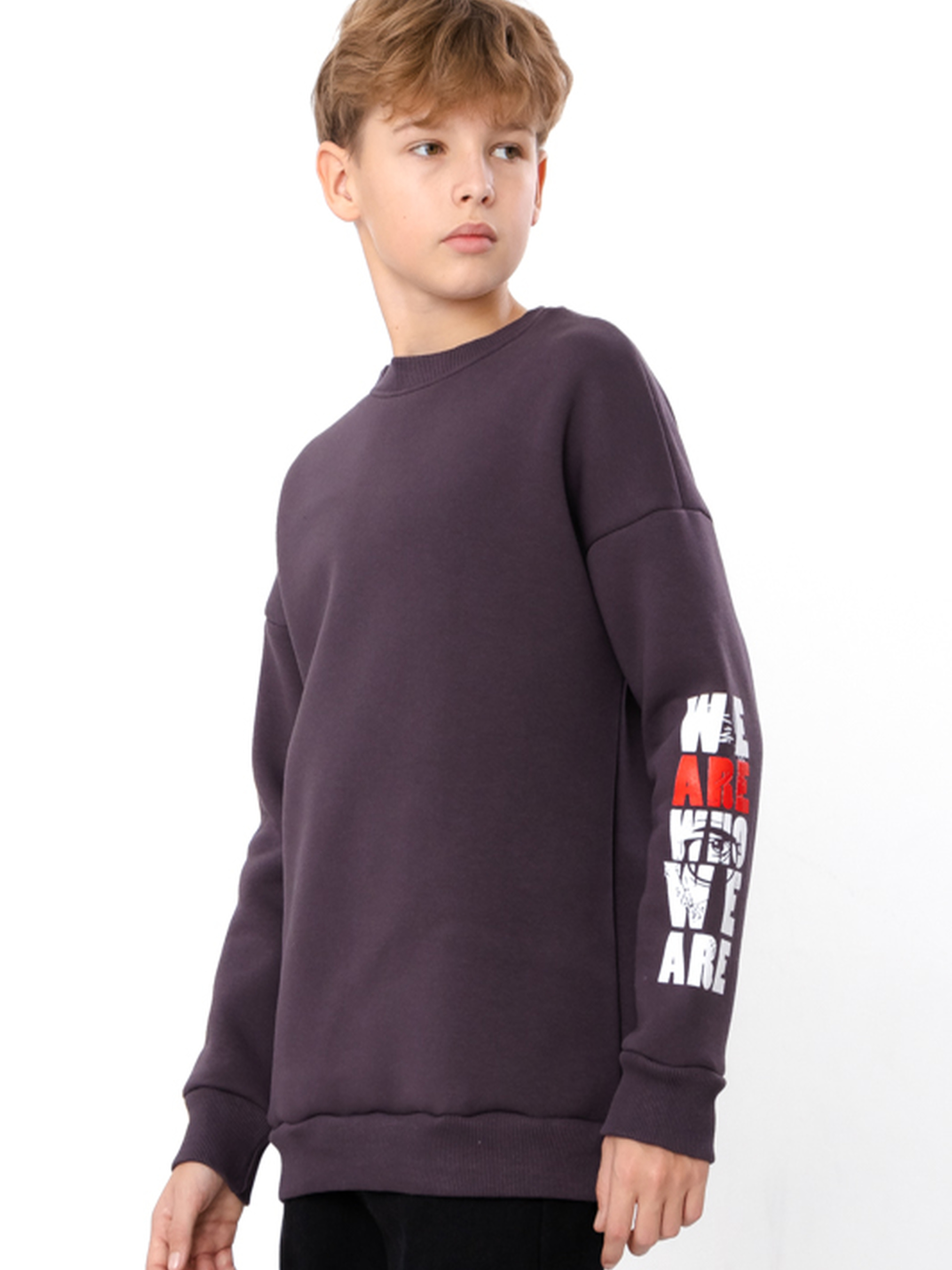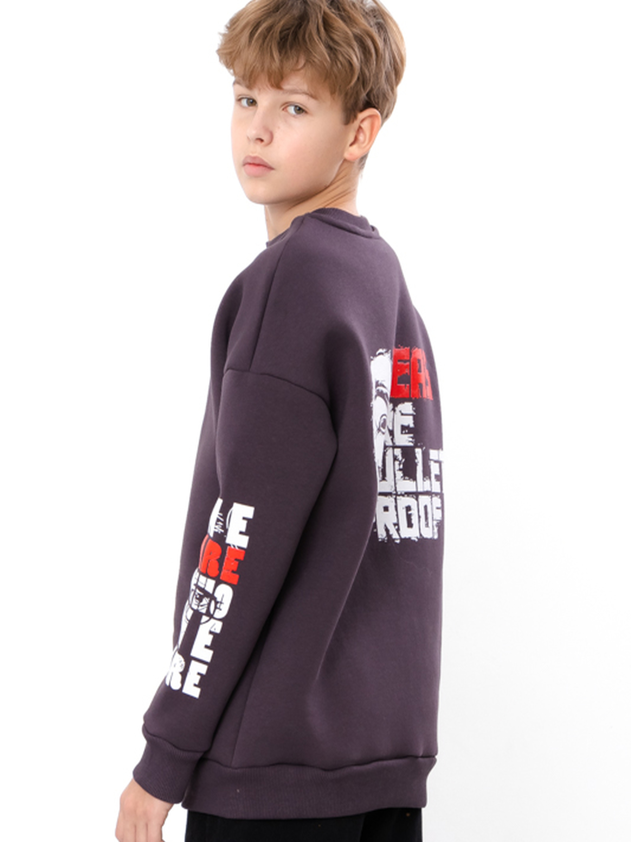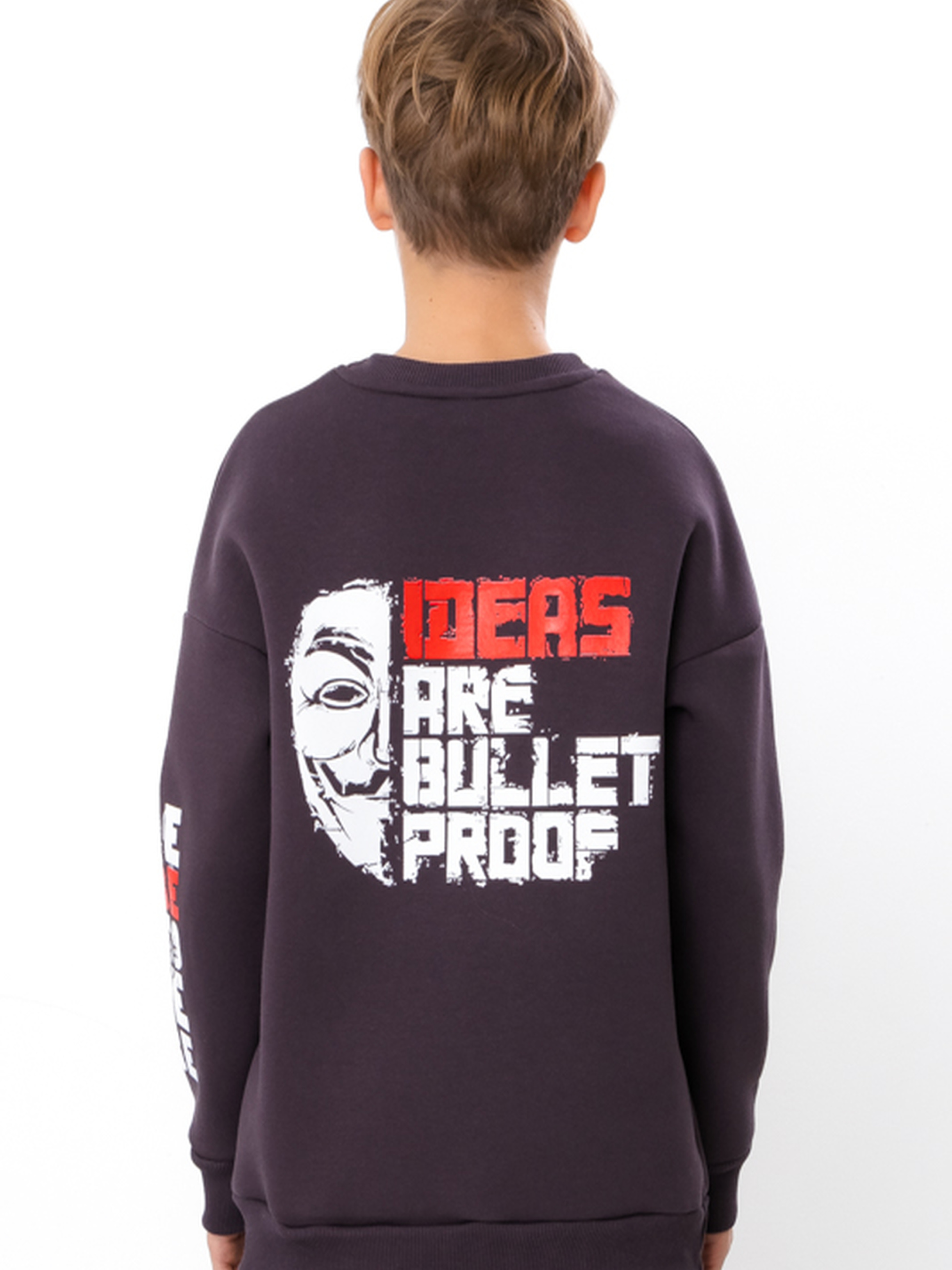 Полотно: трьохнитка однотонна Склад полотна: 80% бавовна, 20% поліестер Зріст: 140-170 Теплий світшот для хлопчика оверсайз крою з принтом IDEAS ARE BULLETPROOF це затишок і стиль в одному. Виготовлений з міцної трьохнитки однотонної що забезпечує тепло і комфорт у прохолодну погоду. Склад полотна вісімдесят відсотків бавовна двадцять відсотків поліестер. Оверсайз крій та довгий рукав роблять його зручним для активних дітей. Модель має трикотажну гумку на рукавах і по низу світшота. Стильний принт стійкий до прання високих температур і розтягування. Це світшот для хлопчика стане відмінним доповненням демісезонного гардеробу та чудовим вибором для молодих модників.
