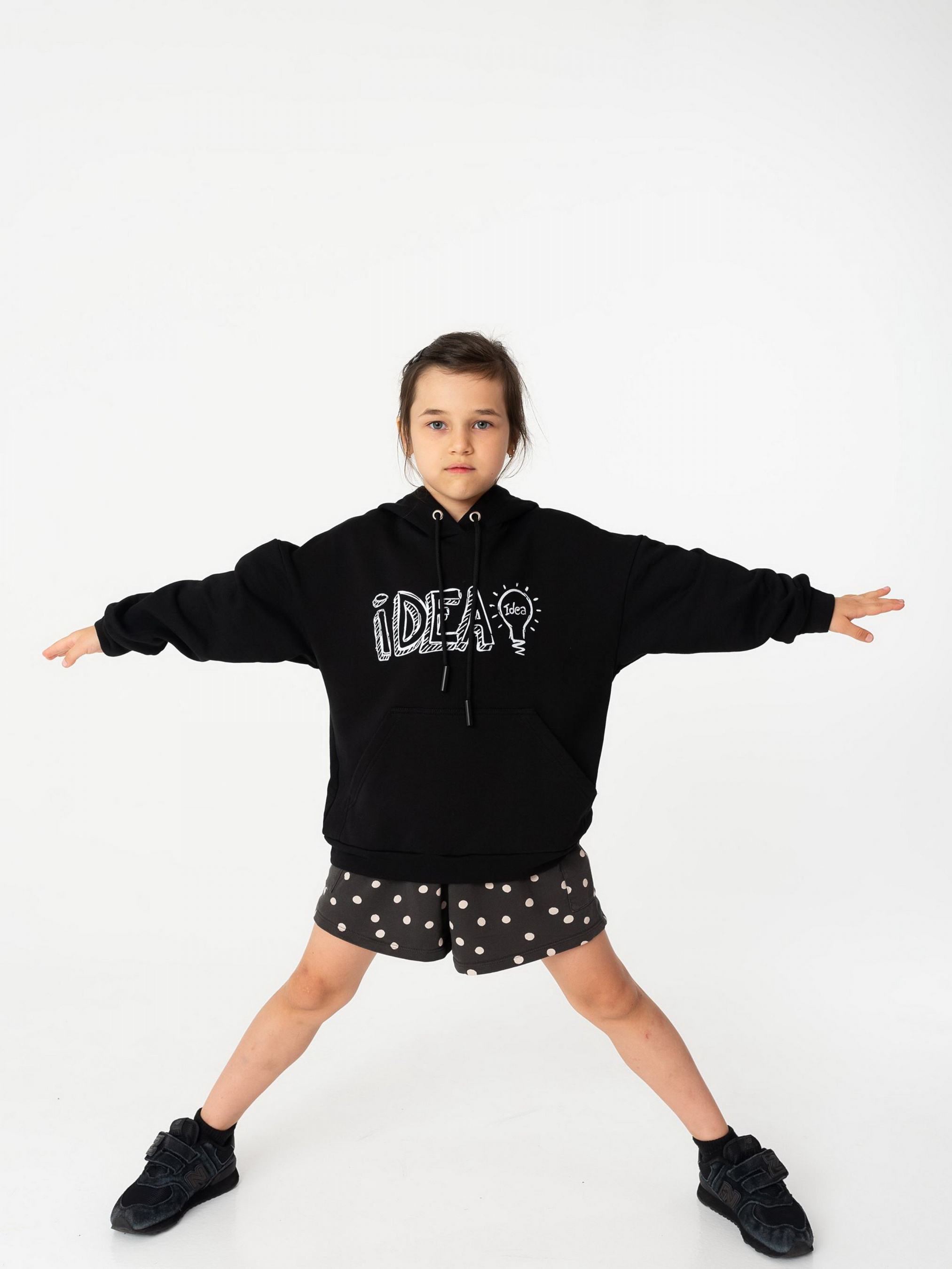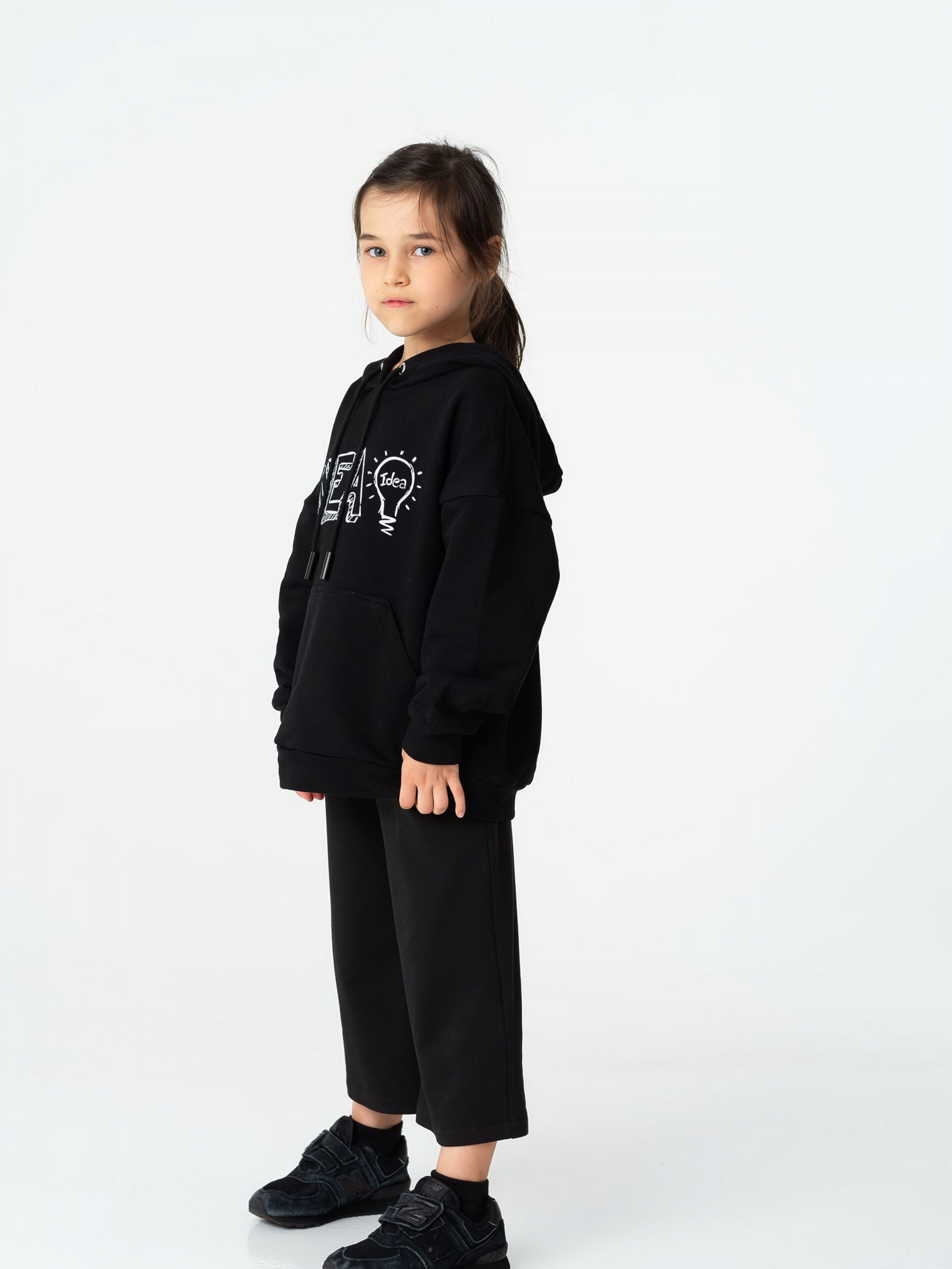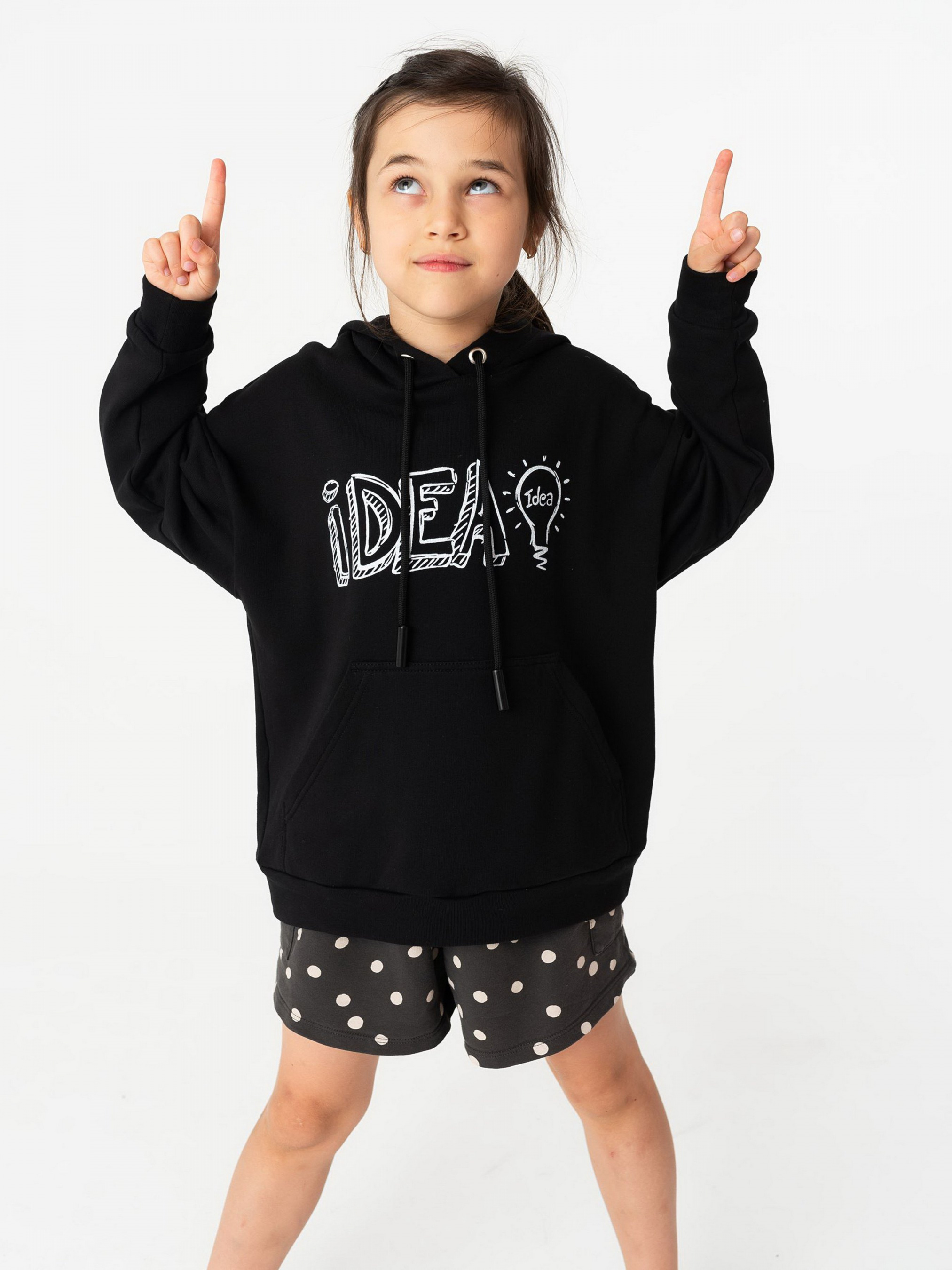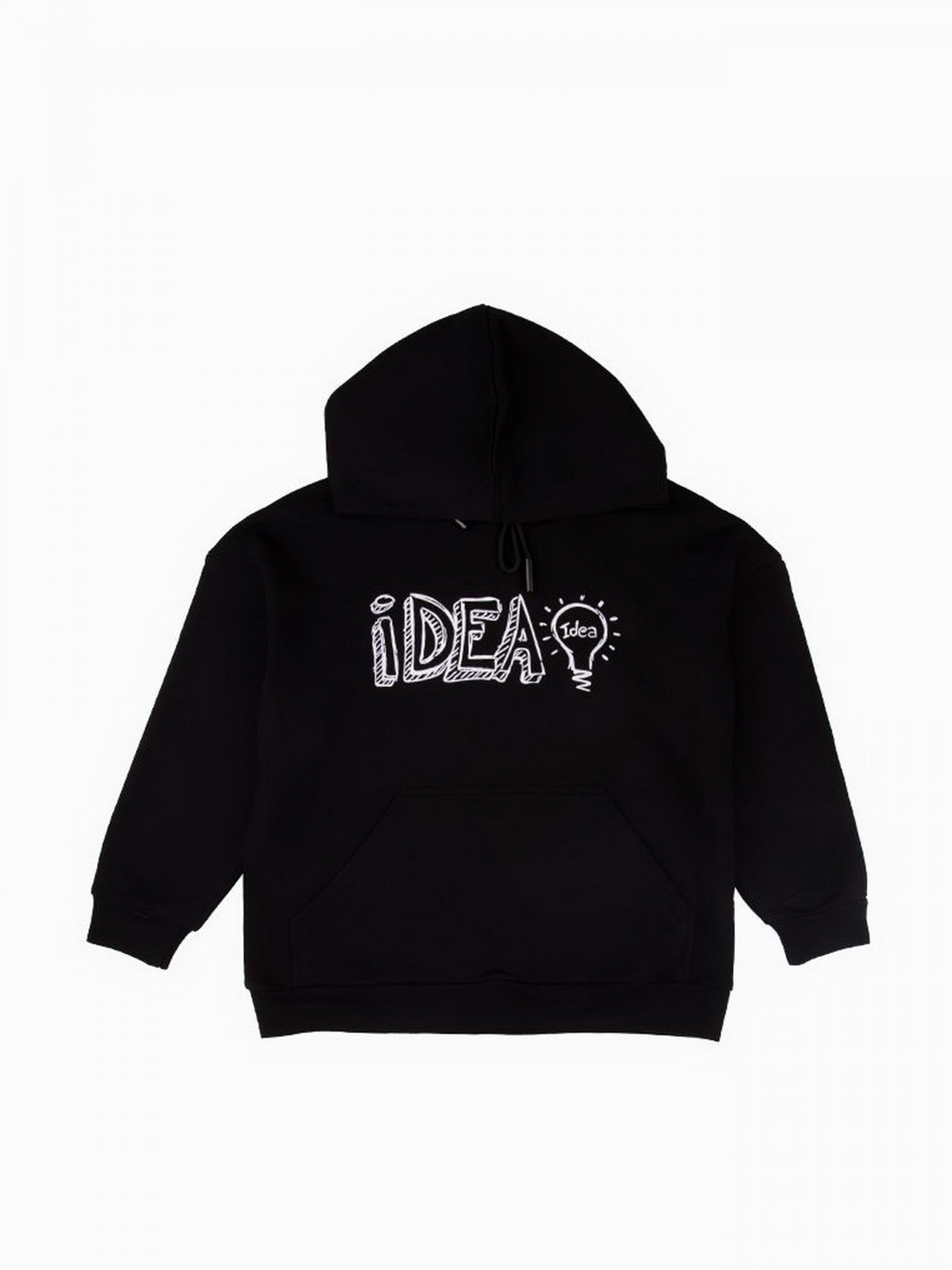 Детали изделия: Цвет худи - черный. Заниженная линия плеча. Глубокий капюшон со шнурками. На груди белый принт IDEA. По низу изделия и на рукавах манжеты. Спереди карман-кенгуру. Покрой - оверсайз. Ткань - трехнитка. Сезон: весна-осень.