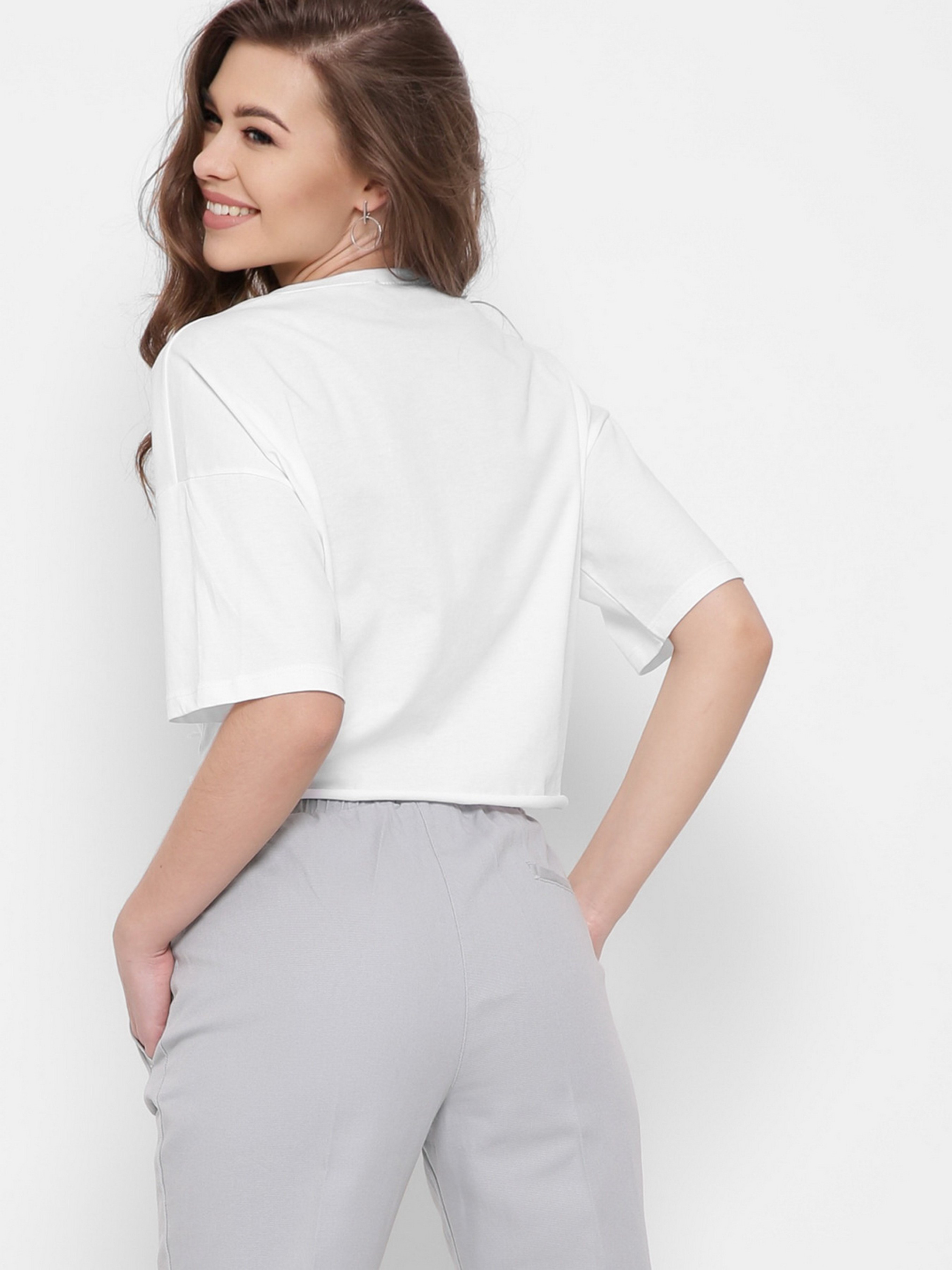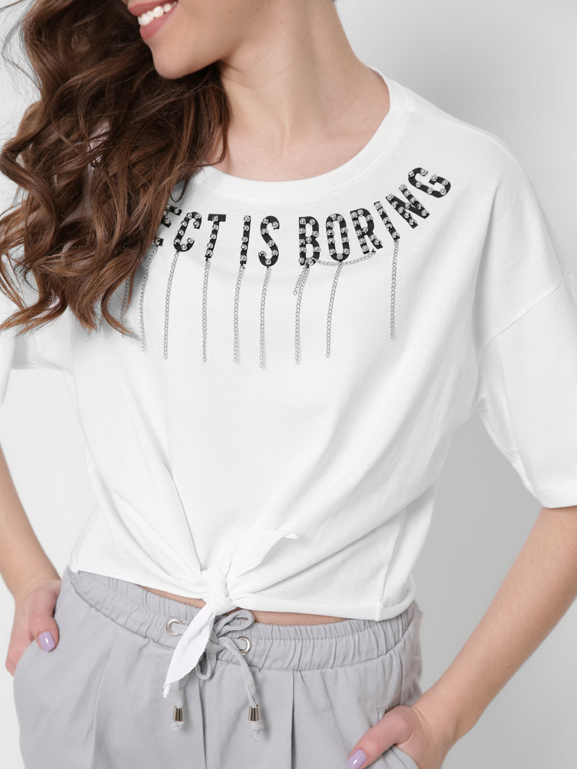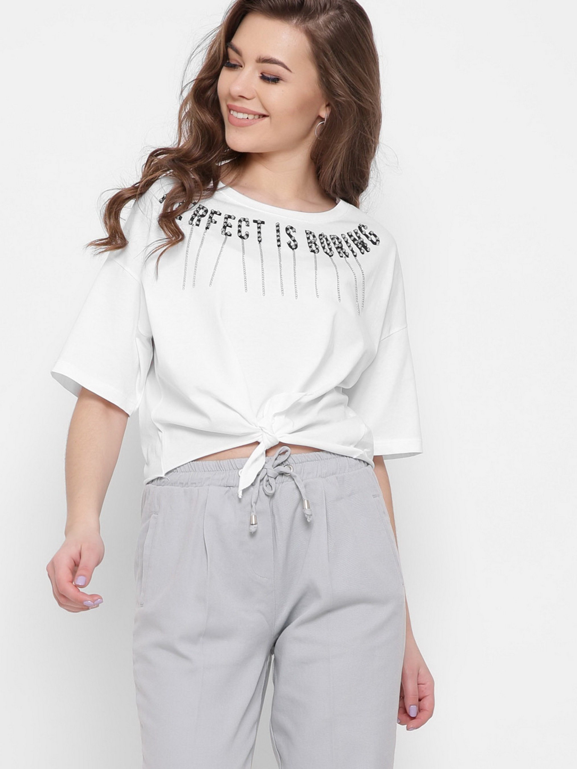Стильная футболка из мягкого и приятного к телу материала. Круглый вырез горловины, удлиненные рукава со спущенной линией плеча. Надпись на футболке декорирована бисером и висячим декором. Завязка спереди.