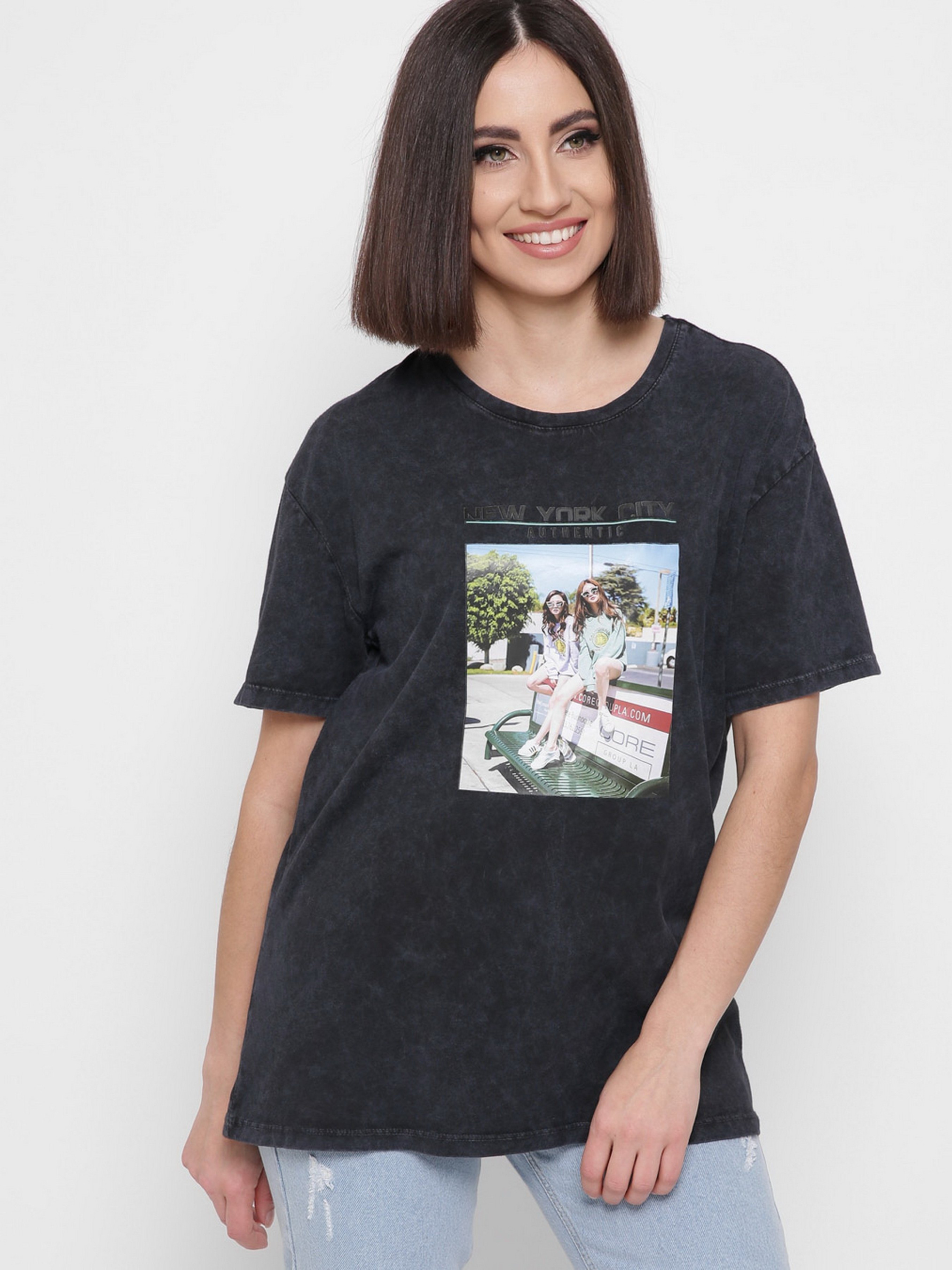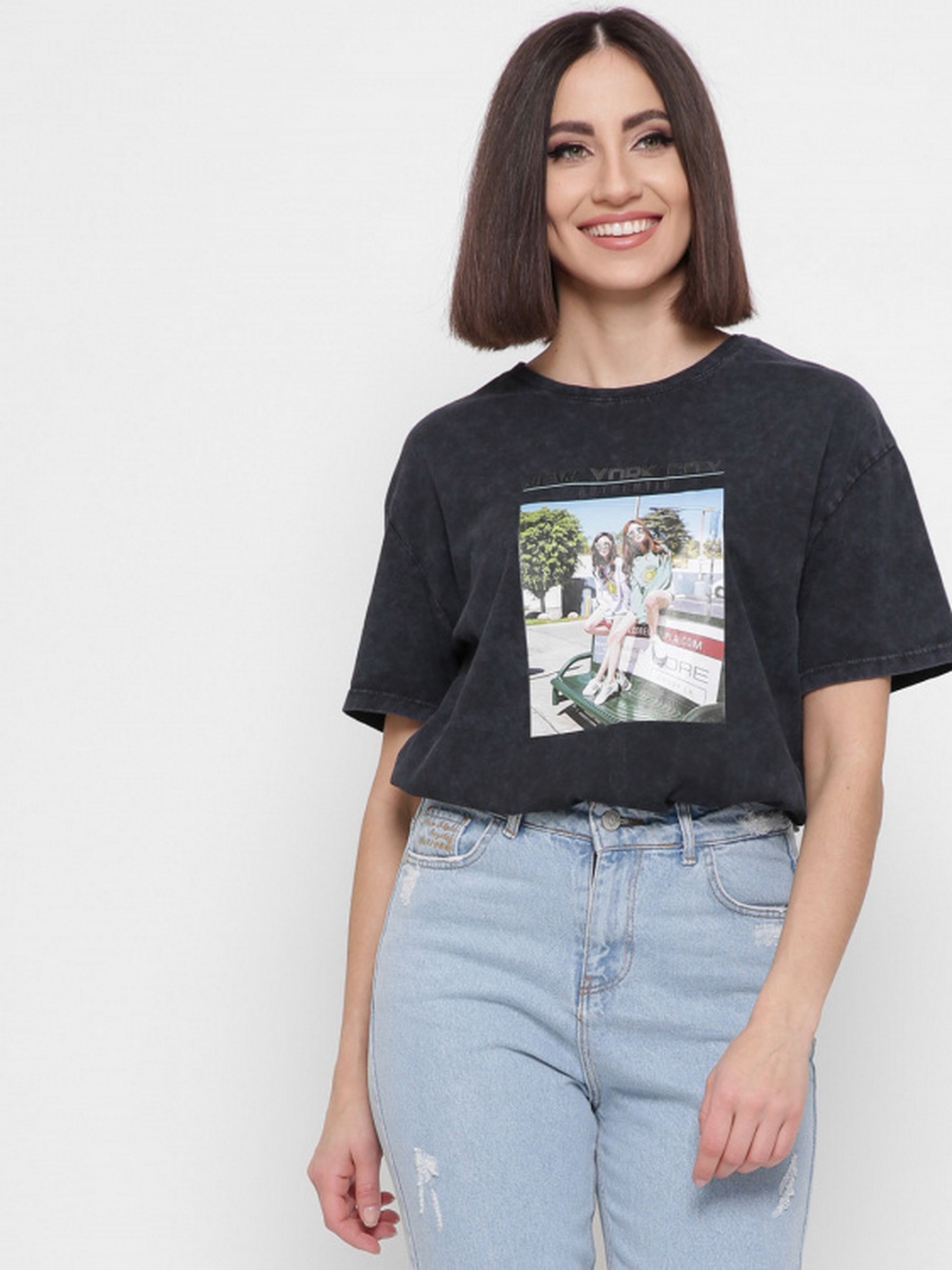 Стильная футболка свободного кроя. Изготовленная из мягкого и приятного к телу материала.Спущенная линия плеча на рукаве. Цветной принт на футболке будет выделять ее среди других.