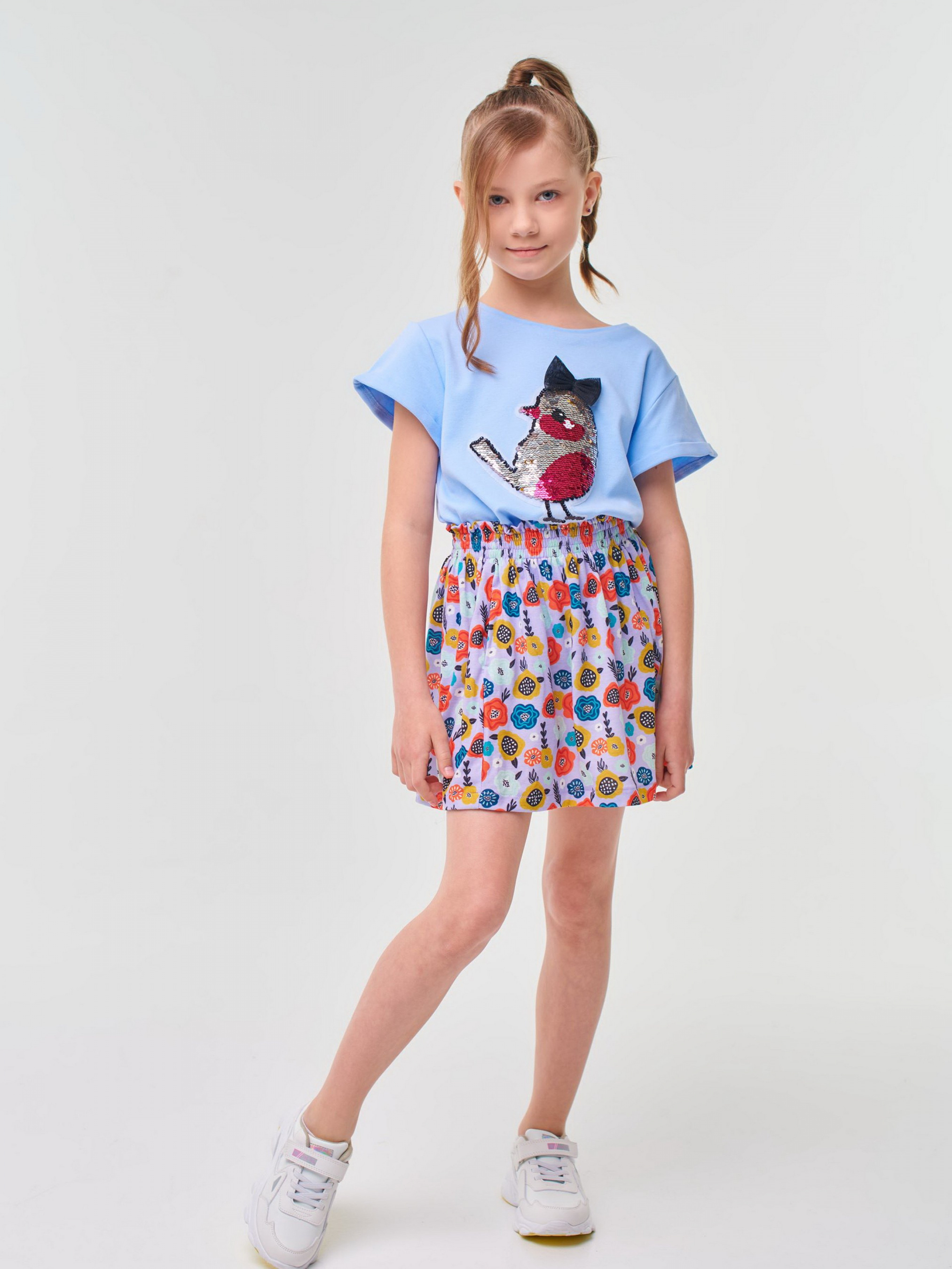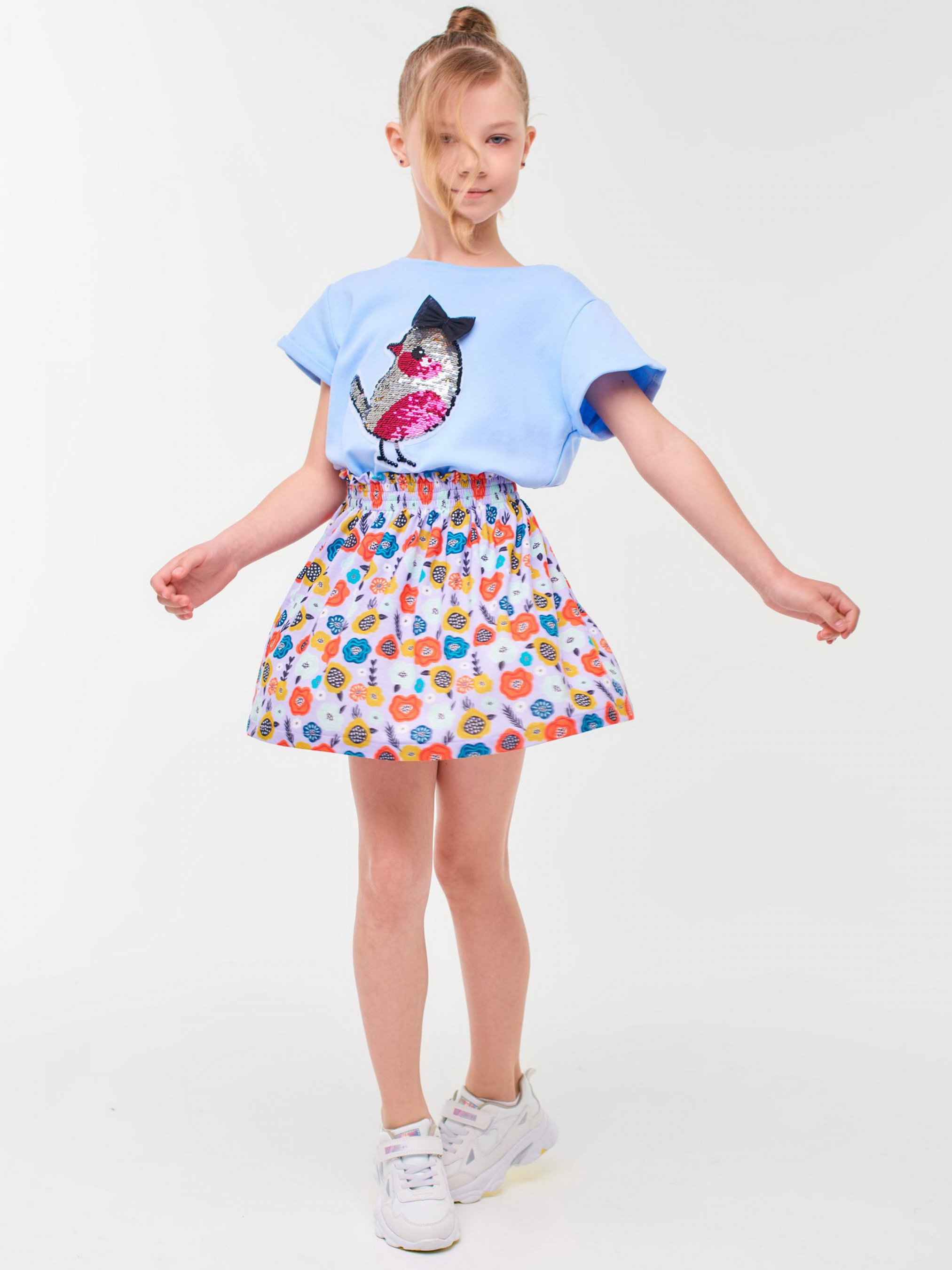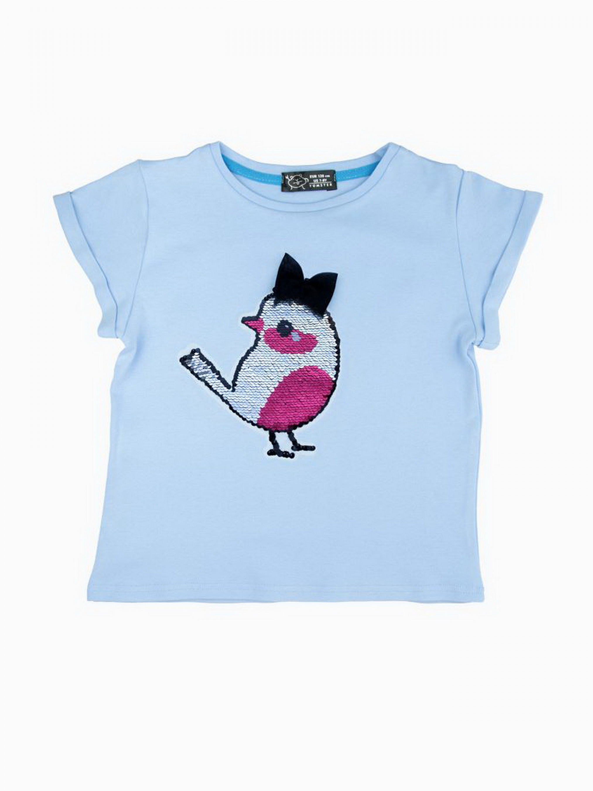 Детали модели: Футболка светло-голубого цвета. Круглая горловина. Рукава укороченные на манжетах. На груди аппликация - перевертыш из пайеток “Птичка”. Фасон футболки - прямой крой и укороченная длина. Ткань - интерлок.