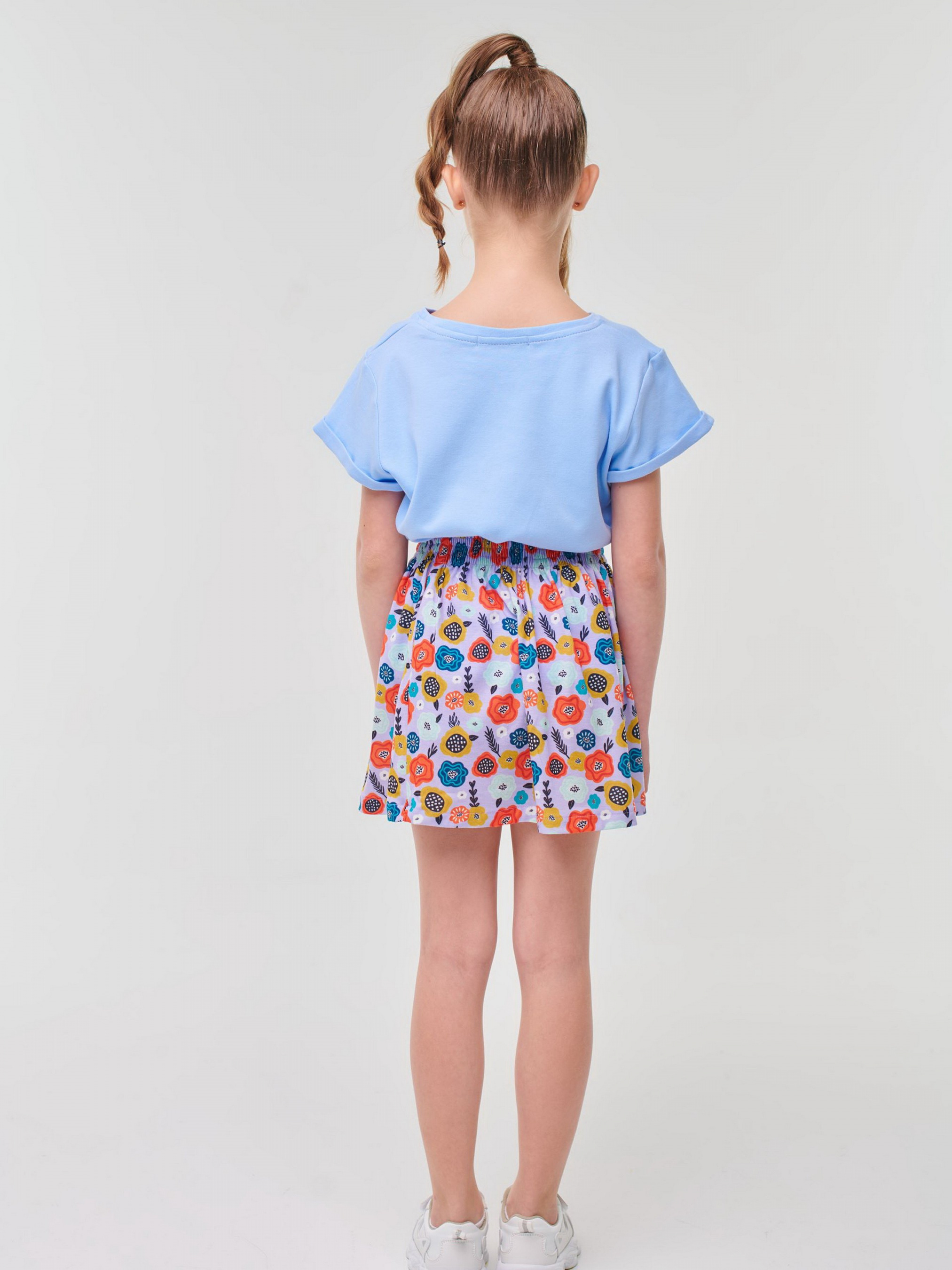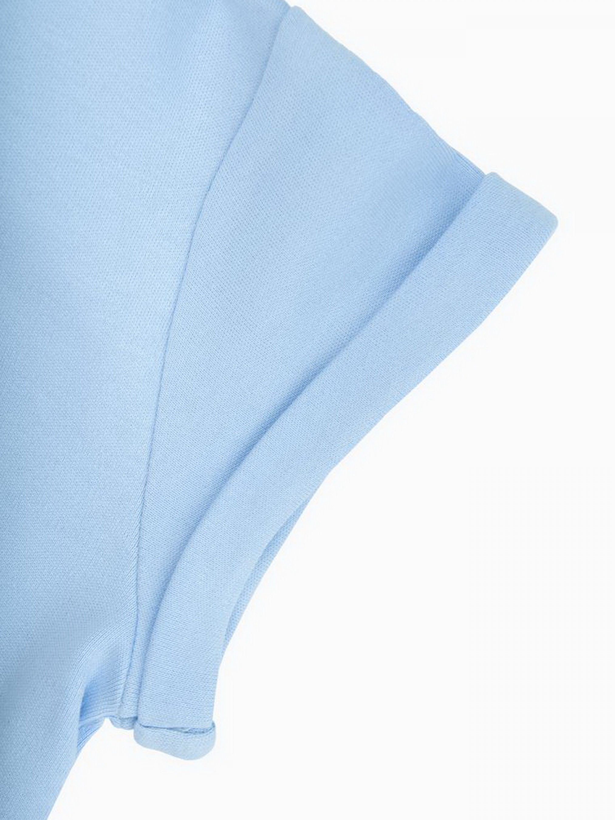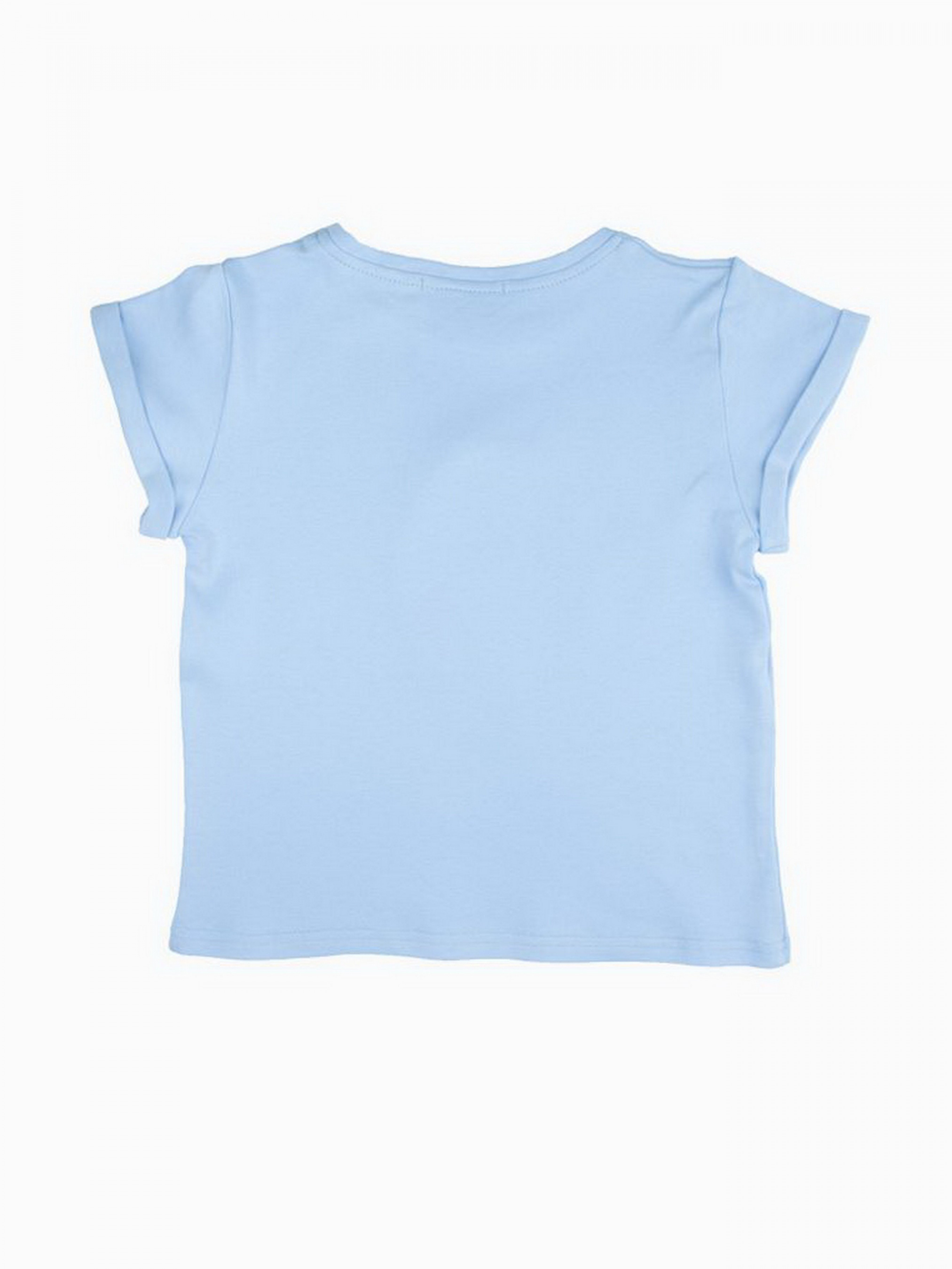 Детали модели: Футболка светло-голубого цвета. Круглая горловина. Рукава укороченные на манжетах. На груди аппликация - перевертыш из пайеток “Птичка”. Фасон футболки - прямой крой и укороченная длина. Ткань - интерлок.