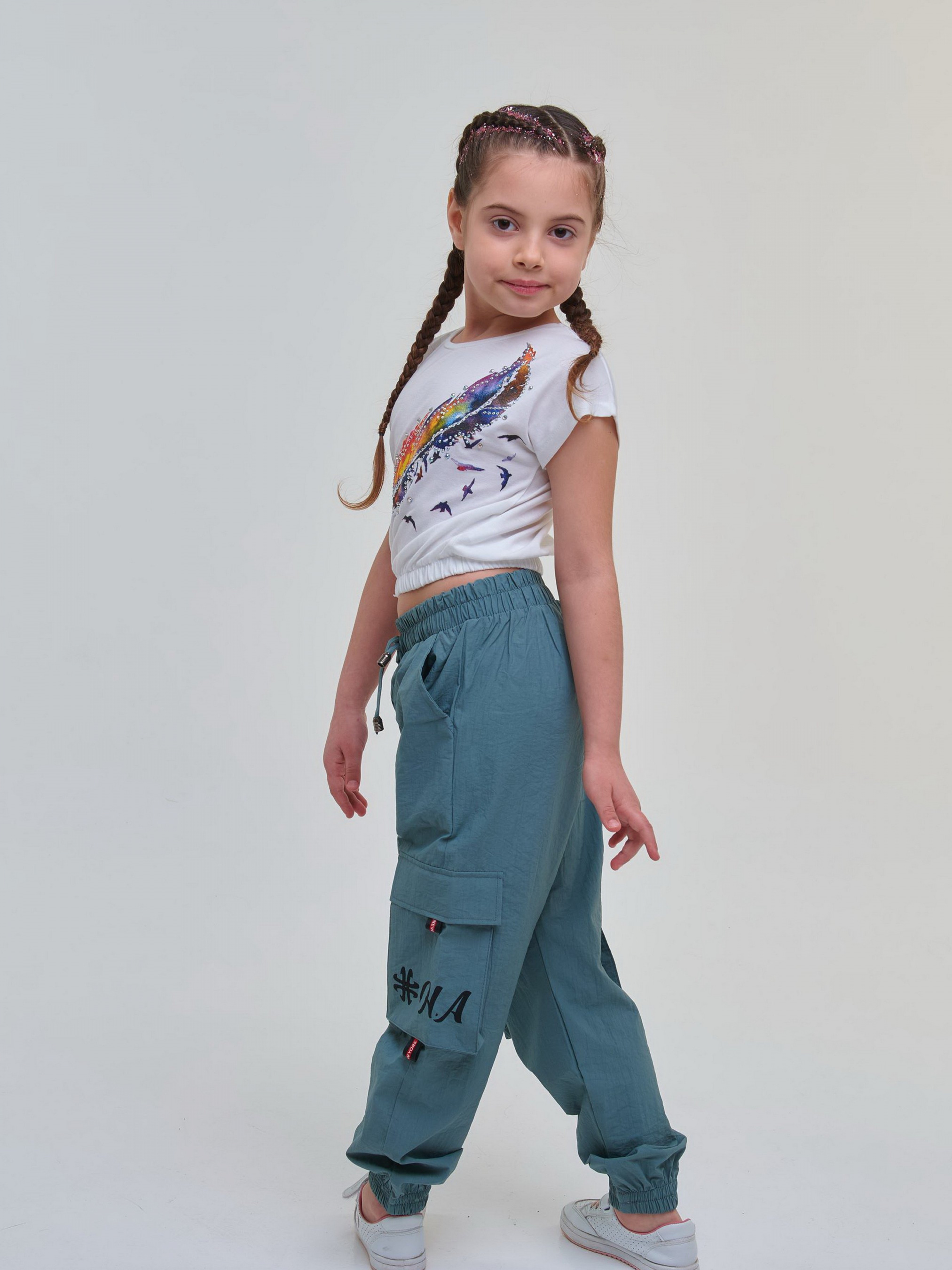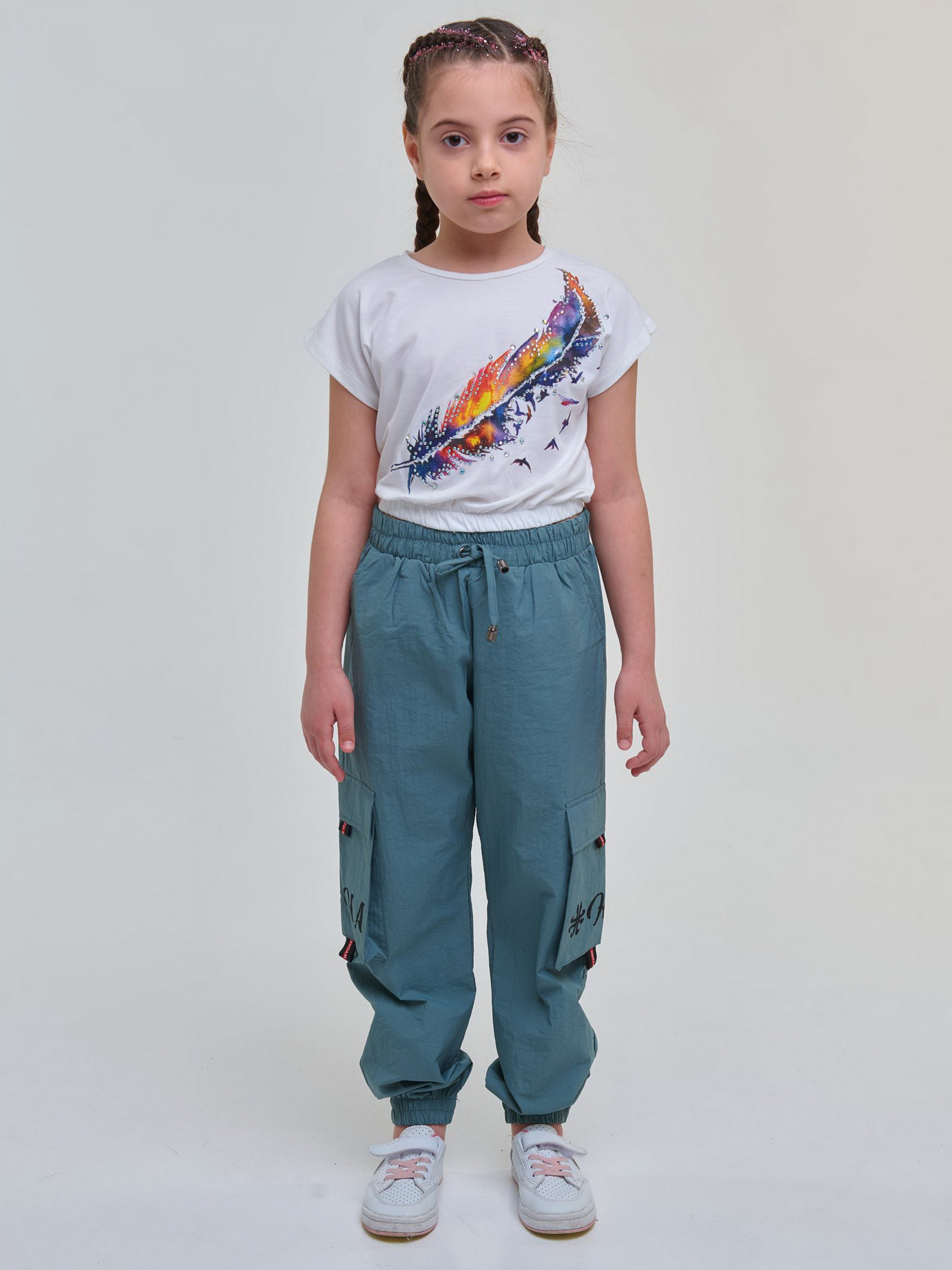 Трендовая, невероятно красивая футболка для девочек белого цвета. Такую вещь можно комбинировать с любыми штанами, шортами или юбкой. Для девочек на рост от 104 см до 164 см.