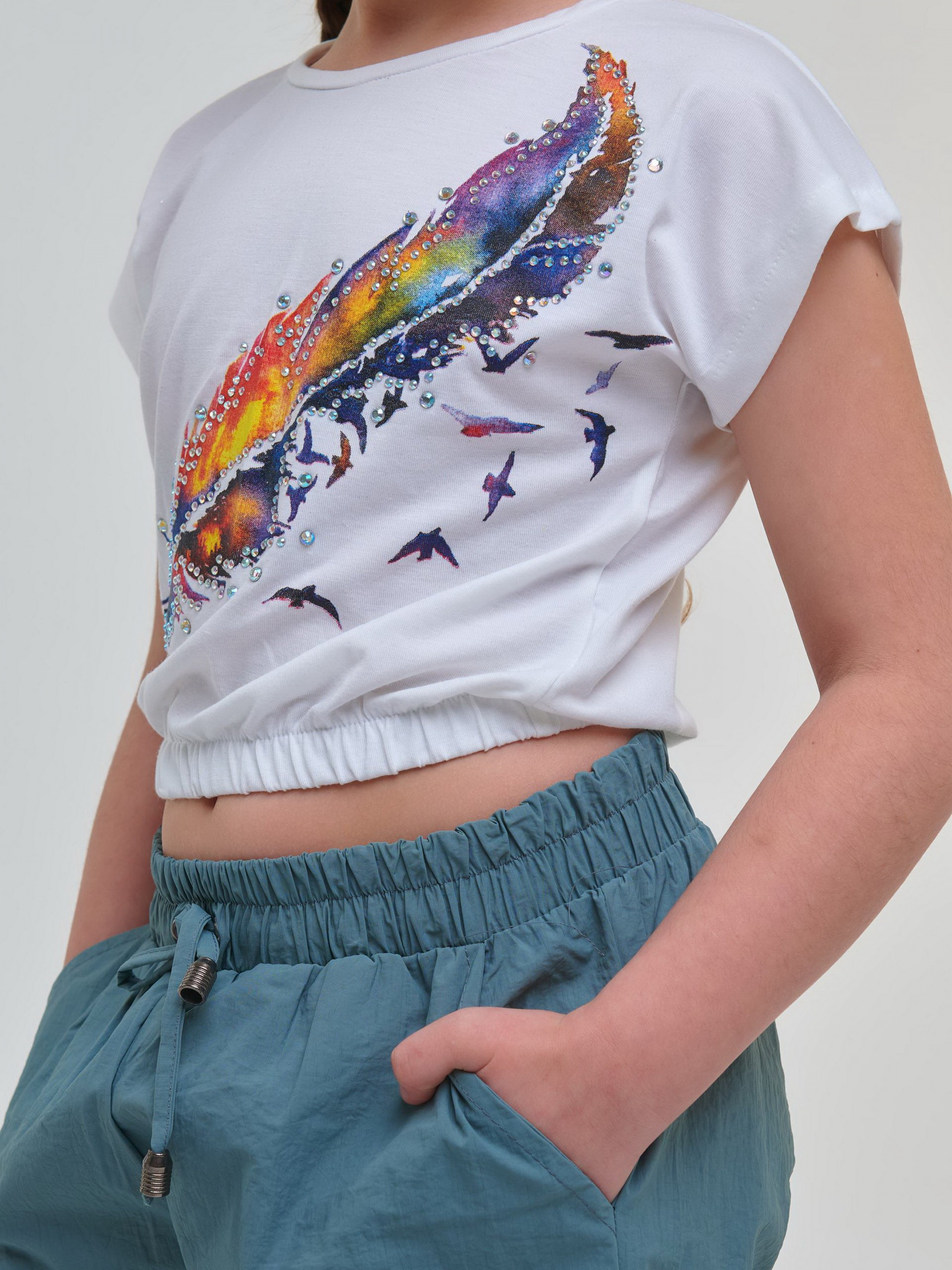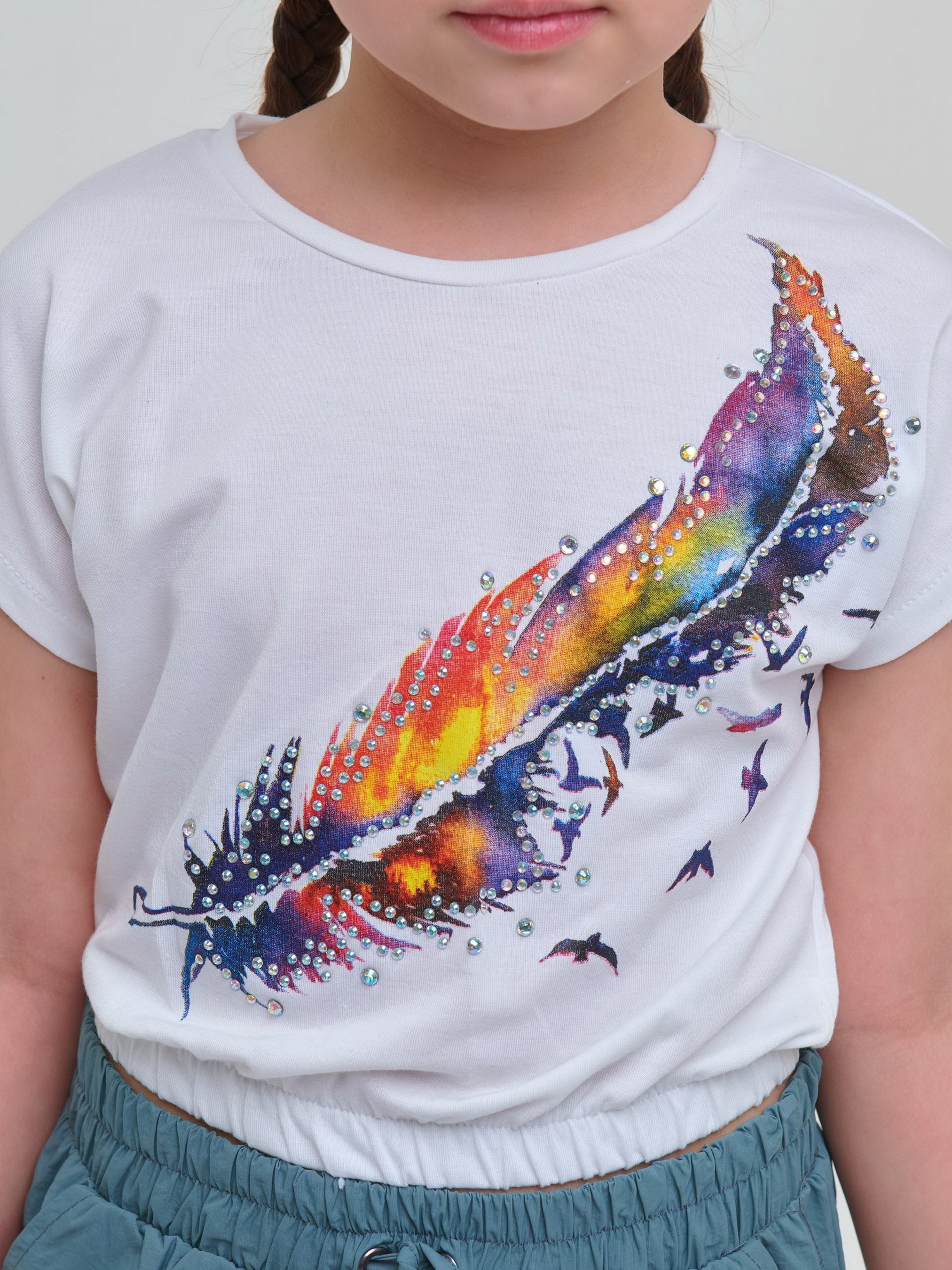 Детали: Футболка белого цвета с принтом "Цветное перо". Круглая горловина. Заниженная линия плечей. Короткий рукав. Укороченная модель на резинке снизу.