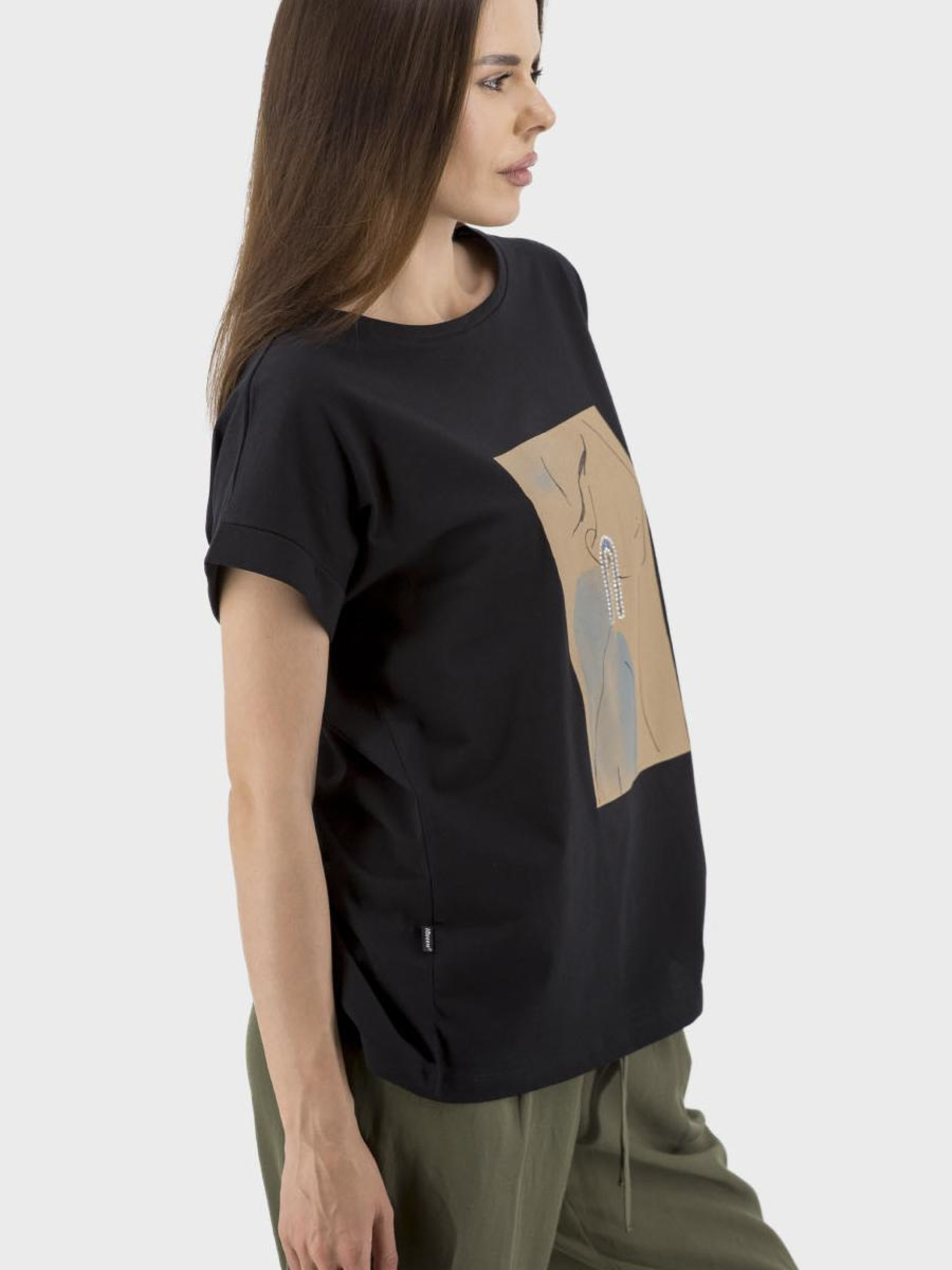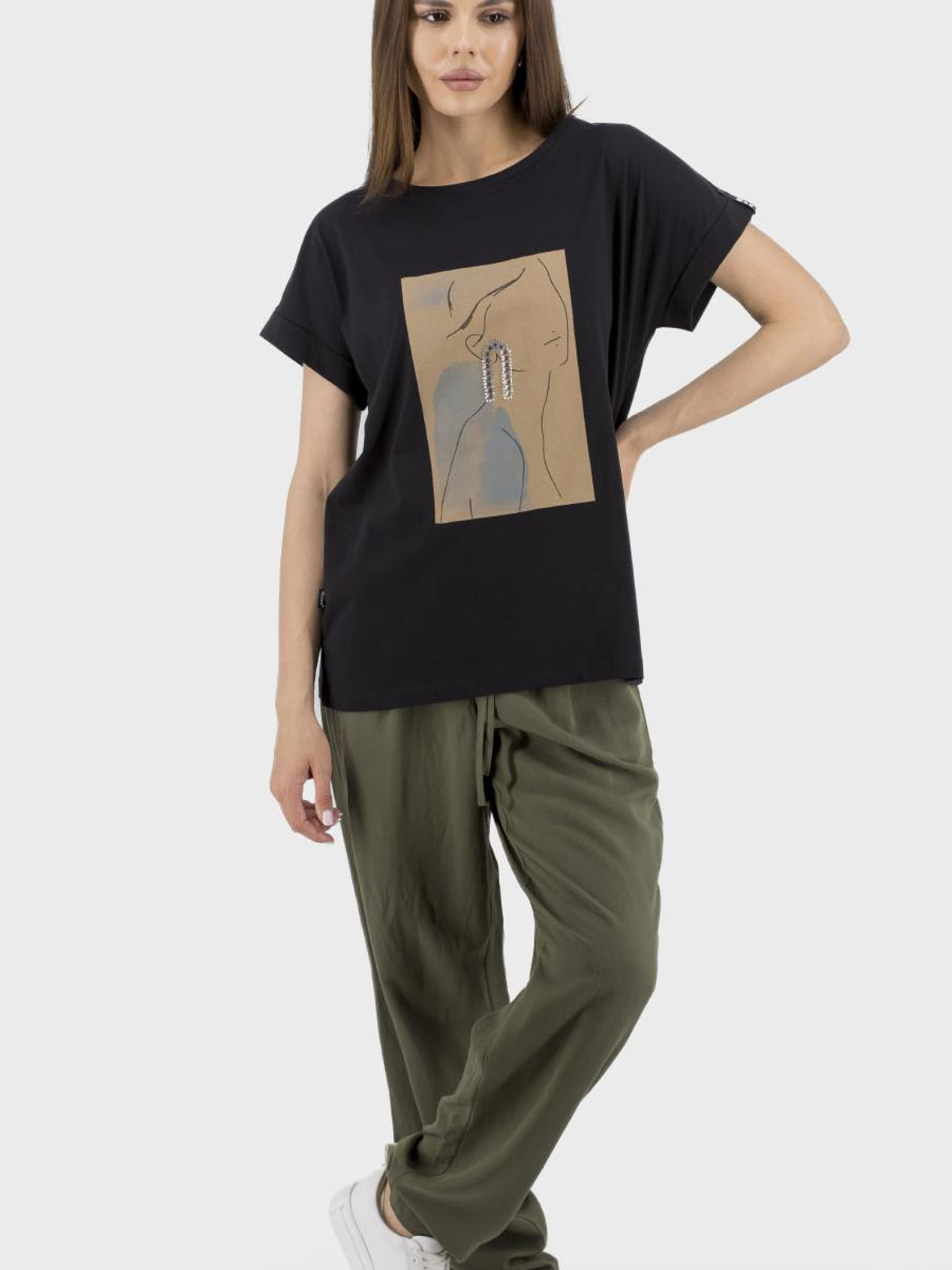 Представляем универсальную женскую футболку, идеально сочетающую стиль, комфорт и функциональность. Эта спортивно-casual футболка изготовлена без подкладки и утеплителя, что делает ее идеальным выбором для любого времени года. Втачный короткий рукав и круглый вырез придают элегантности, в то время как яркие рисунки и надписи, подчеркнутые аппликацией, бисером и кристаллами, придают акценты. Прямой силуэт обеспечивает свободу движений, а отсутствие застежек и капюшона подчеркивает минималистичный дизайн. Доступная в классическом черном цвете, эта футболка станет незаменимым элементом вашего гардероба для создания стильных образов в любое время года.