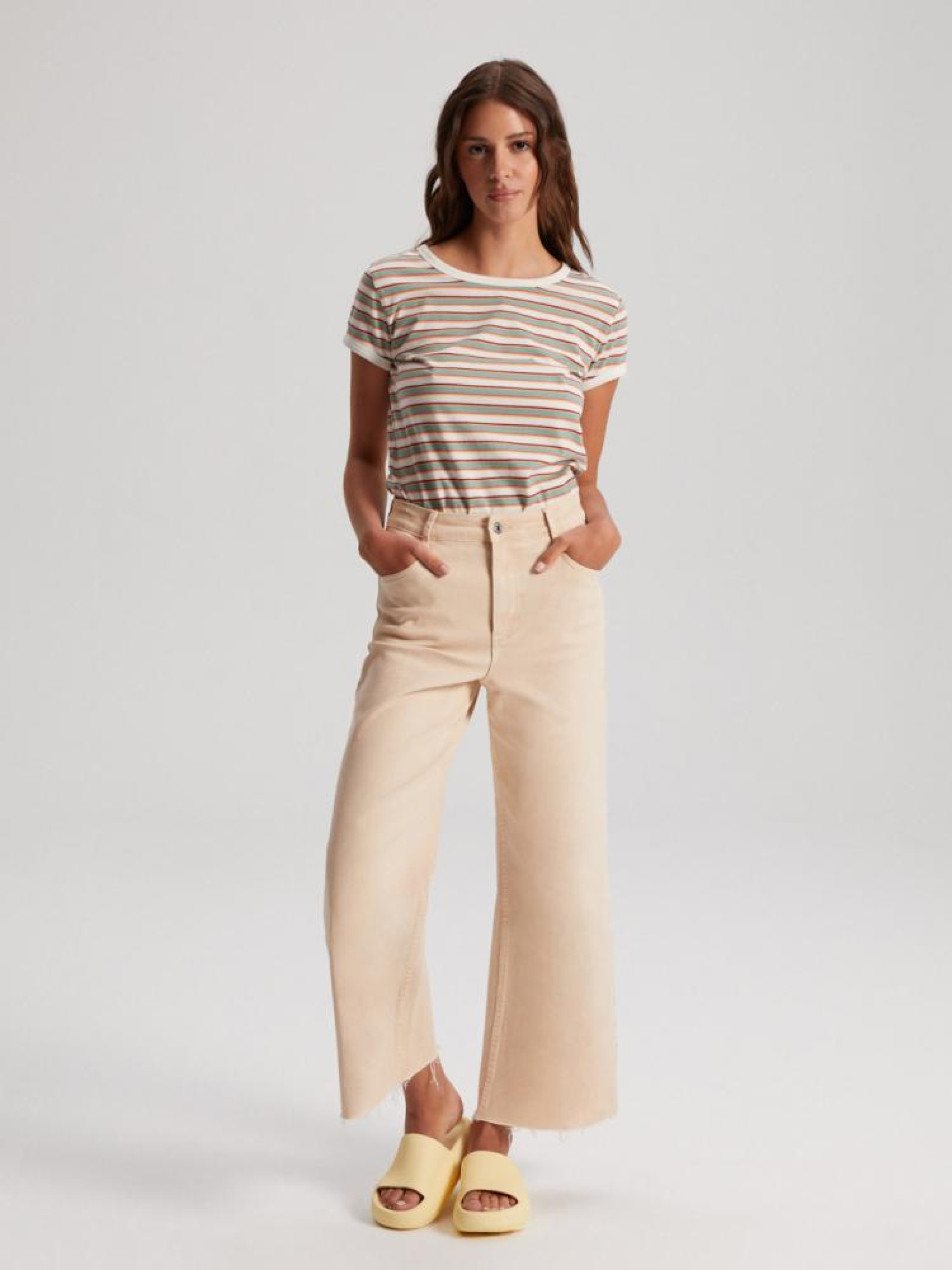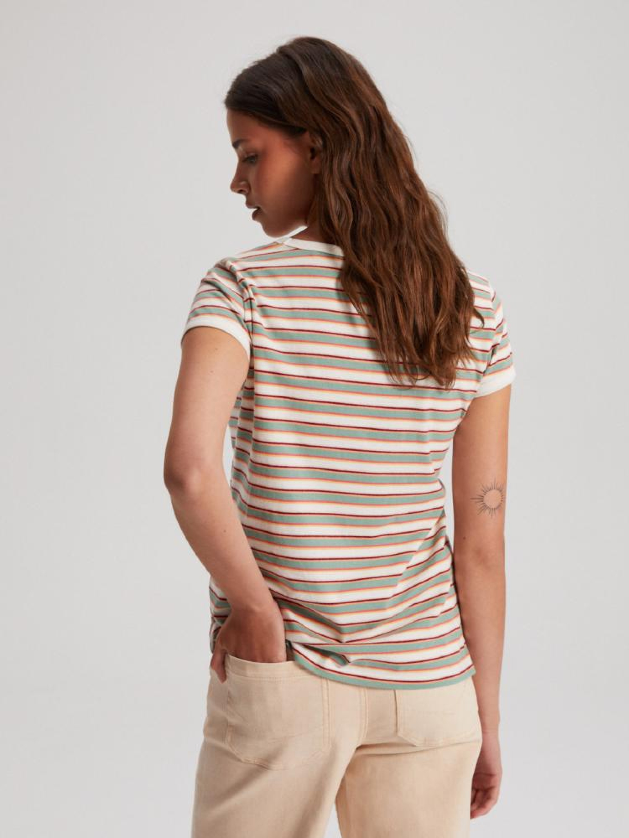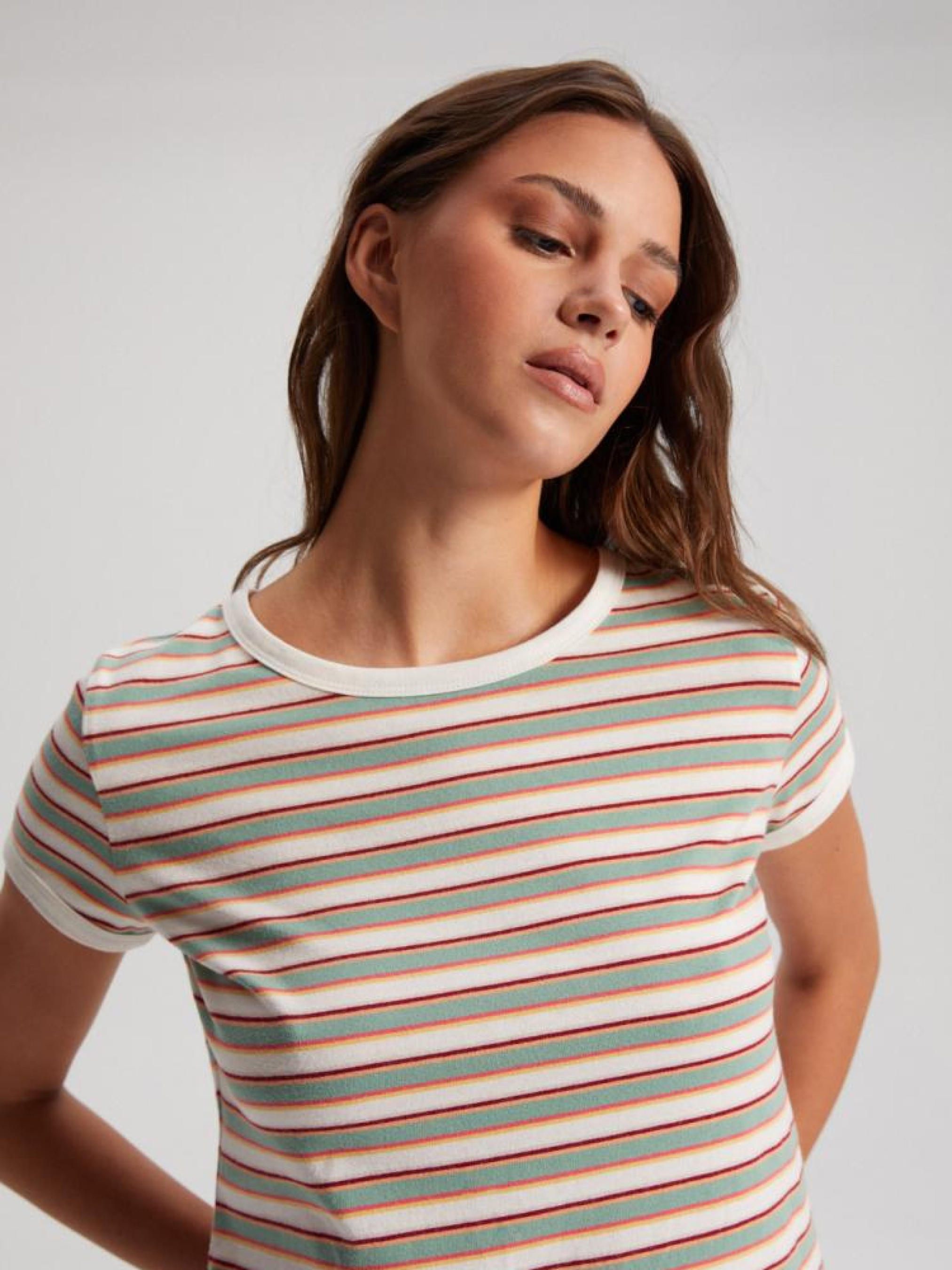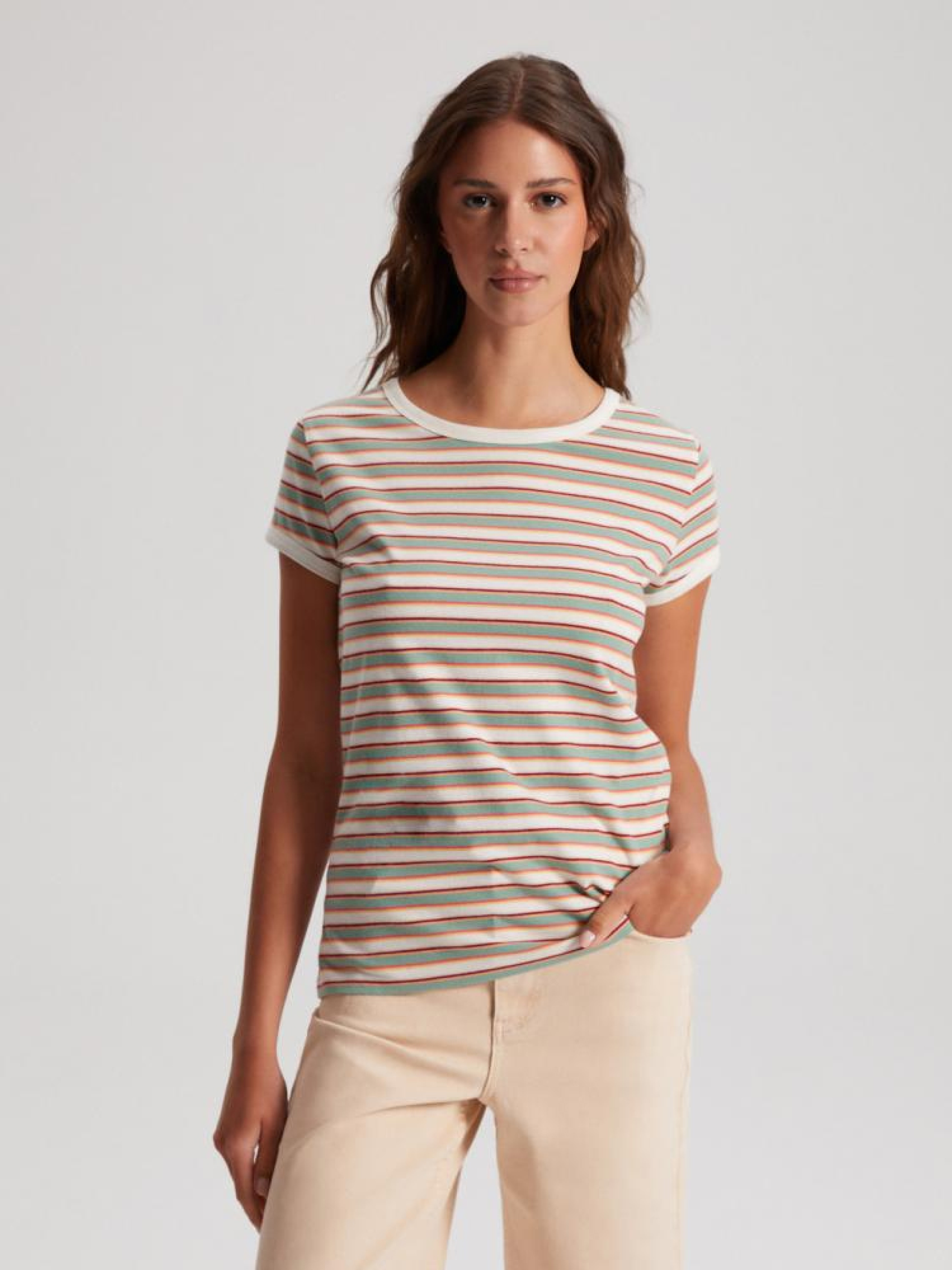 Футболка ROSEN 10042108 Хлопковая футболка в стиле ретро: - классического кроя, - из хлопкового трикотажа, - с контрастной окантовкой, - доступна в разноцветные полоски. Сезон: Весна/Лето Состав: 100% хлопок Уход: - стирка при максимум 30 °С - деликатные вещи - не отбеливать - не сушить в сушильной машине - гладить максимум при темп. 110 °С - не химчистка Размер на модели - S Рост модели - 175 см