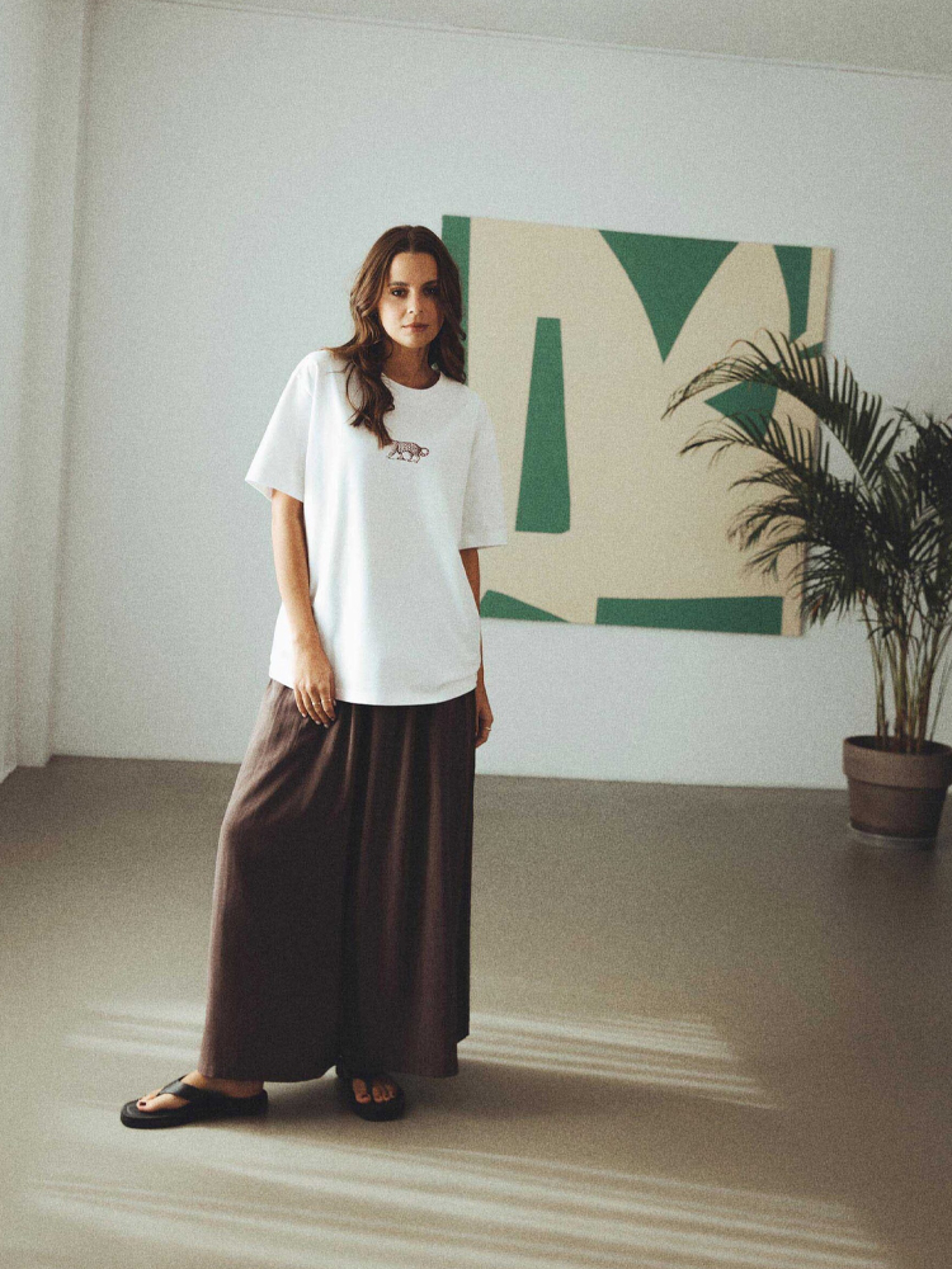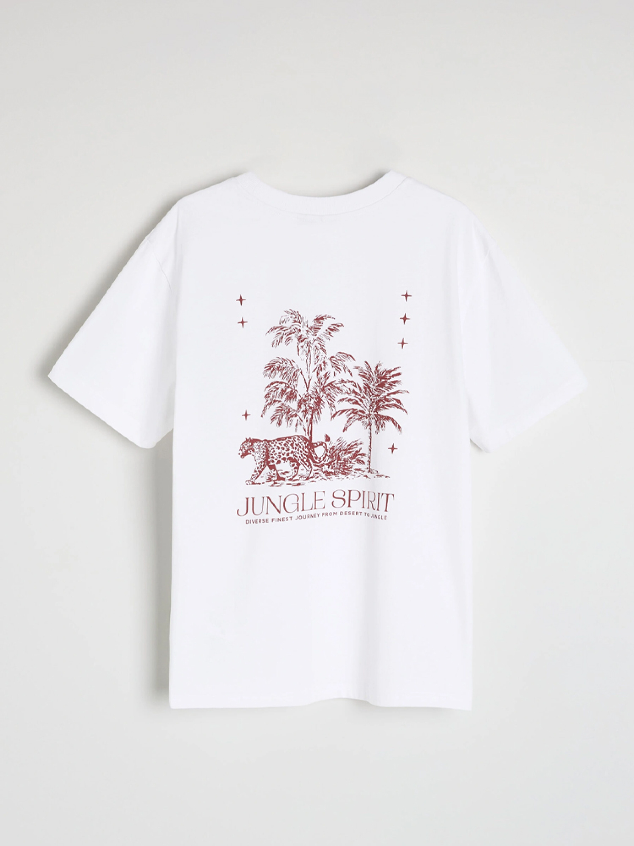 HAMSA Хлопковая футболка из мягкого трикотажа: - свободного кроя, - изготовлена из хлопкового трикотажа, - с оригинальным принтом спереди и сзади, - доступна в теплом белом цвете, Состав: 100% хлопок Сезон: Весна/Лето Уход: - стирка при максимум 30 °С - деликатная стирка - не отбеливать - не сушить в сушильной машине - гладить максимум при темпе. 110 °С - не химчистка