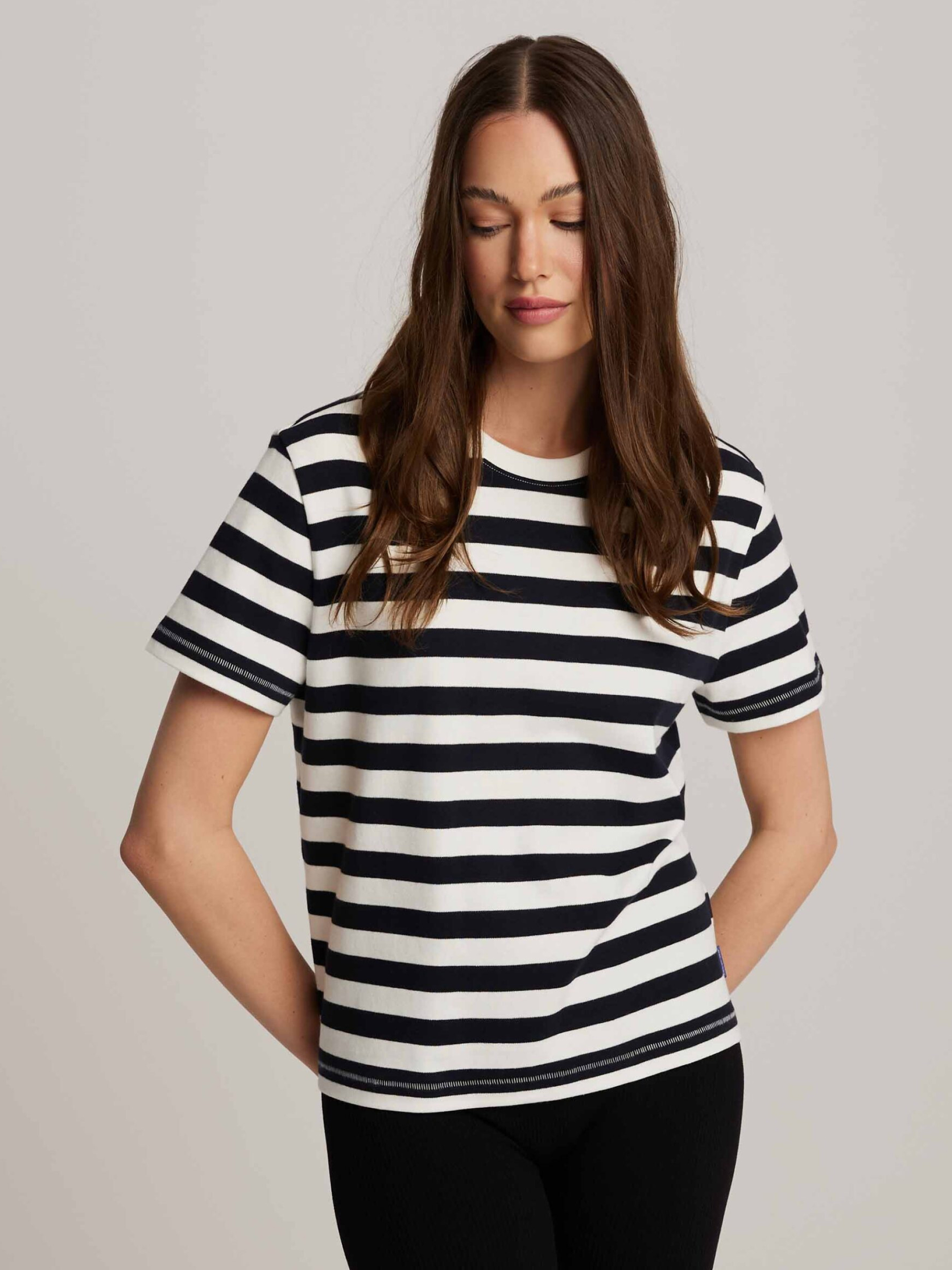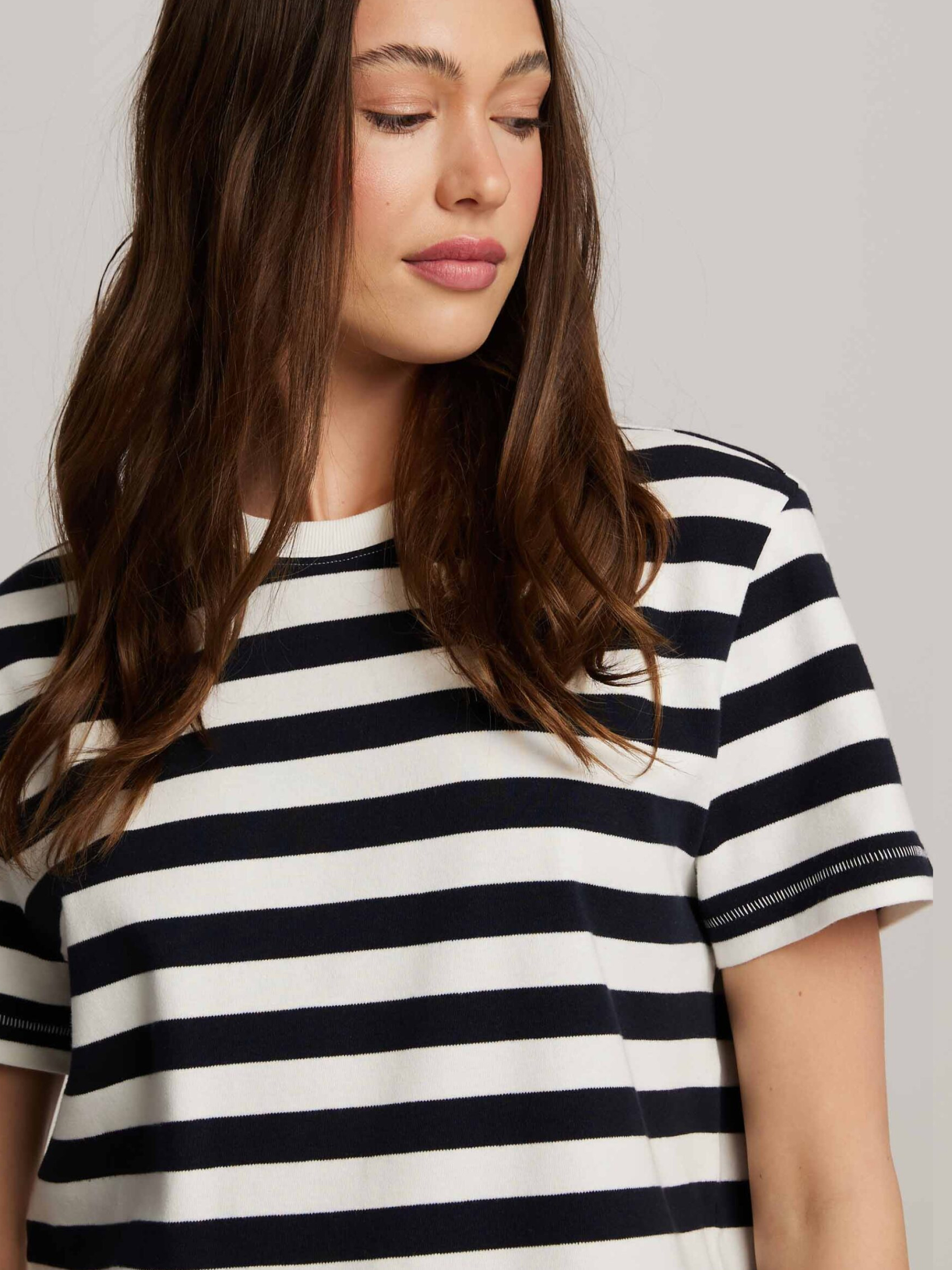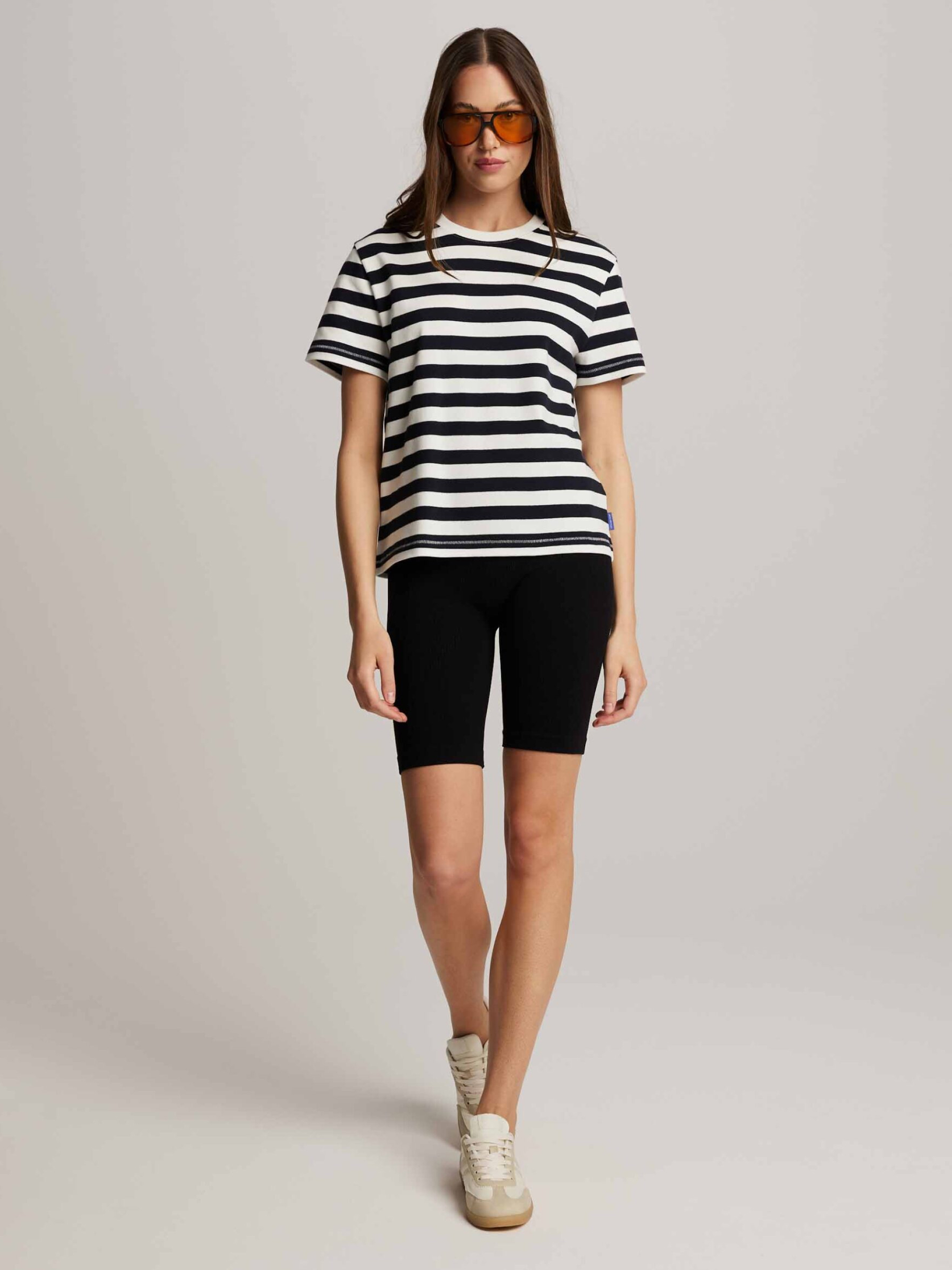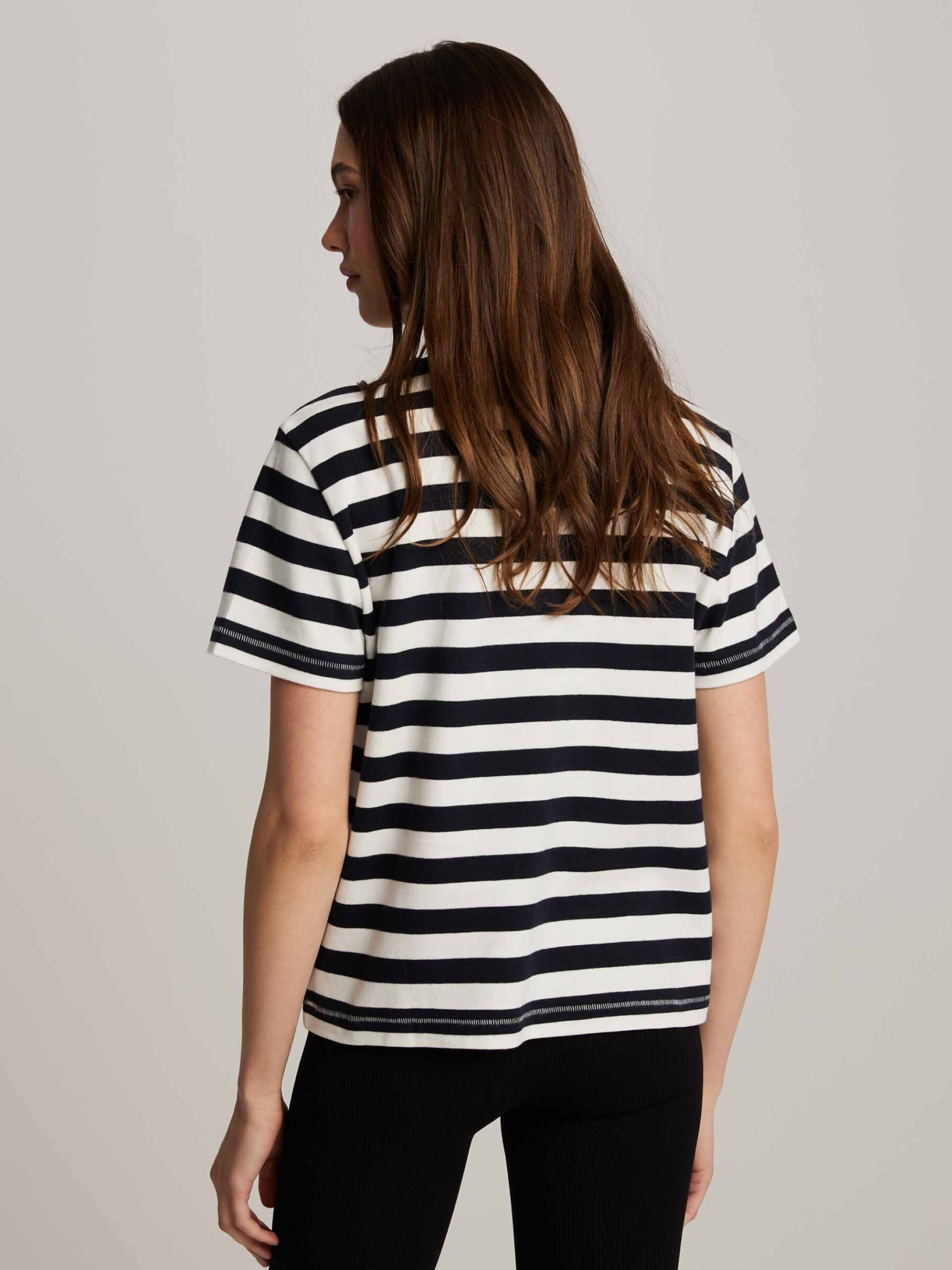 MALIKA Полосатая футболка: - обычного кроя, - изготовлена из хлопкового трикотажа, - с короткими рукавами, - доступна в полосках. Состав: 100% хлопок Сезон: Весна/Лето Уход: - стирка при максимум 30 °С - деликатная стирка - не отбеливать - не сушить в сушильной машине - гладить максимум при темпе. 110 °С - не химчистка