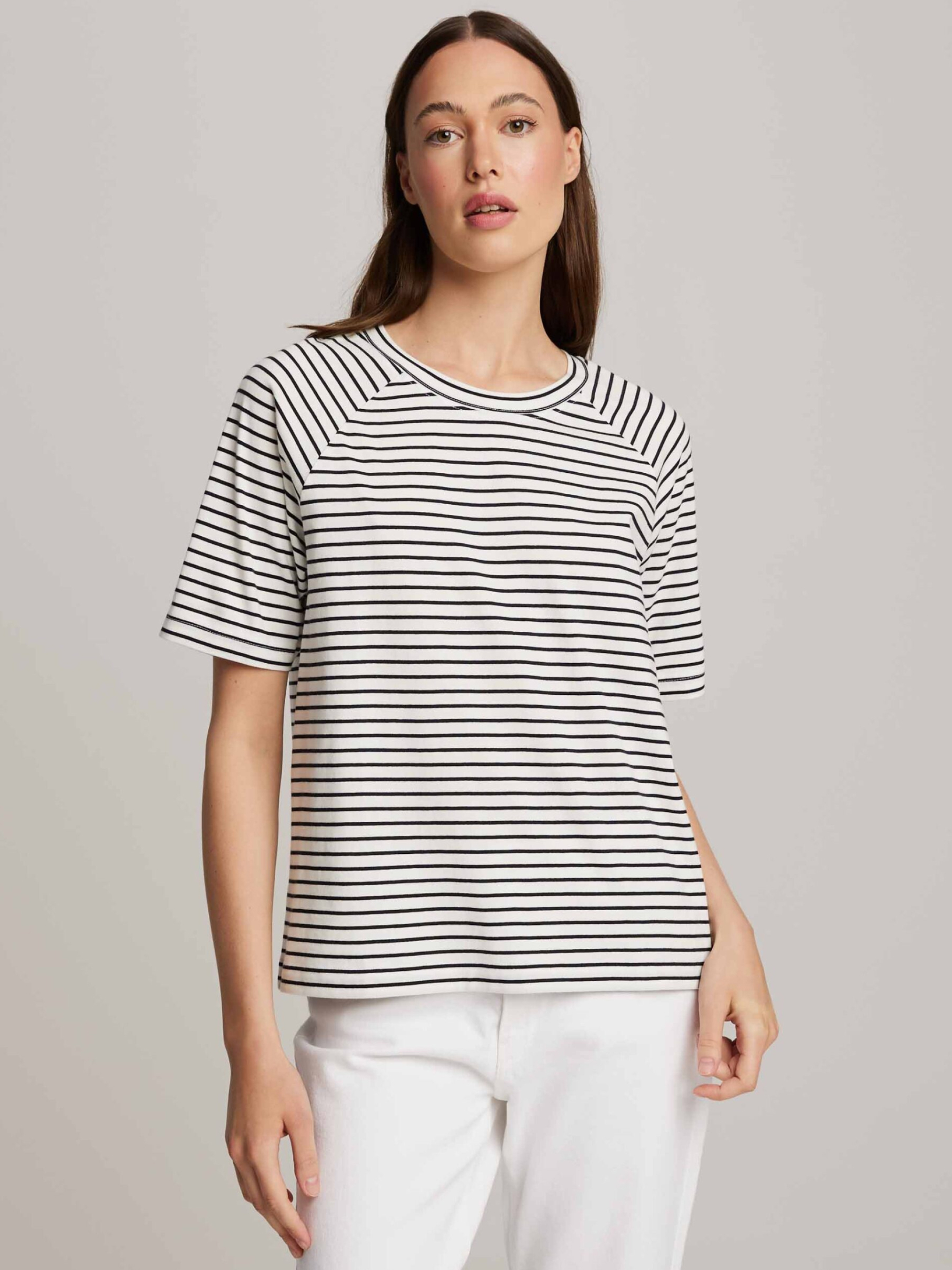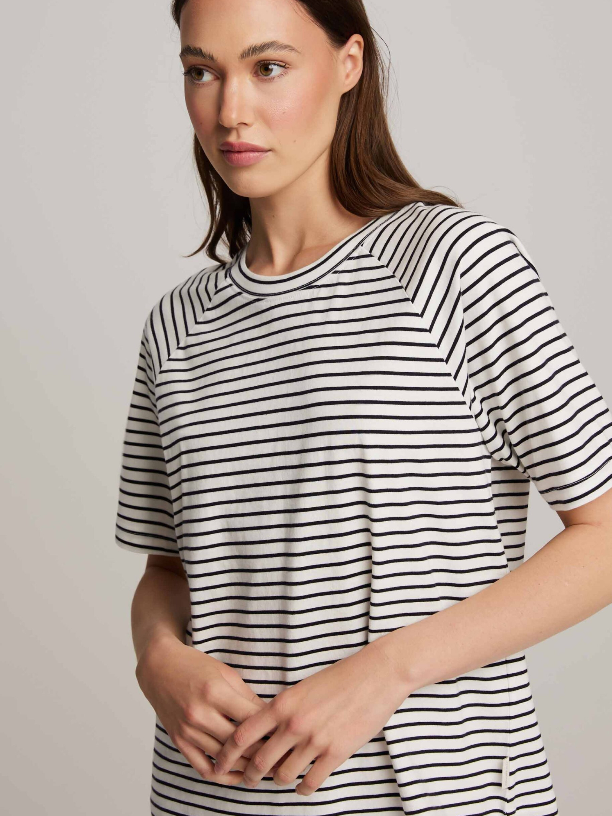 CALDERI Футболка свободного кроя с рукавами реглан: - обычного кроя, - изготовлена из хлопкового трикотажа, - с рукавами реглан, - с короткими рукавами, - доступна в полосках. Состав: 100% хлопок Сезон: Весна/Лето Уход: - стирка при максимуме 30 °С - деликатные вещи - не отбеливать - не сушить в сушильной машине - гладить максимум при темпе. 110 °С - не химчистка