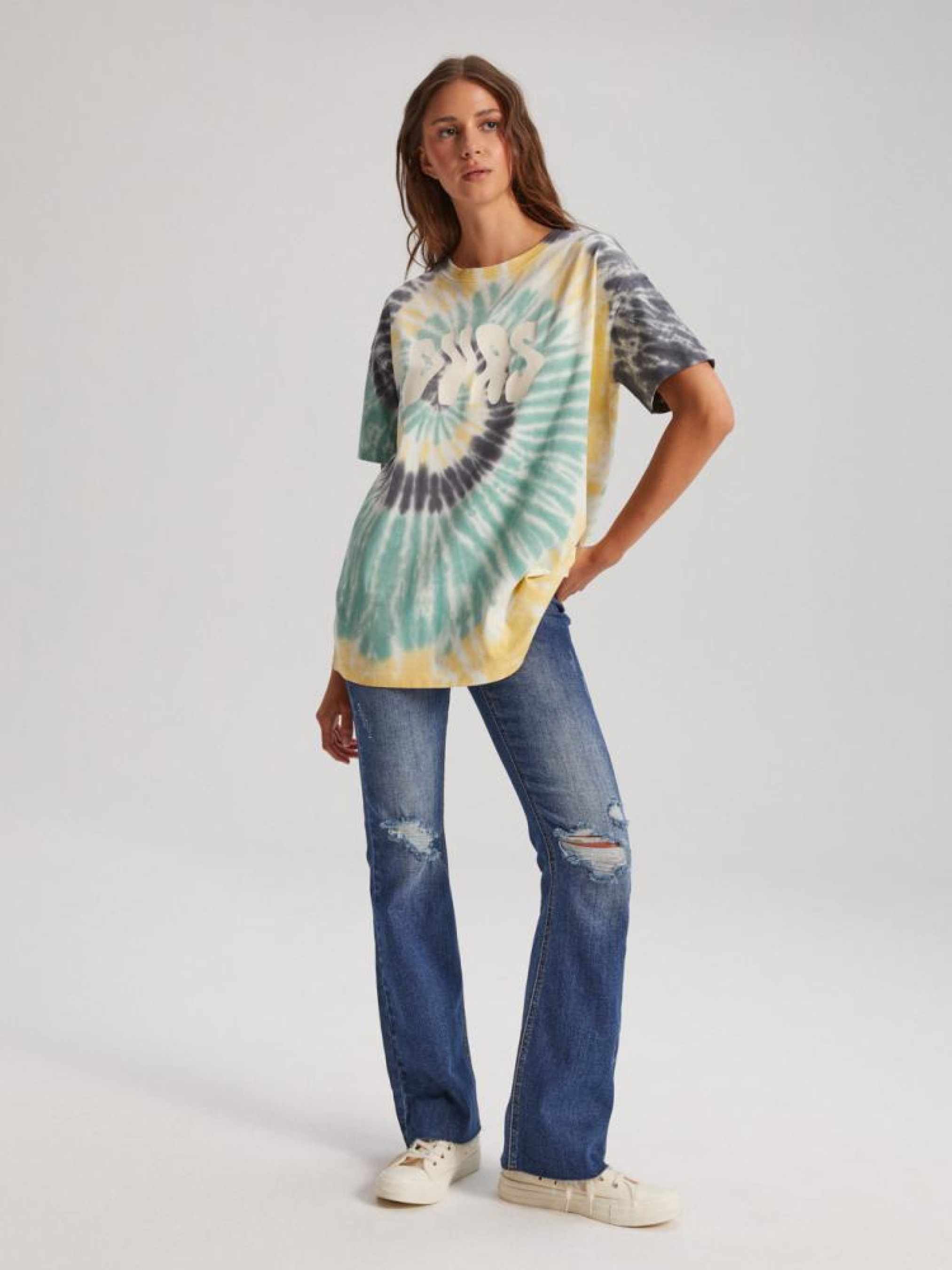 CALIFRA Футболка 10042100 Хлопковая трикотажная футболка с разноцветным эффектом тай-дай: - крой oversize, - изготовлена из хлопкового трикотажа, - с цветовым эффектом тай-дай, – с аппликацией спереди. Сезон: Весна/Лето Состав: 100% хлопок Уход: - стирка при максимум 30 °С - деликатные вещи - не отбеливать - не сушить в сушильной машине - гладить максимум при темп. 110 °С - не химчистка Размер на модели - XS/S Рост модели - 175 см