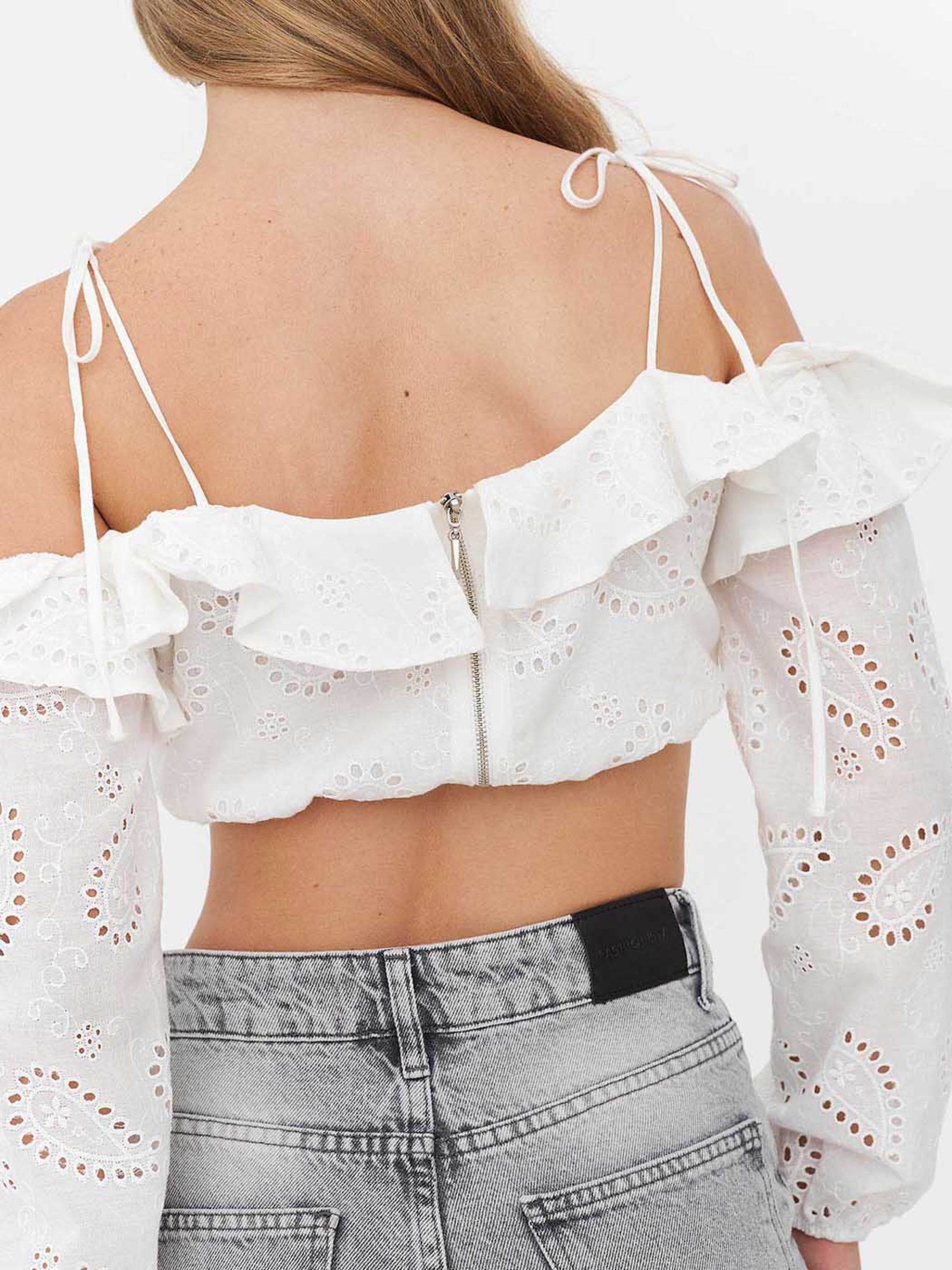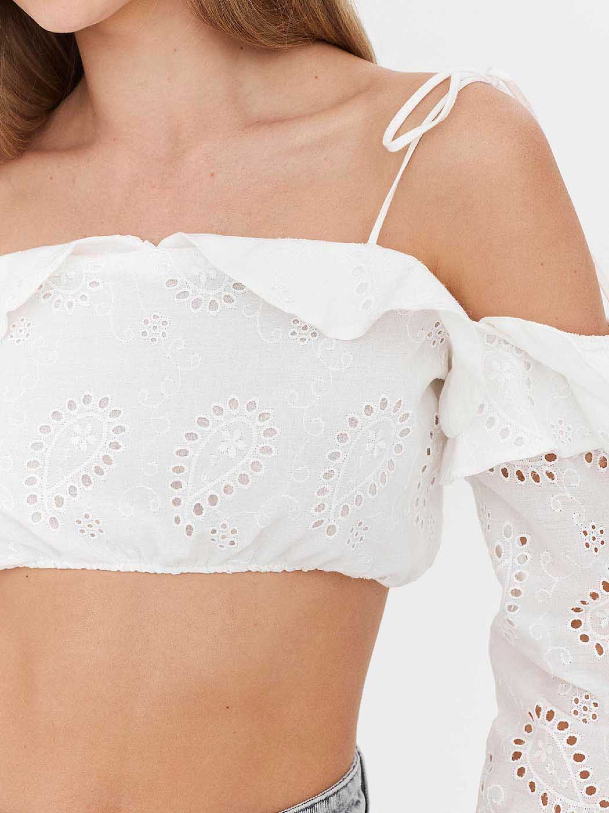 Однотонный топ с вышивкой и перфорацией. Модель с открытыми плечами, рюшем по линии выреза, длинными рукавами с эластичными вставками и тонкими бретелями-завязками.