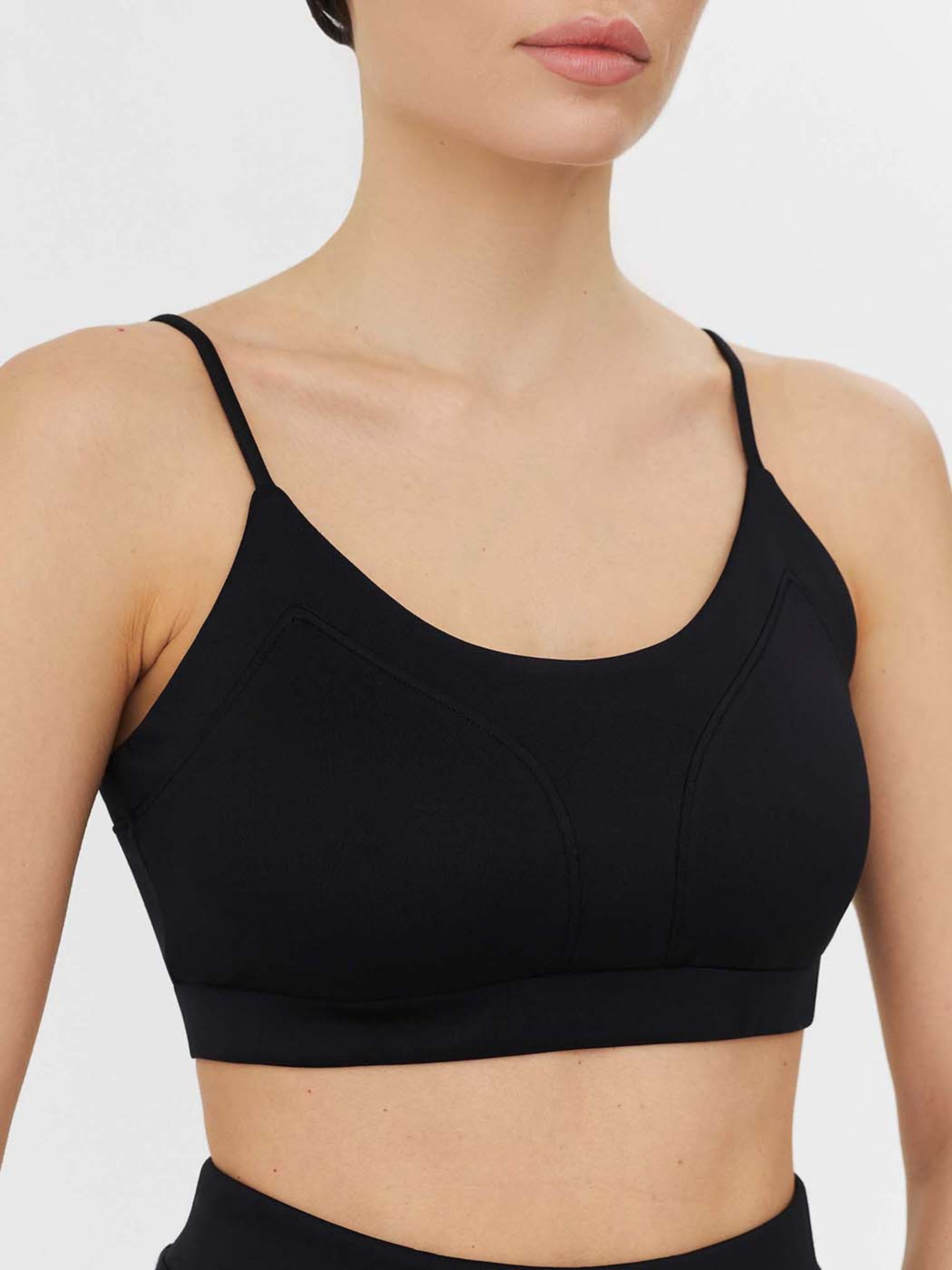 Однотонный топ черного цвета с круглым вырезом, декоративными швами и тонкими бретелями (с регулируемой длиной).
