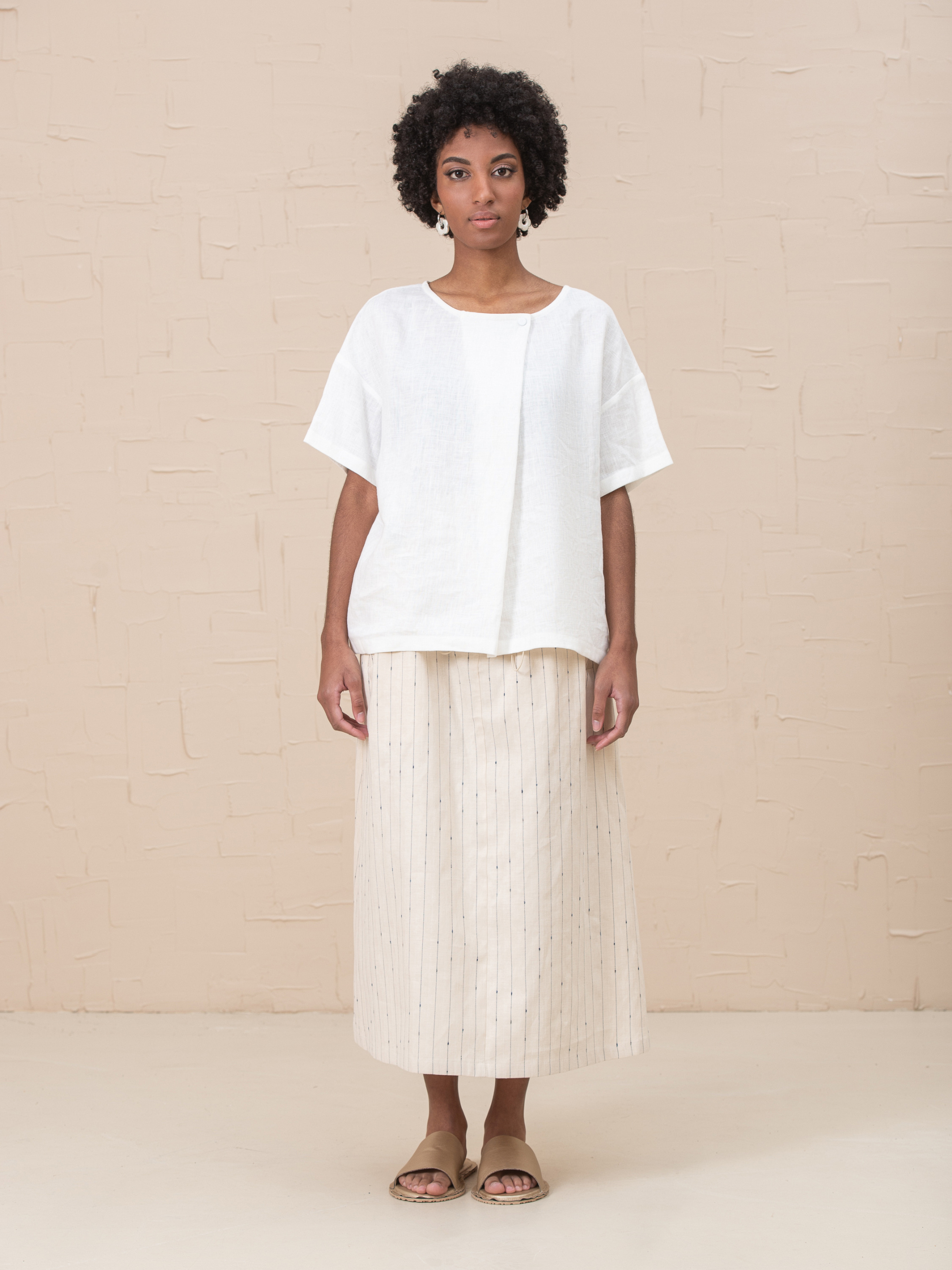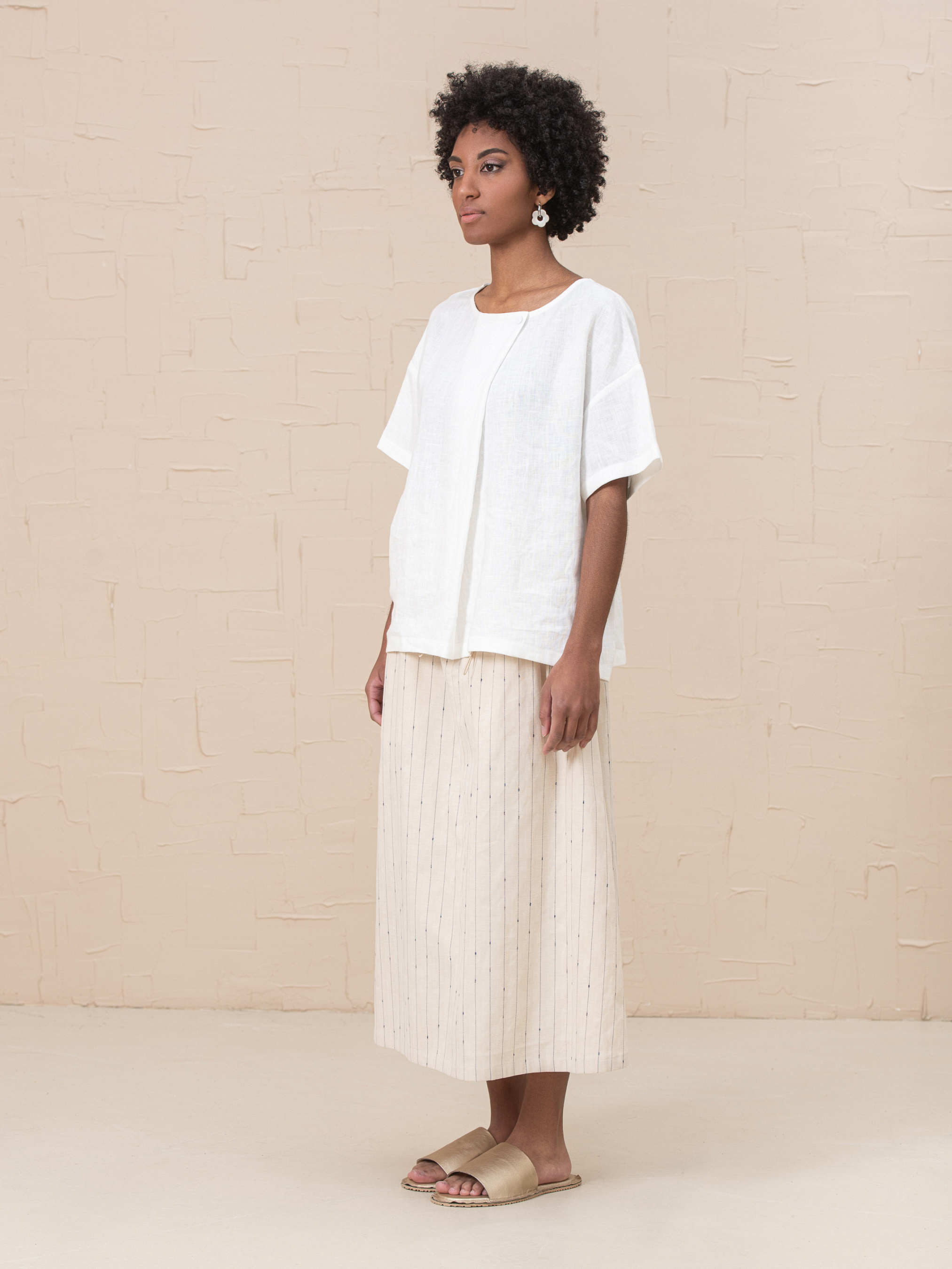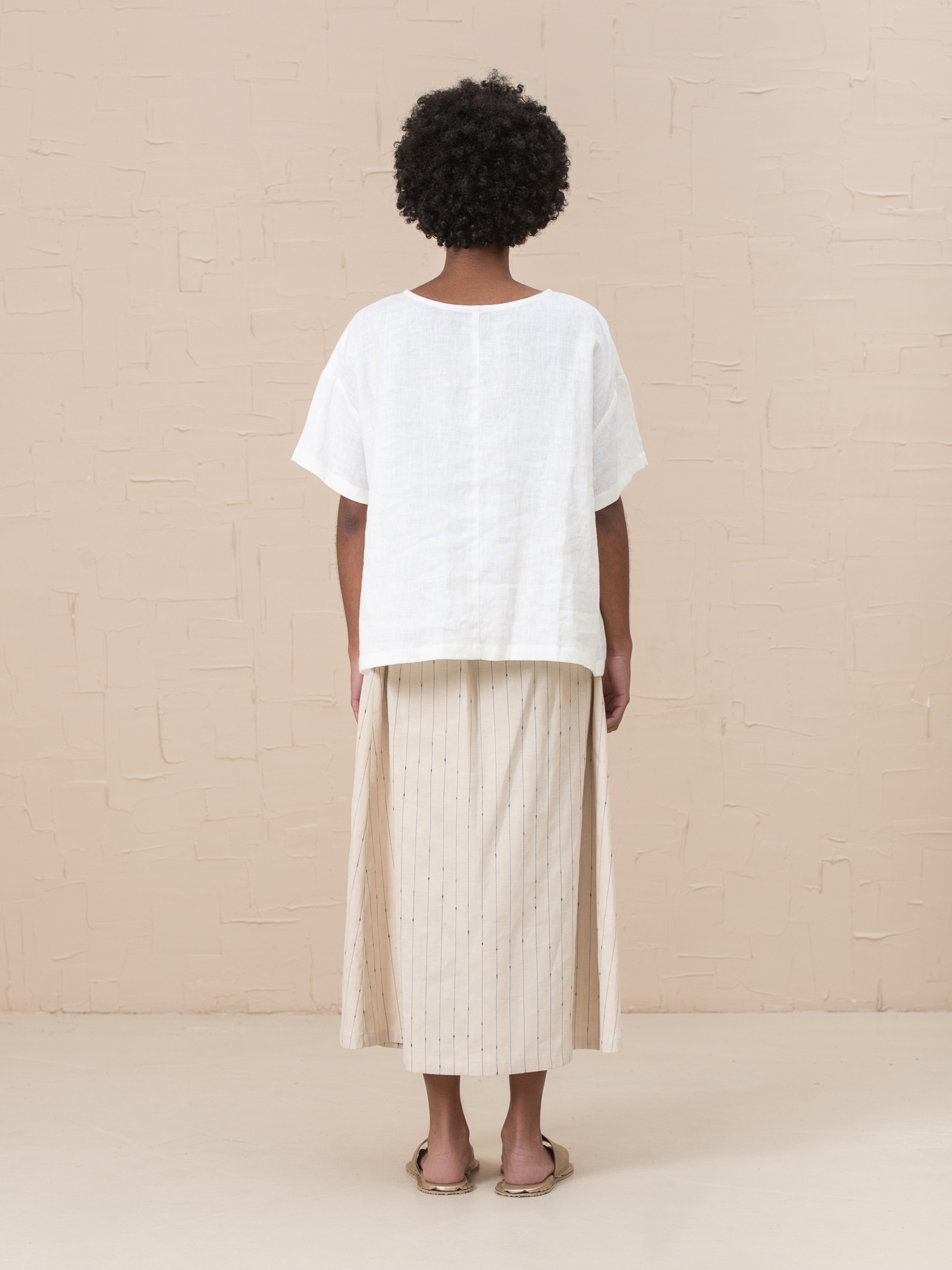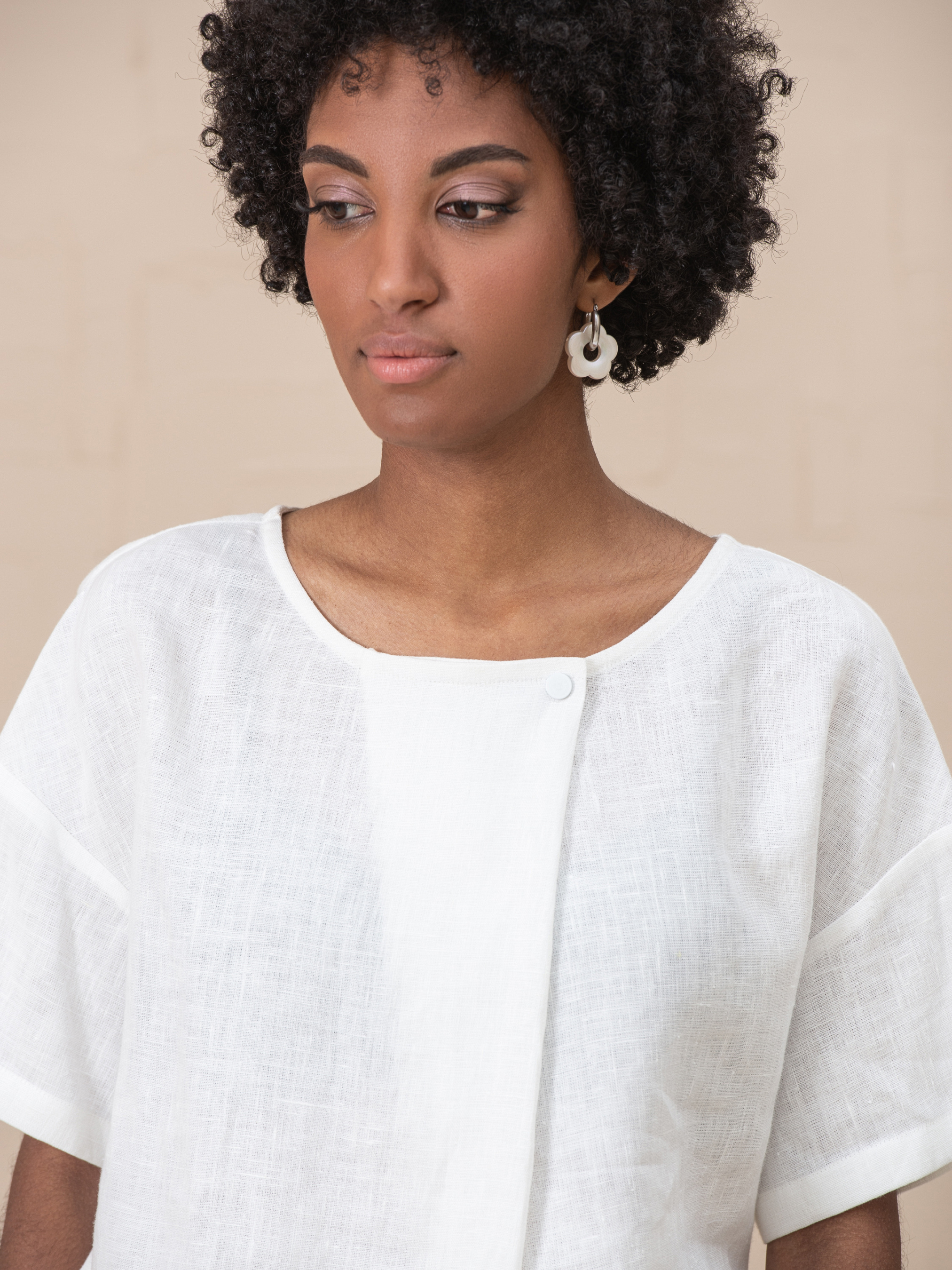 Футболка из смягченного 100% льна со складкой и короткими рукавами, не колется. Идеальна как для работы, так и повседневной носки. Имеет один размер, но удобна для разных фигур. Объем груди 130см Объем талии 130см Объем бедер 130см Длина изделия 62см Длина рукава 43см (от 7го шейного позвонка) Ширина рукава 41см Ширина низа рукава 39см