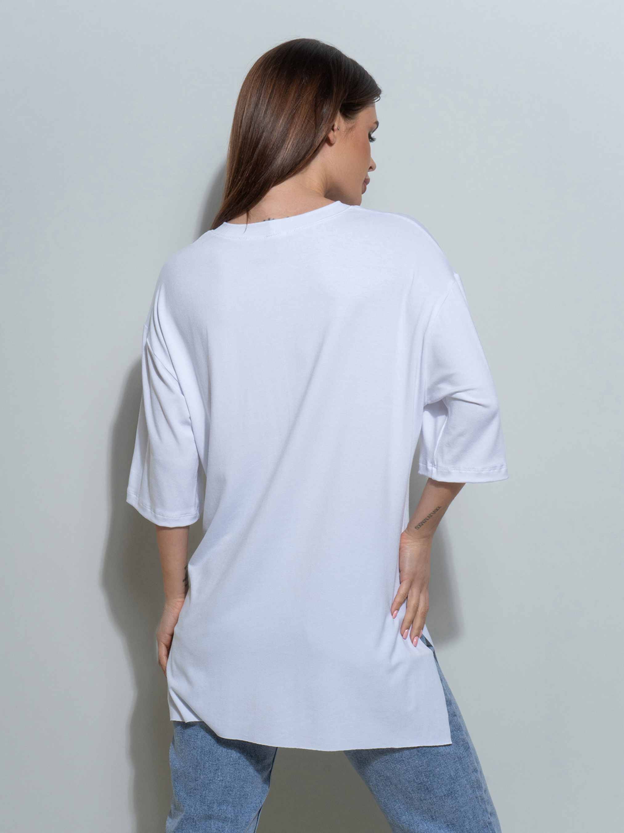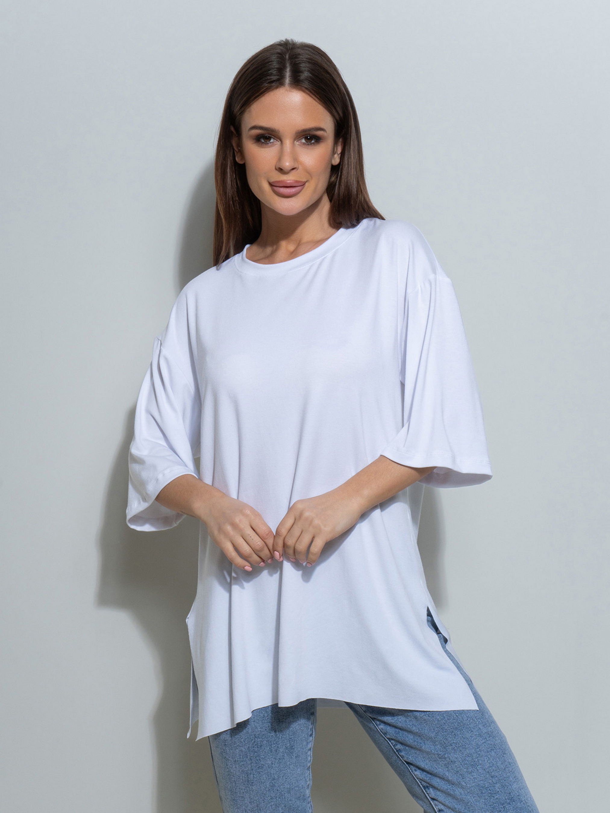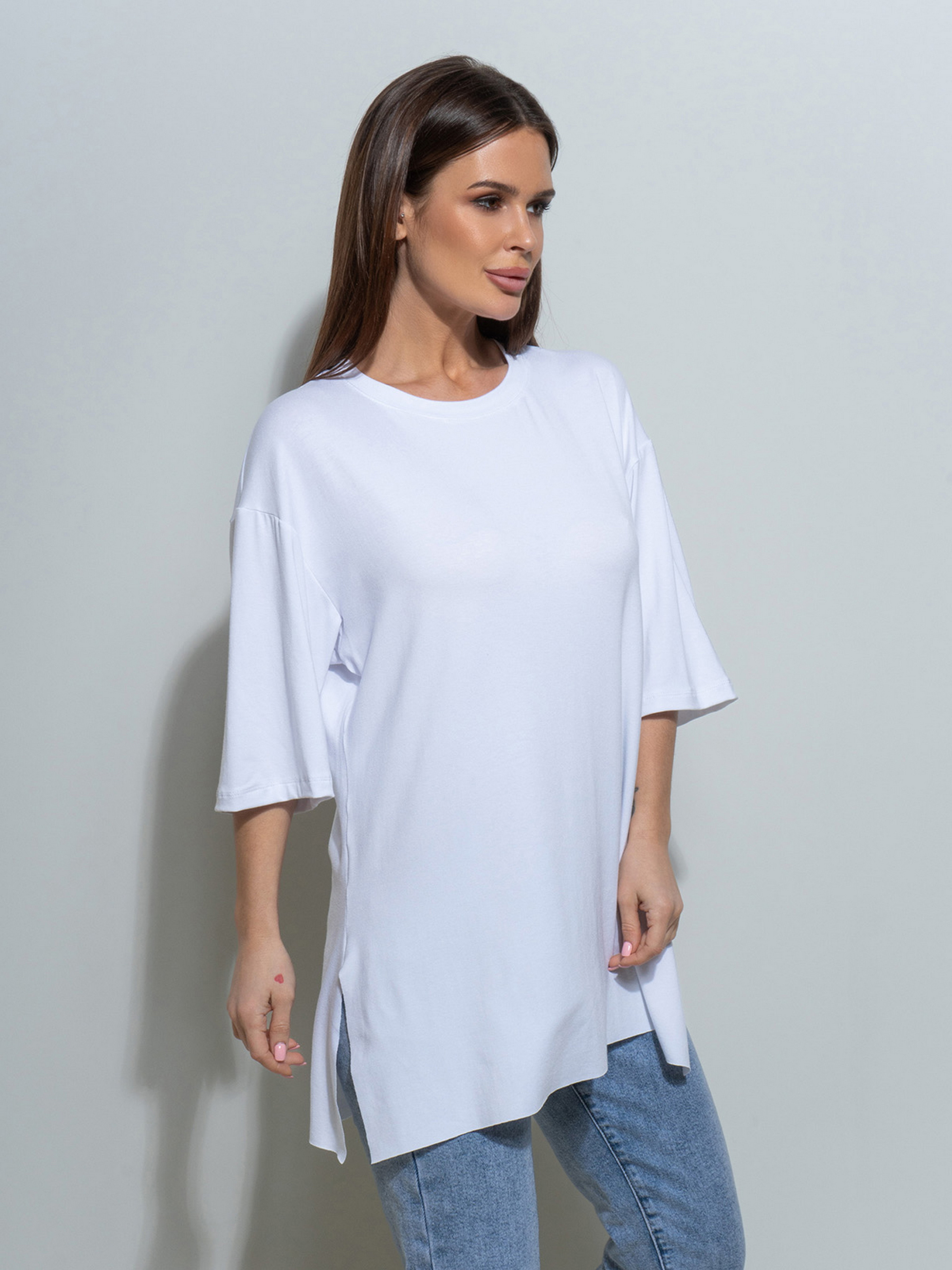 Свободная белая футболка, выполненная из вискозного трикотажа с боковыми разрезами. Модель прямого удлиненного кроя с рукавами длиной до локтей и О-образной проймой горловины. Нижние срезы не обработаны швами.Полуобхват: Грудь: S (52), M (54), L (56), XL (58), Длина изделия - 69/72, Рукав - 27, Ткань: Высокой эластичности.