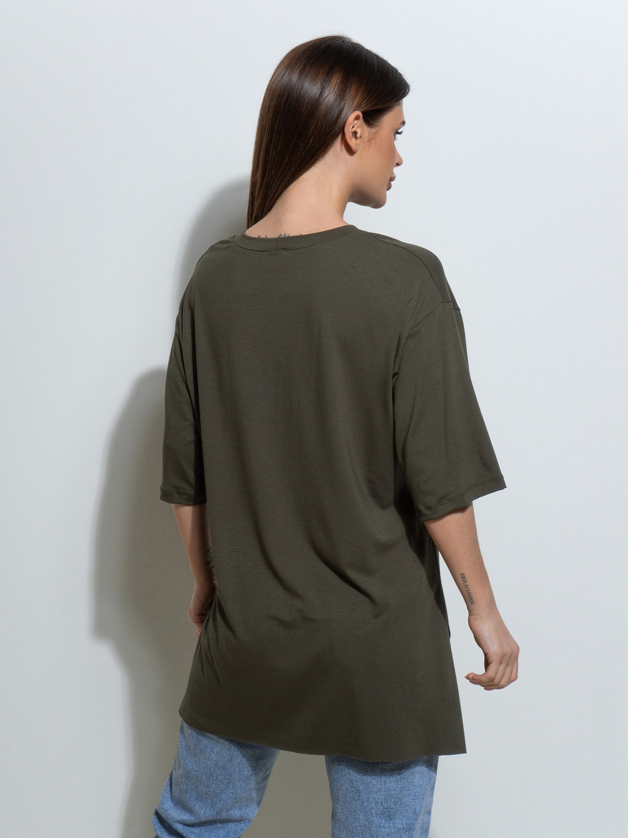 Оверсайз футболка, выполненная из вискозного трикотажа цвета хаки. Модель прямого удлиненного кроя с рукавами длиной до локтей и закрытой проймой горловины. Нижние срезы не обработаны швами, изделие с симметричными разрезами.Полуобхват: Грудь: S (52), M (54), L (56), XL (58), Длина изделия - 69/72, Рукав - 27, Ткань: Высокой эластичности.