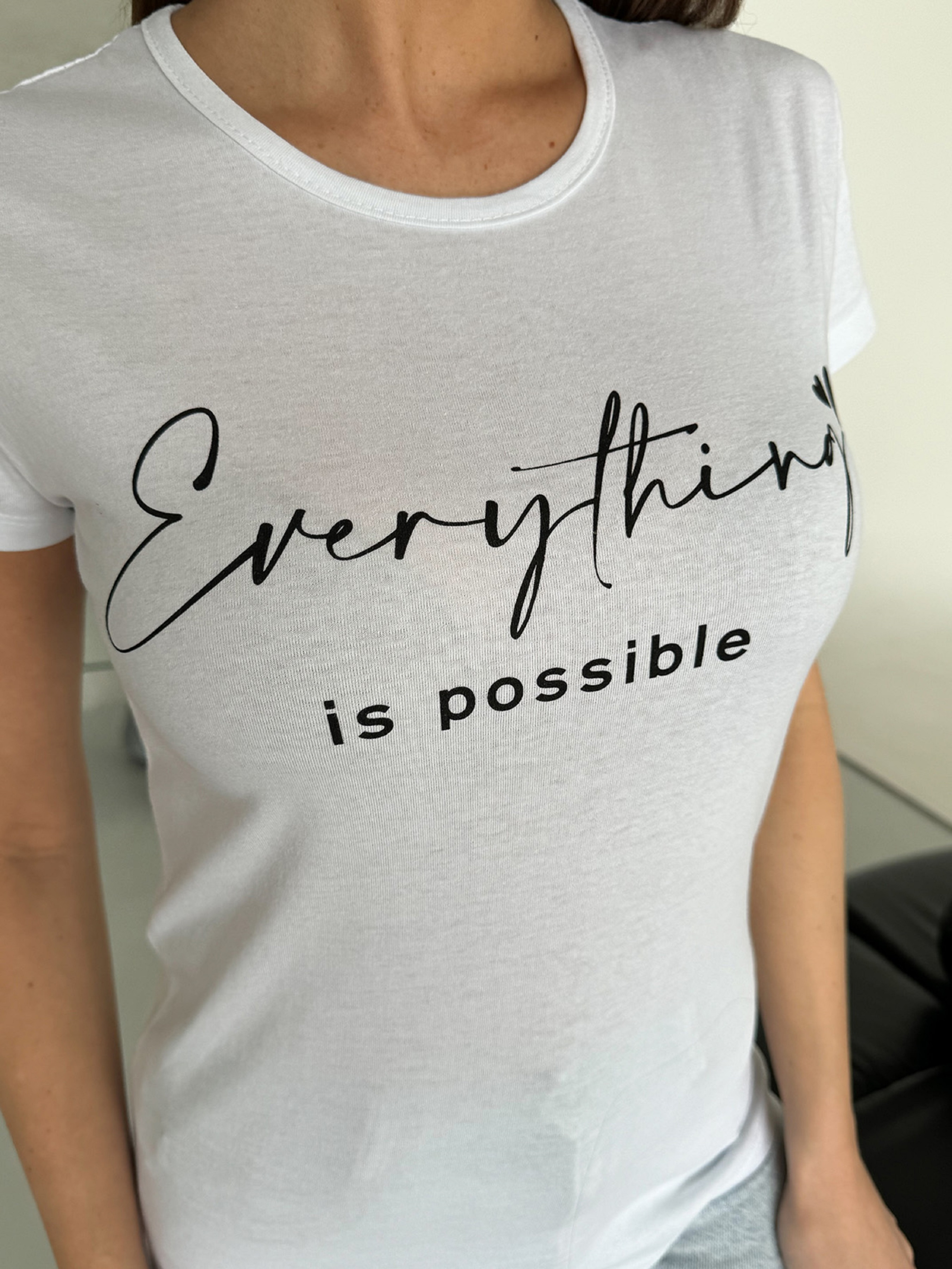 Белая трикотажная футболка с надписью.Полуобхват: Грудь: S (41), M (42), L (43), Длина изделия - 57, Рукав - 9, Ткань: Средней эластичности.