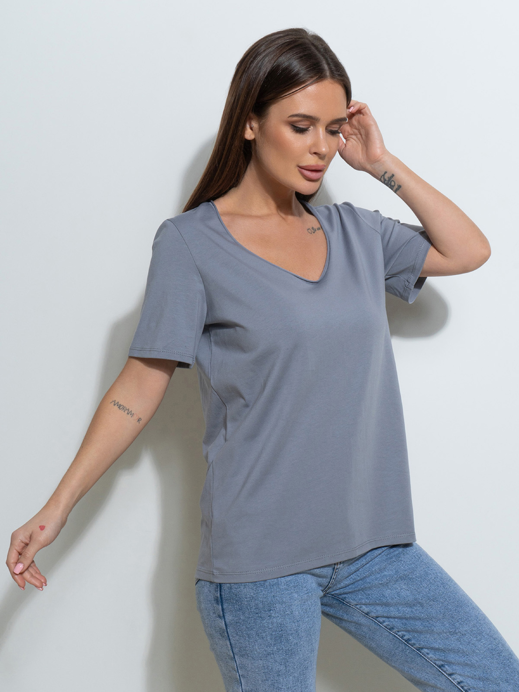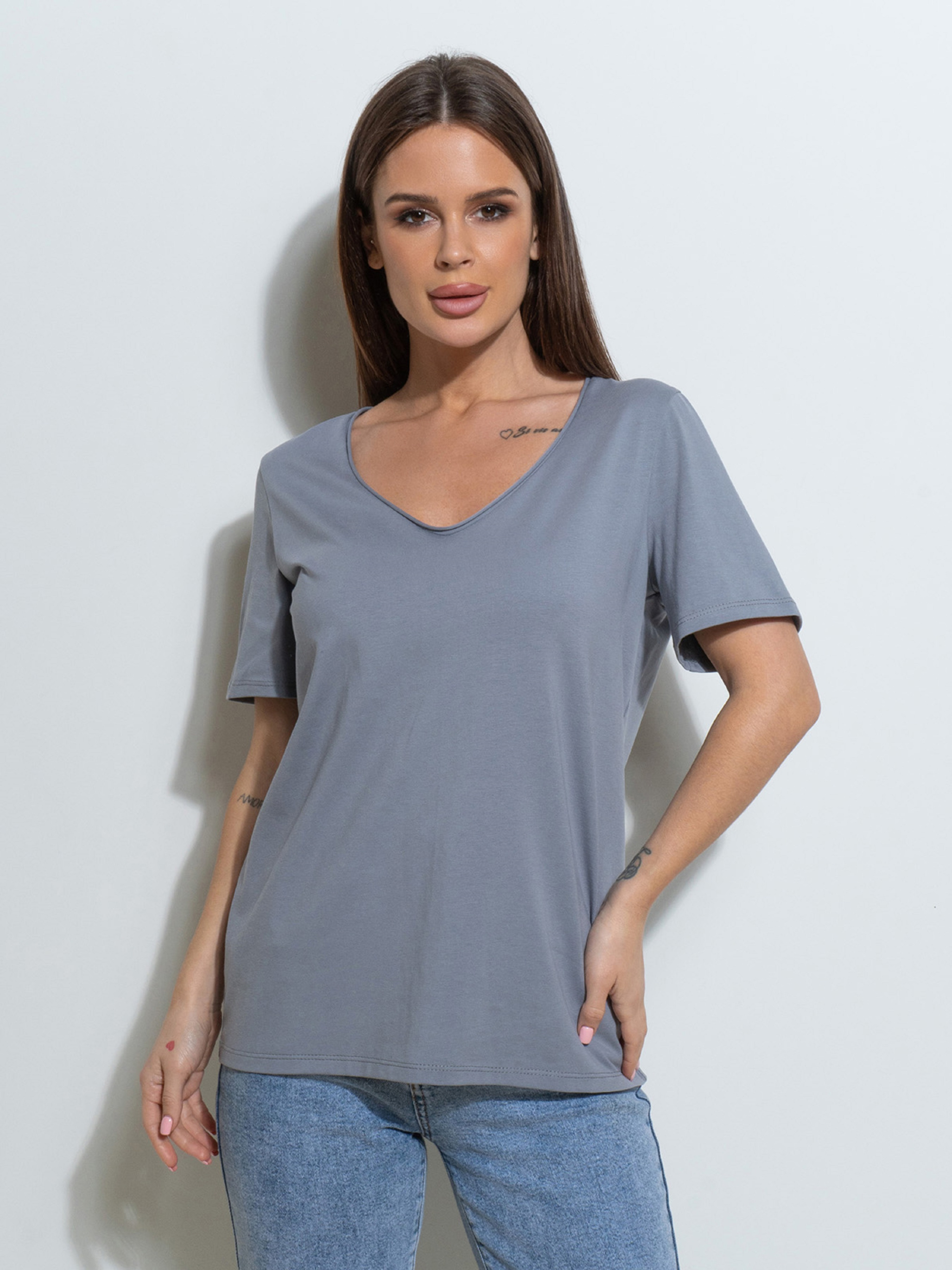 Базовая серая футболка, выполненная из хлопкового трикотажа. Модель прямого свободного кроя с V-образной горловиной и короткими рукавами.Полуобхват: Грудь: S (49), M (51), L (53), XL (55), Длина изделия - 63, Рукав - 22, Ткань: Высокой эластичности