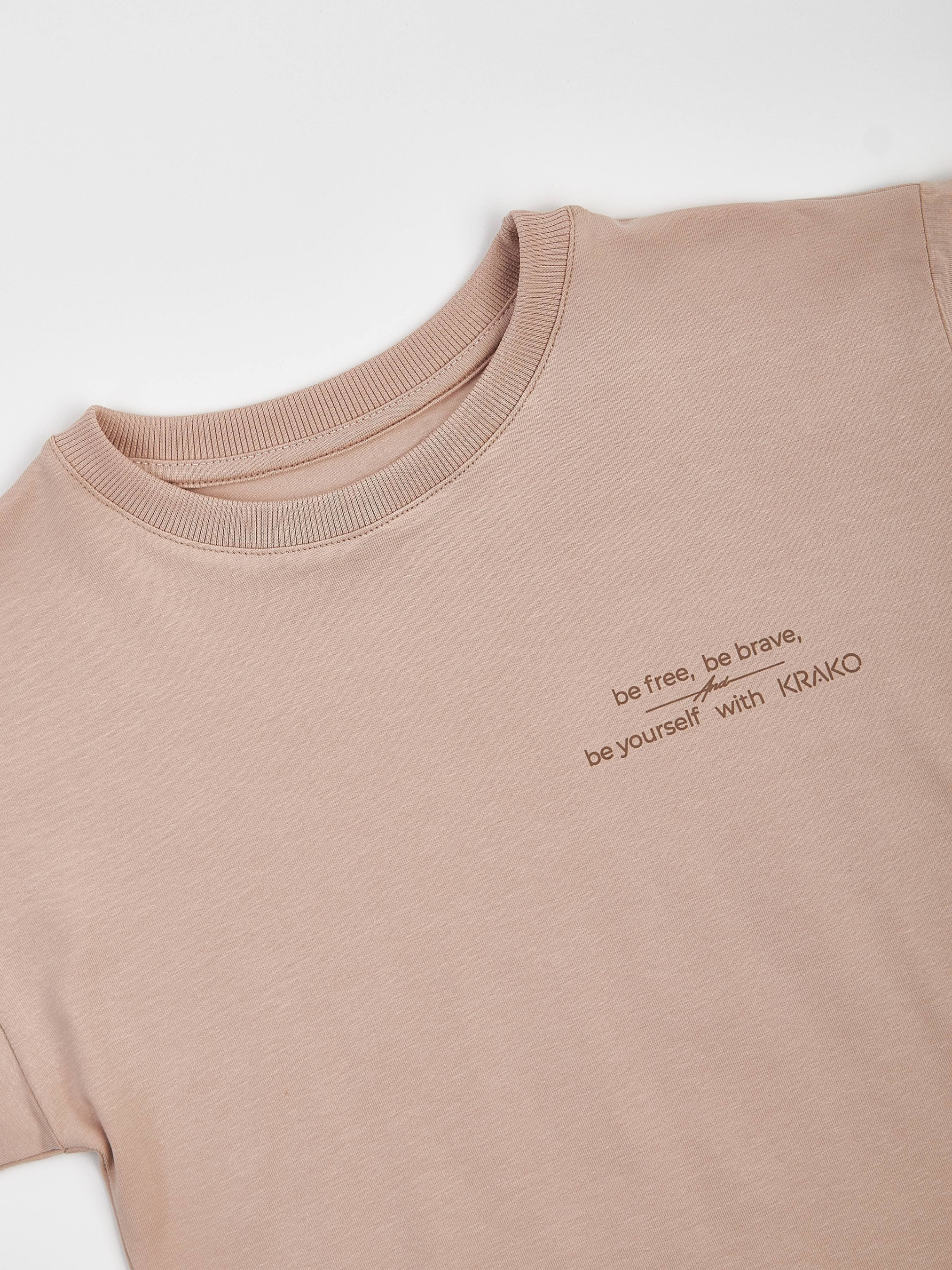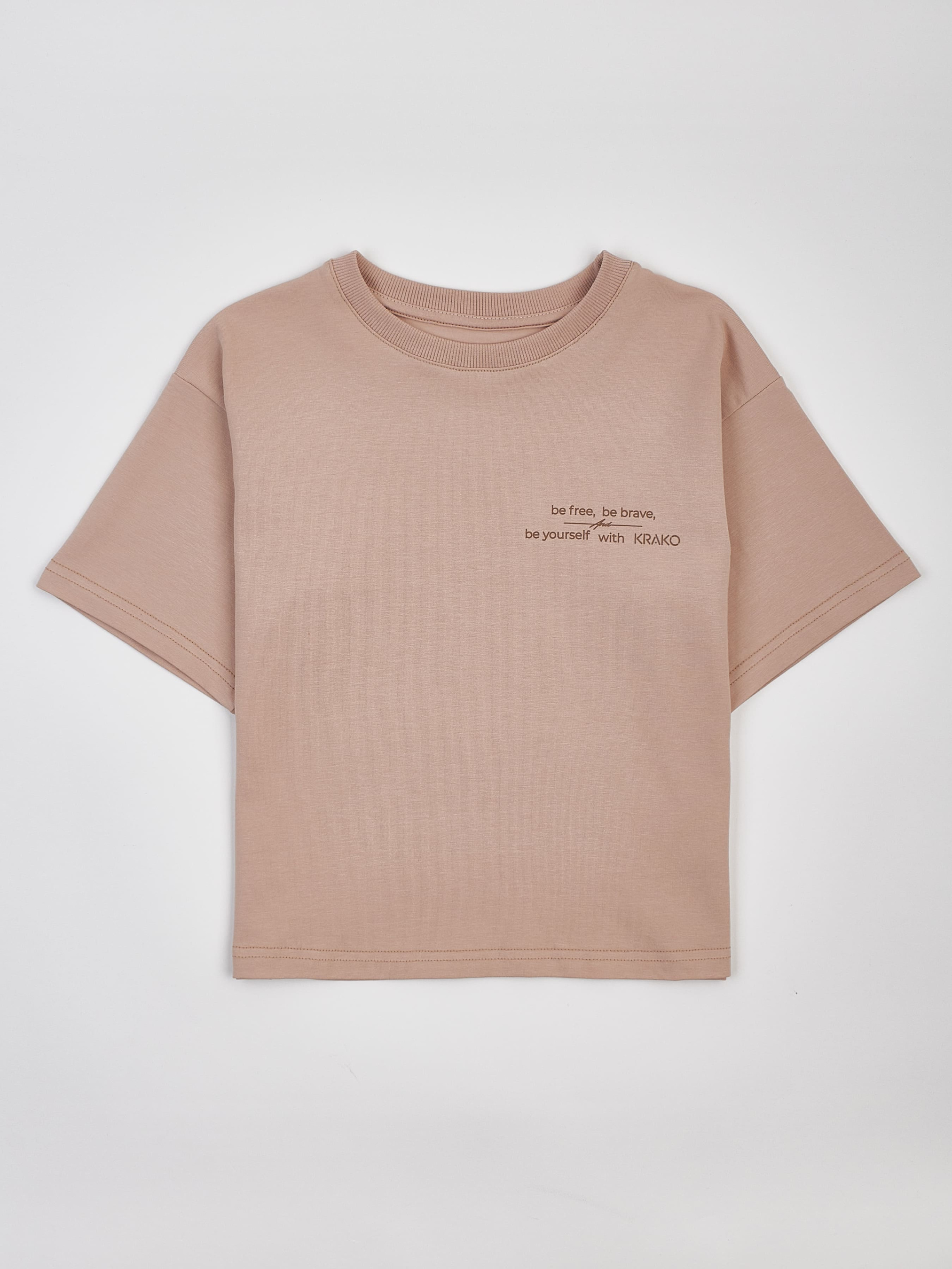 Детская бежевая футболка оверсайз с минималистичным принтом Эта футболка — про свободу быть собой с самого детства. Сдержанная и стильная надпись «be free, be brave, be yourself with KRAKO» (в переводе — «будь свободным, будь смелым, будь собой вместе с KRAKO») напоминает о важном: оставаться верным себе, мечтать смело и не бояться показывать свой характер. Футболка имеет свободный крой оверсайз, который дарит максимальный комфорт и свободу движений. Унисекс-дизайн подходит как для мальчиков, так и для девочек — отлично сочетается с любыми вещами в гардеробе. Изготовлена из мягкого, дышащего хлопка с добавлением эластана — ткань приятная к телу и хорошо сохраняет форму даже после множества стирок. Размеры полномерные — выбирайте привычный размер без необходимости брать с запасом. Преимущества: Свободный крой оверсайз Унисекс-дизайн Минималистичный принт с глубоким смыслом Ткань: 95% хлопок + 5% эластан — мягкая, эластичная и дышащая Надпись с переводом: «be free, be brave, be yourself with KRAKO» («будь свободным, будь смелым, будь собой вместе с KRAKO») Полномерная размерная сетка