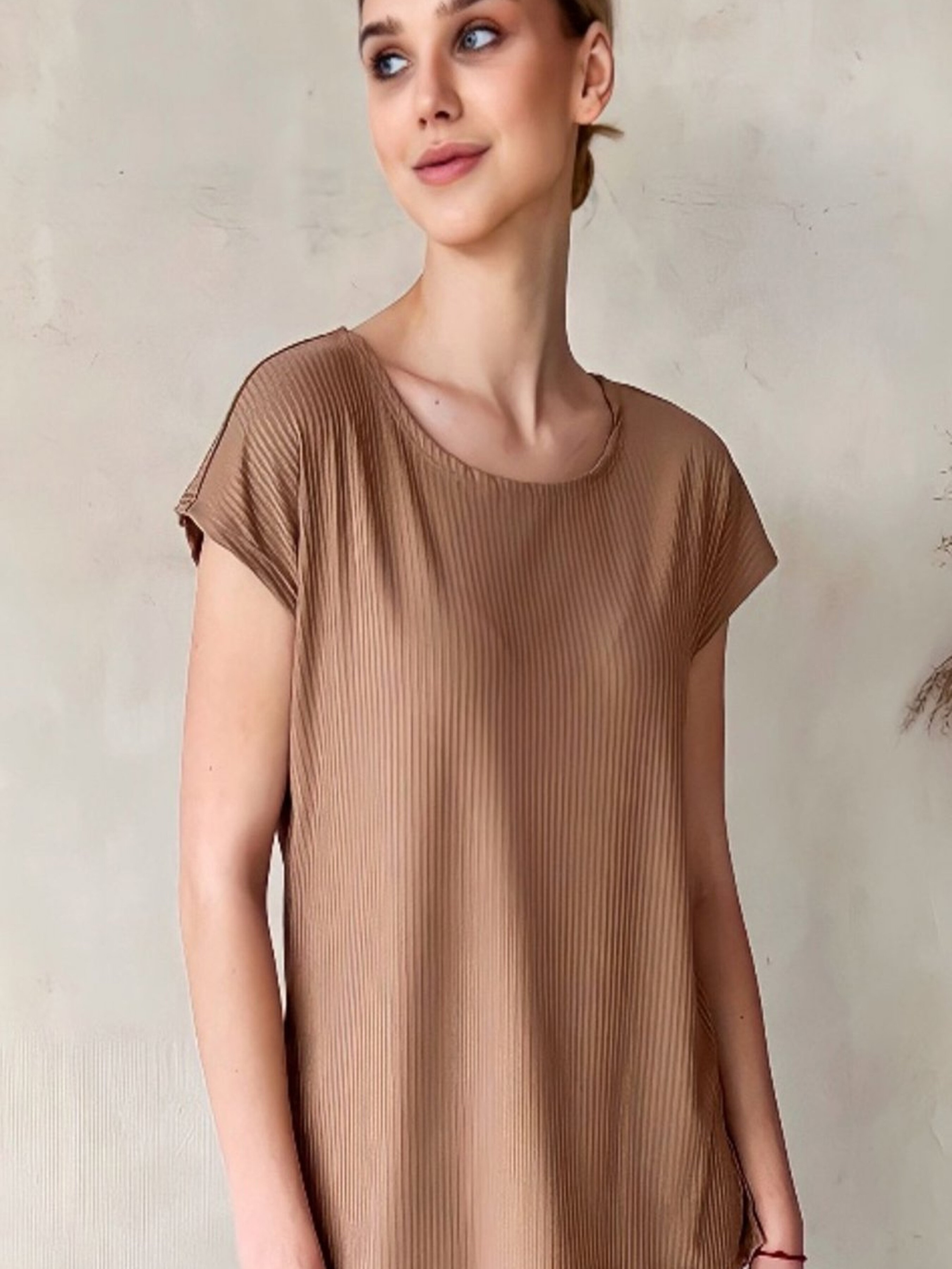 Жіноча бежева футболка з коротким рукавом, з круглим коміром, прямим кроєм, через голову Ця бежева жіноча футболка з коротким рукавом поєднує в собі стиль та комфорт для створення елегантних та невимушених образів. Класичний круглий комір і прямий крій додають універсальності, роблячи її підходящою для різних варіантів стилізації. Легка посадка через голову забезпечує зручність і практичність у повсякденному носінні. Особливості: Короткий рукав — ідеальний для теплої погоди. Круглий комір — класичний елемент, що додає елегантності та універсальності. Прямий крій — комфортний і стильний, підходить для різних типів фігур. Легкий матеріал — ідеальний для літніх днів, забезпечуючи комфорт протягом дня. Через голову — зручне і швидке одягання.Рекомендації по стилізації: Для casual-образу поєднуйте футболку з джинсами або спідницею та зручними кросівками чи сандалями. Для більш елегантного вигляду носіть її з класичними брюками або спідницею, доповнивши образ стильними аксесуарами. Завершіть образ капелюхом і сонцезахисними окулярами для літнього луку. Ця бежева футболка з коротким рукавом — універсальний і зручний елемент вашого гардеробу, який підходить для повсякденних образів.