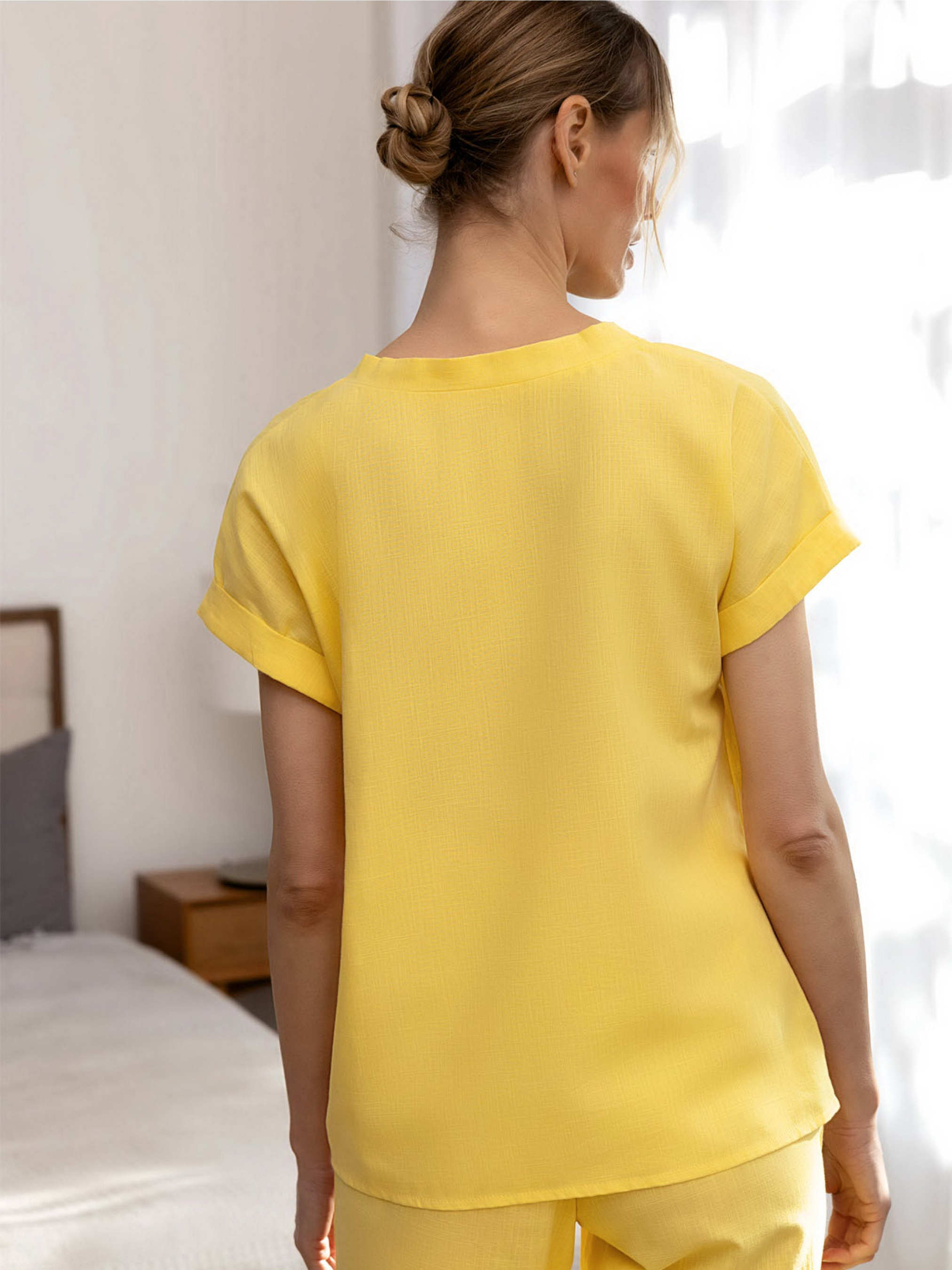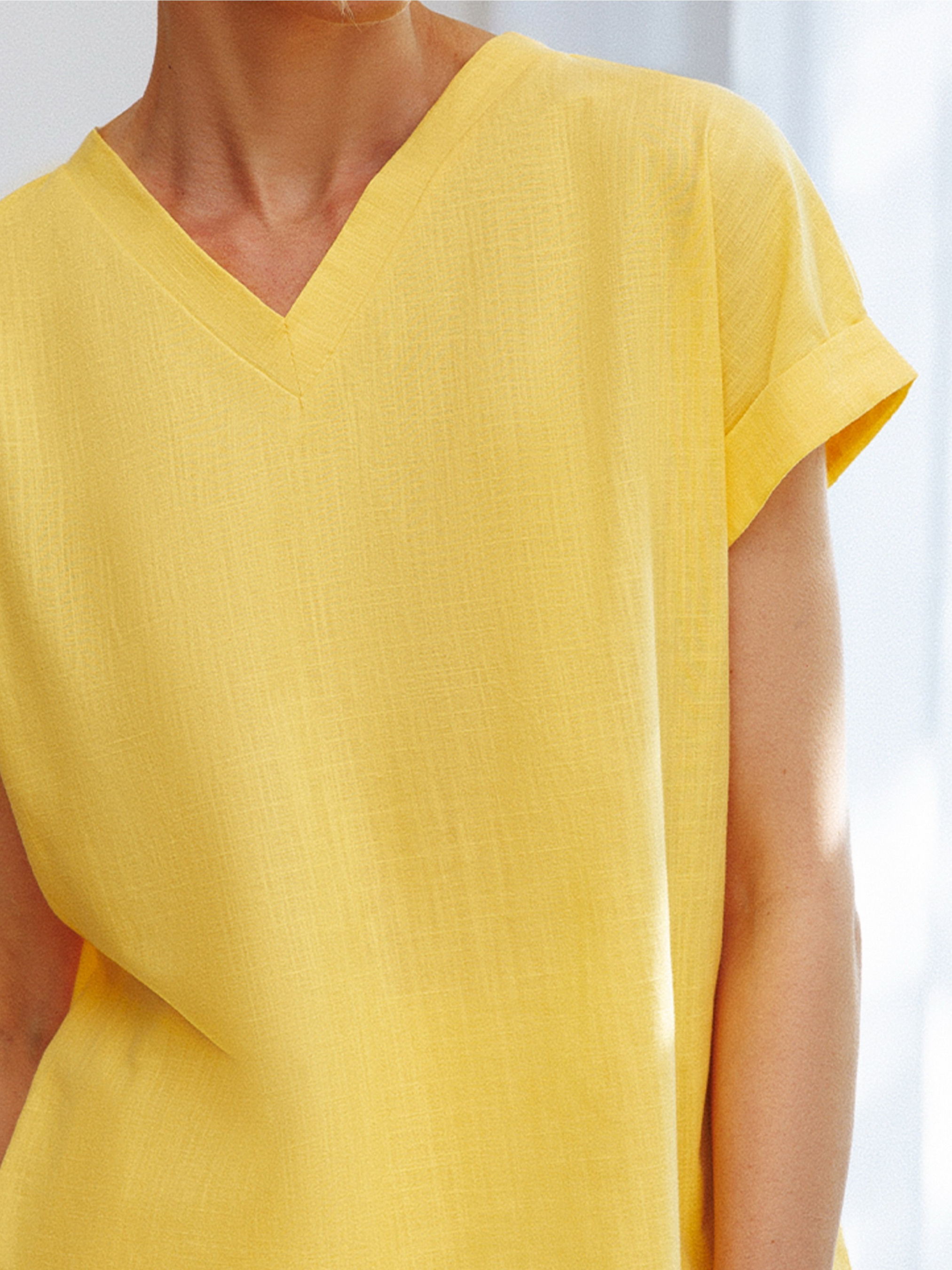 Жінка, яка розуміє, що життя повинно бути яскравим та стильним, неодмінно вибере наш чудовий джемпер - футболка жовтого кольору. Ця модель із колекції Оаsis втілення сонячності та стилю. Вільний крій дарує відчуття свободи, а трикутний комір додає нотку креативності. Короткі рукава з манжетами додають джемперу вишуканості. Ти можеш носити його вдома, на прогулянках або вдягати для важливих зустрічей, завжди залишаючись справжньою собою. Наша колекція Оаsis підкреслить твою впевненість та бажання жити кольорово та яскраво. Ця футболка ідеально підкреслить твою природну красу та харизму, створюючи неповторний образ сучасної та стильної жінки.