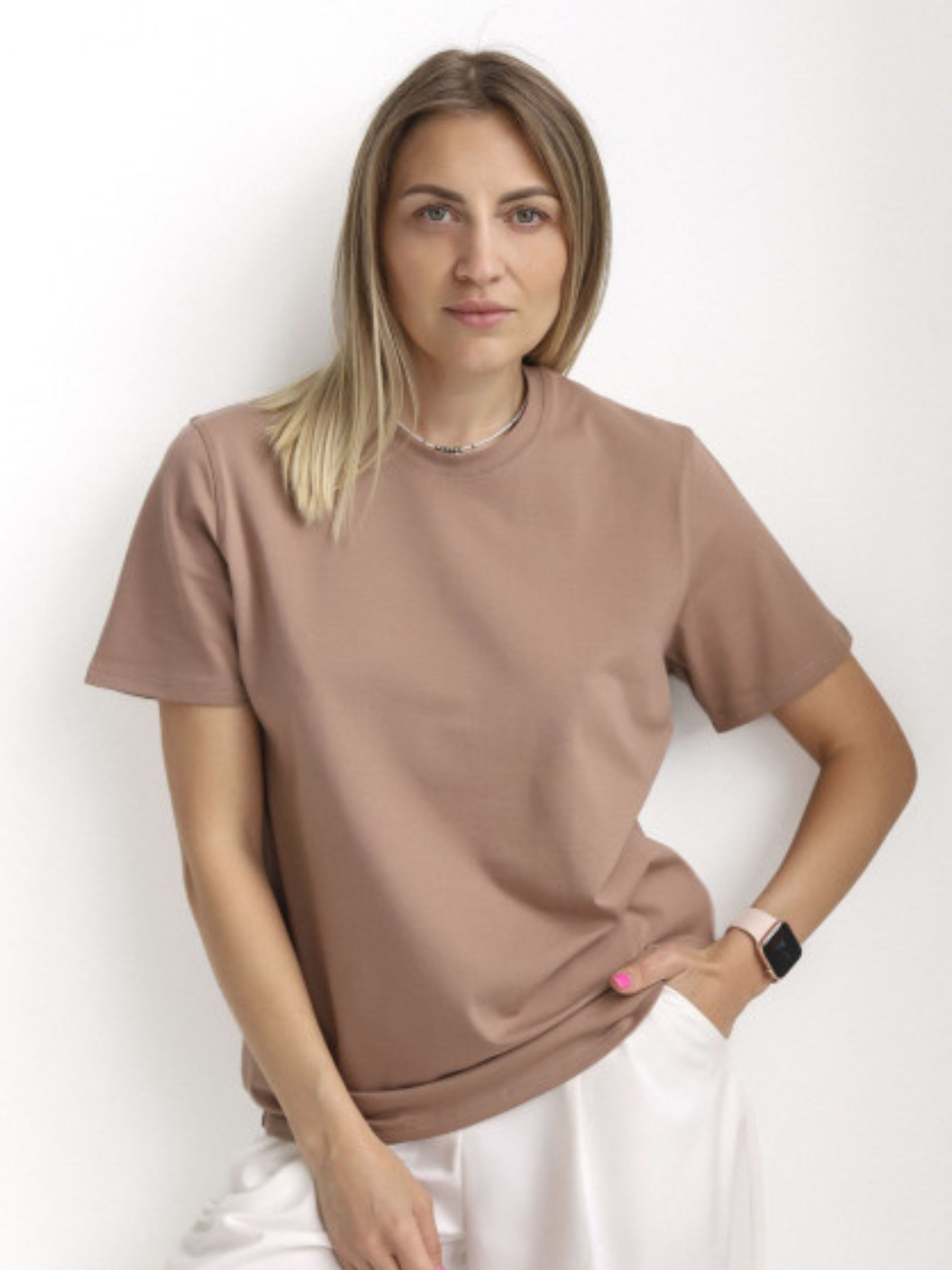Базовая летняя футболка которая должна быть в Вашем гардеробе! Для пошива использовали натуральный хлопок. Благодаря чему обладательница будет чувствовать себя легко и комфортно. Футболка с короткими рукавами и круглым вырезом горловины. В составе ткани есть небольшой процент пластана, что добавляет этой футболке эластичности.