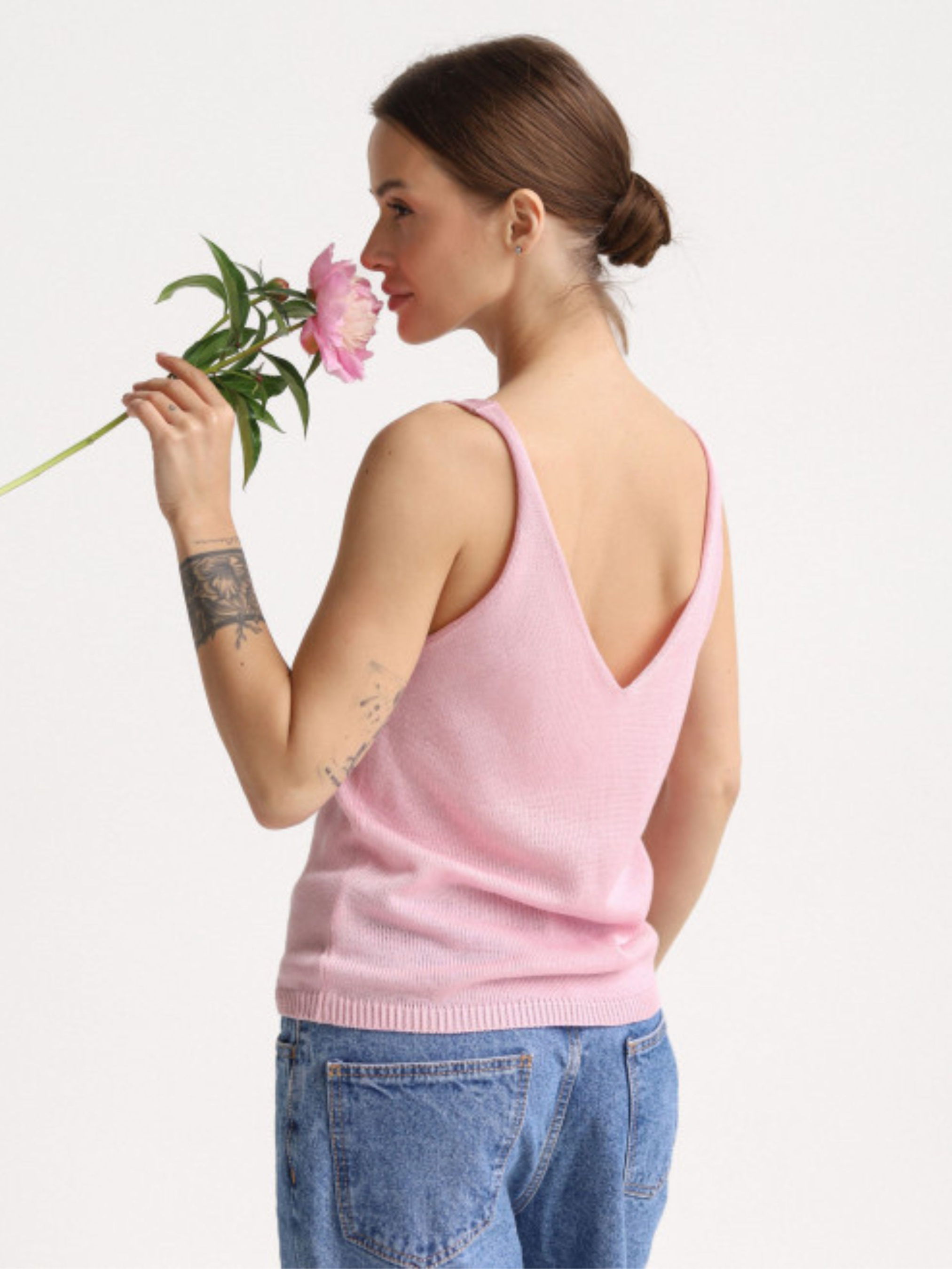 Легкая, дышащая майка из мягкой вязаной ткани – маст-хев для теплых сезонов. Лаконичный крой с V-образным вырезом спереди и на спине придает женственности и изяществу. Благодаря эластичному полотну топ мягко повторяет линии тела, не сковывая движения. Идеально сочетается с льняными брюками, джинсами или юбками – для создания как обыденного, так и более романтического образа.