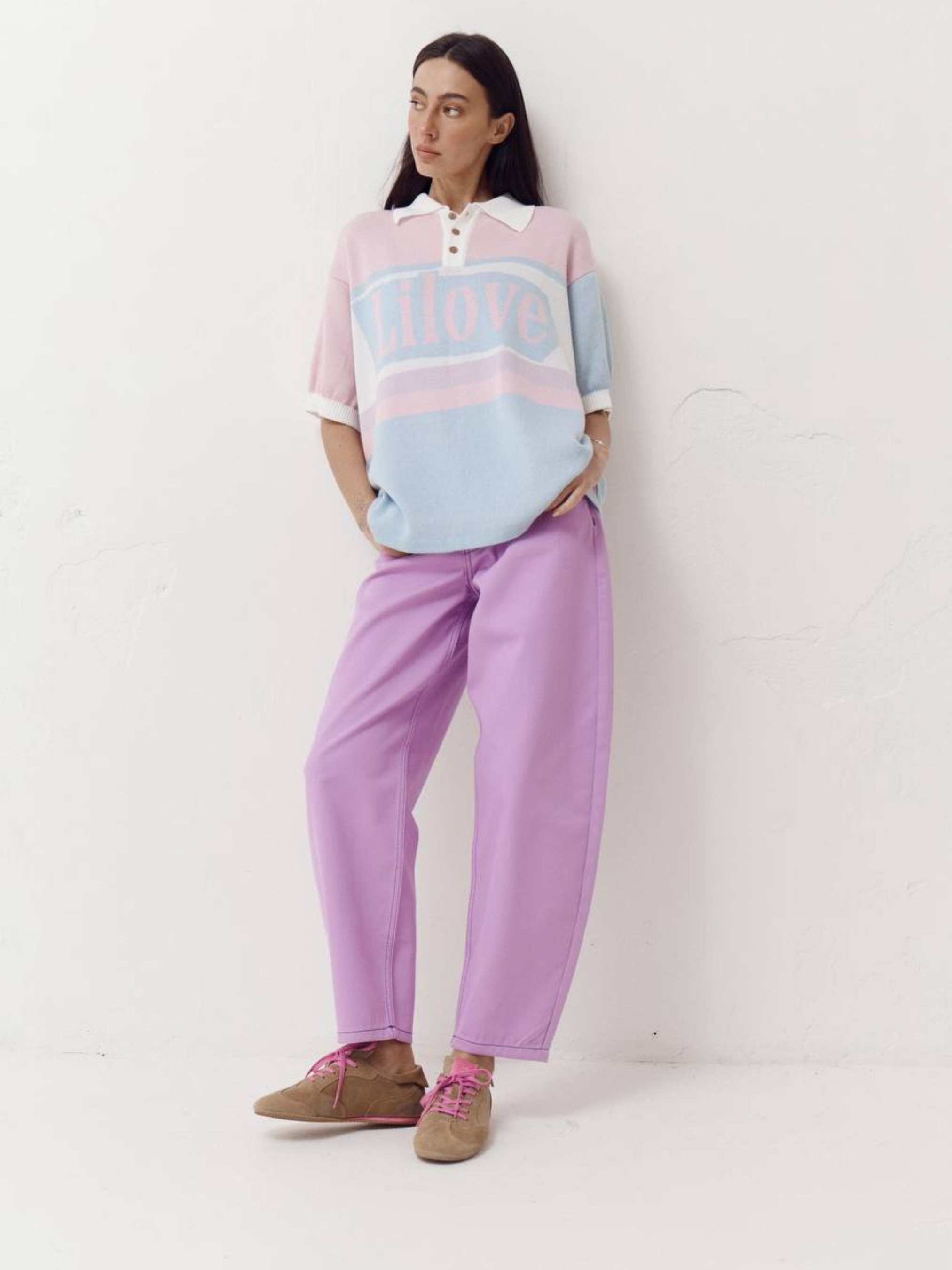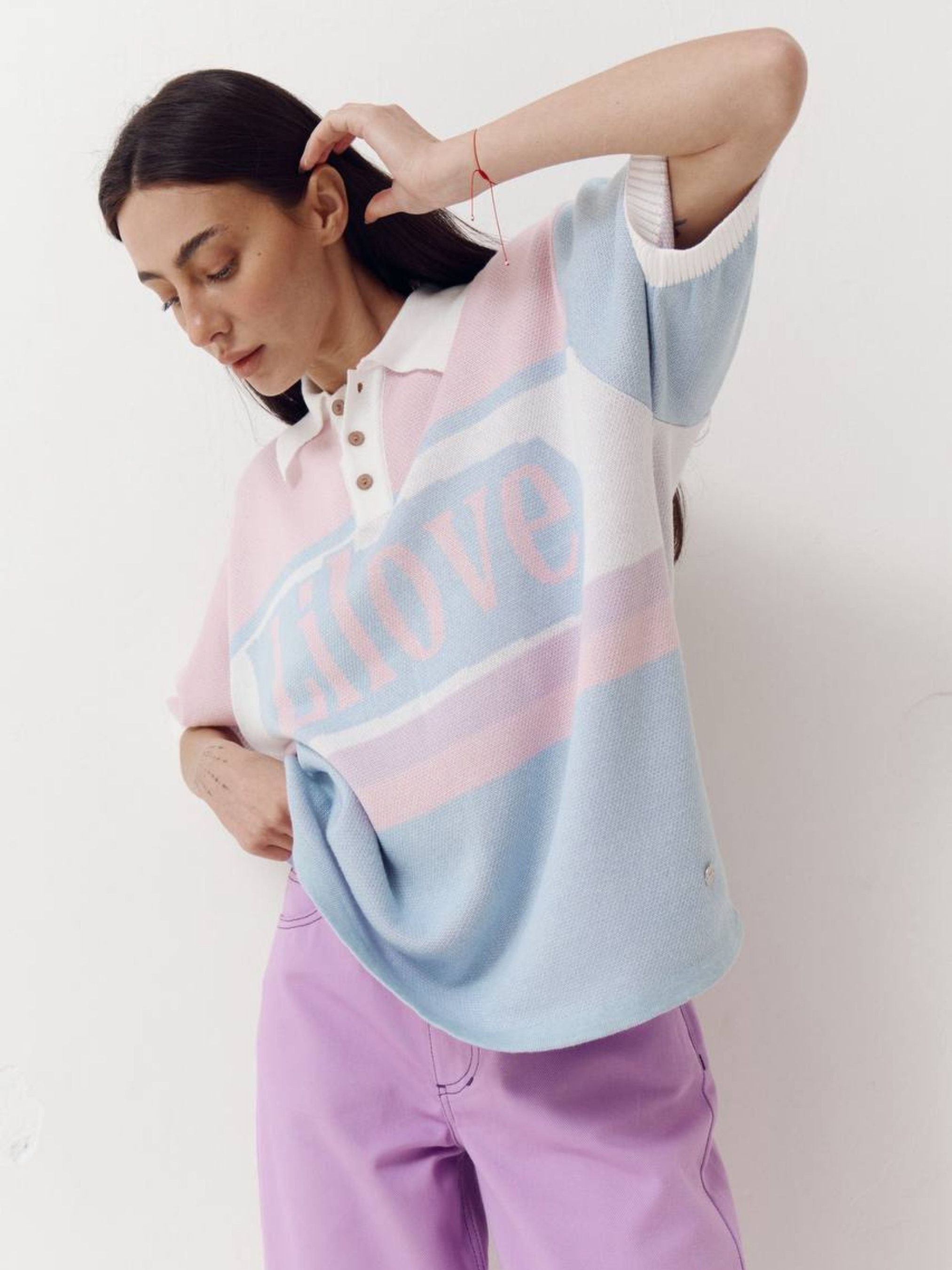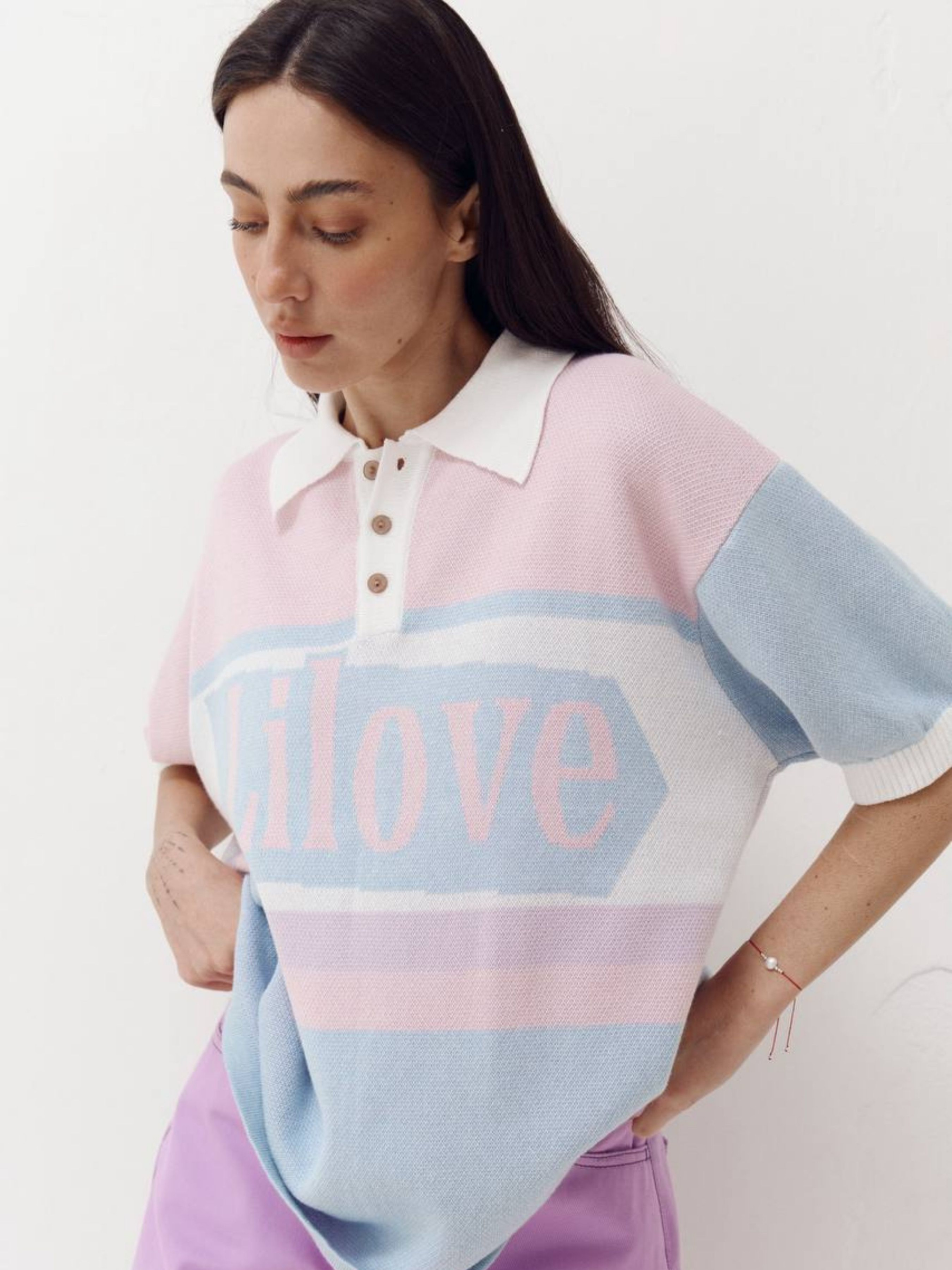 Polo Lilove - Soft Mood Футболка-поло, создающая настроение. Мягкий трикотажный жаккард в нежных цветовых сочетаниях выглядит легко и одновременно выразительно именно тот баланс, который мы любим в Lilove. Свободный силуэт, спущенная линия плеча и щекотливая длина рукава делают эту модель универсальной: она одинаково хорошо смотрится и в расслабленных, и в более собранных образах. Воротник придает структурности, а фирменная надпись Lilove — характер. Идеальная база для ежедневных лугов – от джинсов до юбок или костюмных брюк. ткань: трикотажный жаккард крой: свободный, oversize эффект детали: воротник, пуговицы, фирменная надпись Lilove Состав: 50% хлопок, 50% акрил.