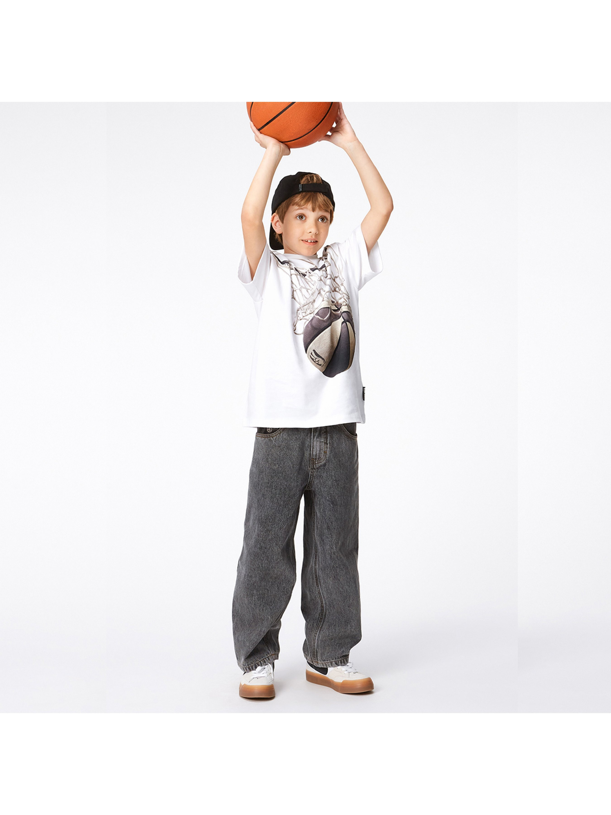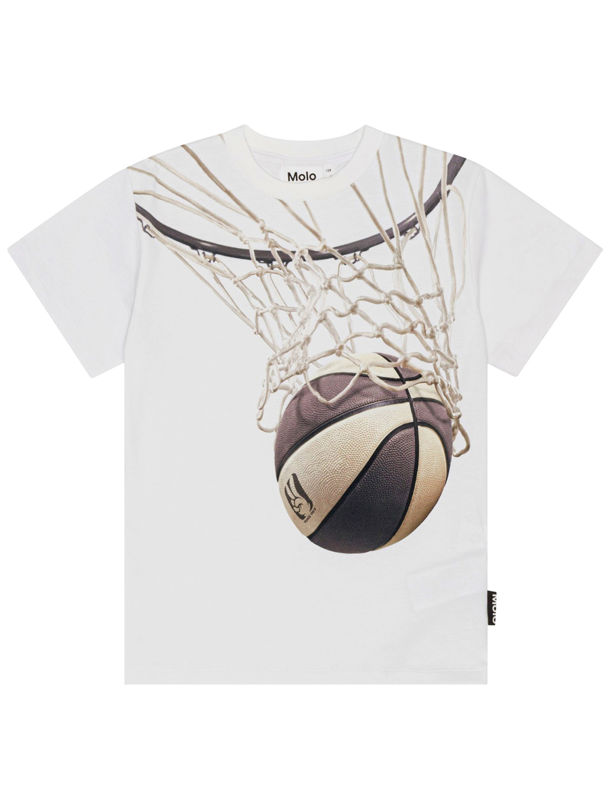 Футболка Molo "Riley Basket Net". Особенности: материал – organic cotton*; декорировано принтом – черно-белый баскетбольный мяч, проходящий сквозь сетку и забивающий решающий гол в игре; сертифицировано GOTS** – изготовлено из сертифицированных органических материалов. *Organic cotton (органический хлопок) – хлопок, выращиваемый без использования вредных химикатов и губительного воздействия на природные ресурсы планеты. **Сертификация GOTS гарантирует, что продукт не содержит опасных химикатов (сертификат GOTS Ecocert Greenlife, №197496). Продукция производится в соответствии с самыми строгими социальными и экологическими стандартами на протяжении всего процесса производства.