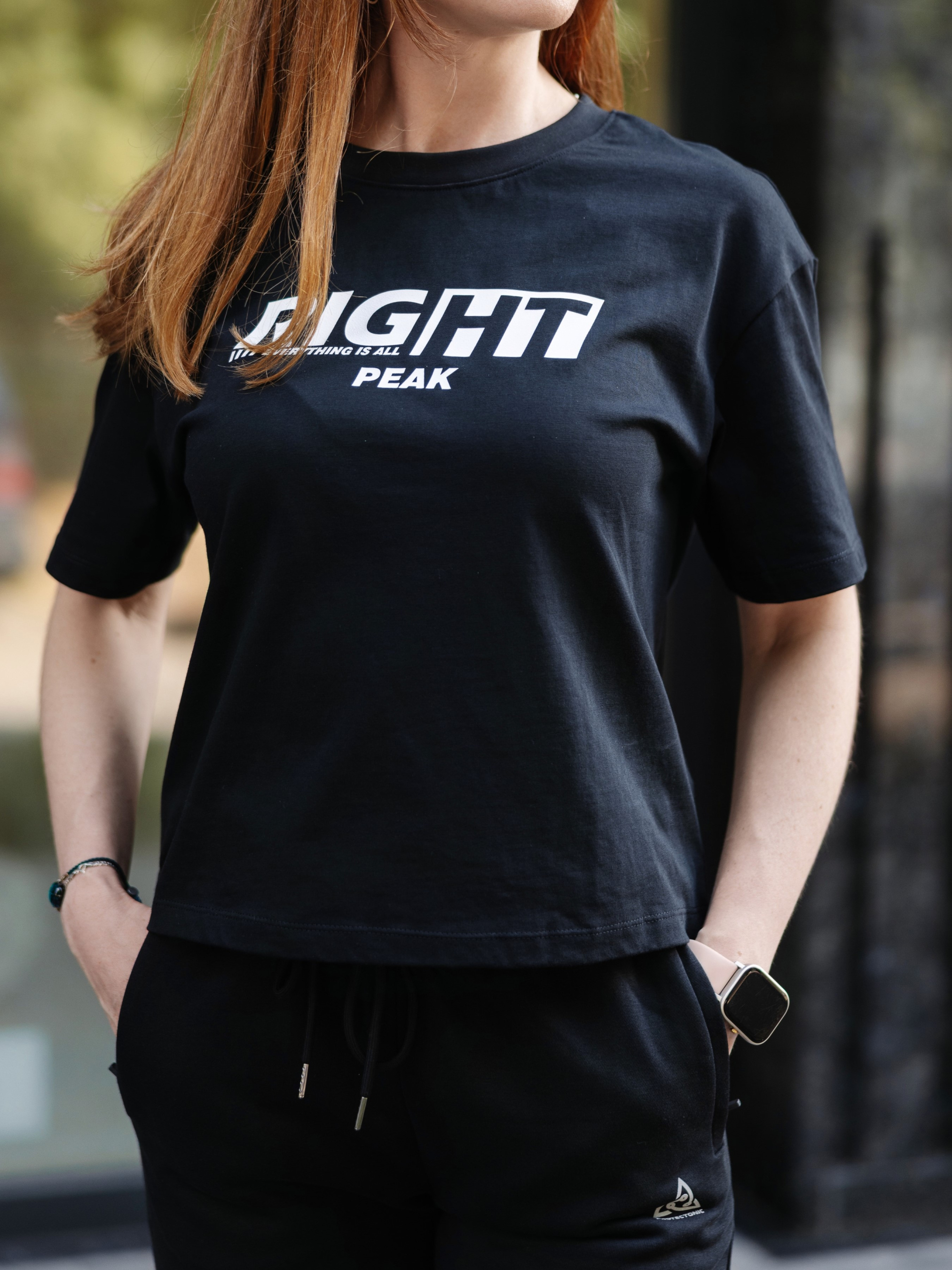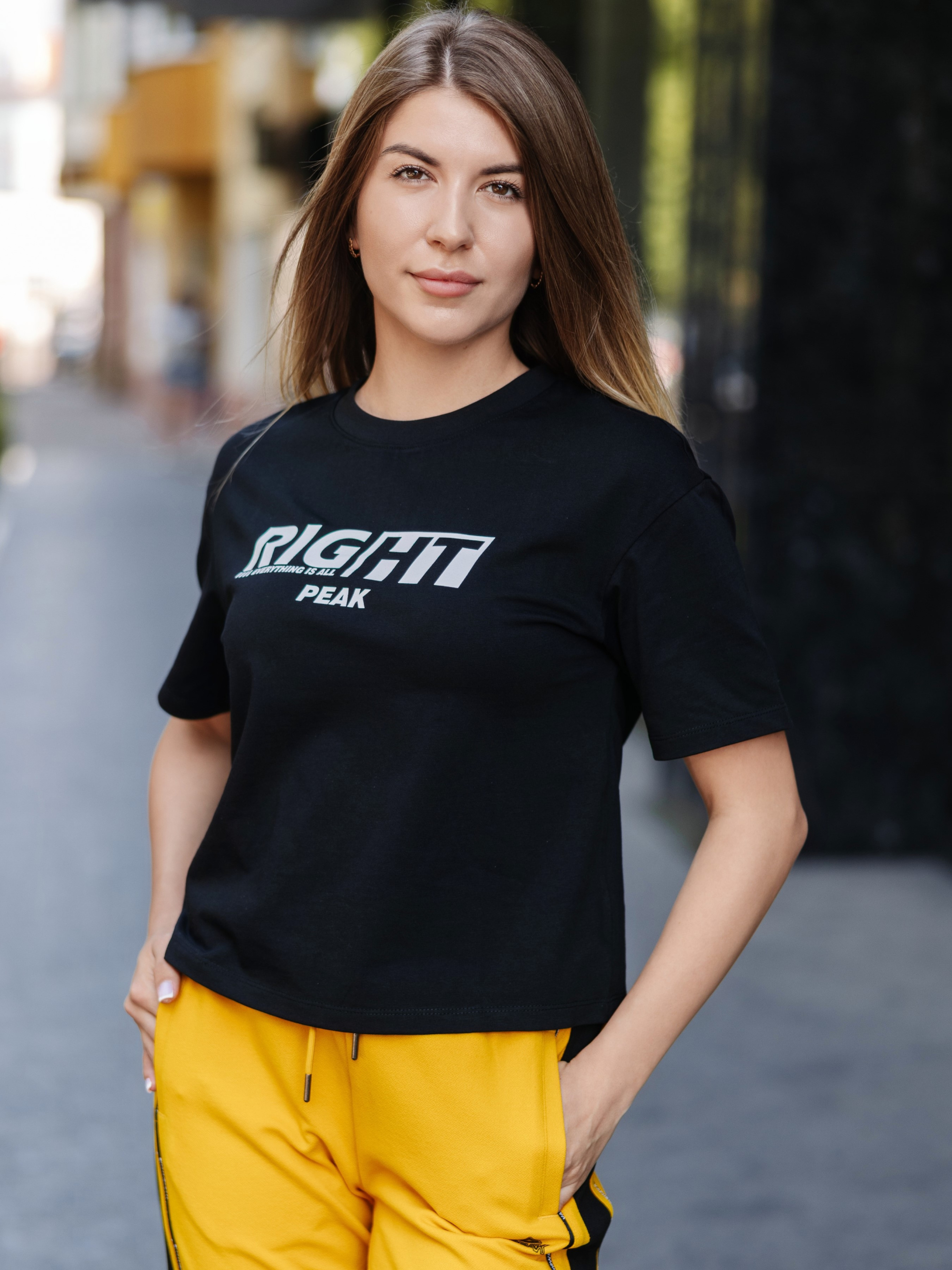 Вільний крій із коротким рукавом та круглим вирізом. Посередині прикрашена написом: “RIGHT everything is all PEAK”. Виготовлена з натуральної, приємної на дотик бавовняної тканини з високою еластичністю. Забезпечує комфорт і свободу рухів. Стильна та комфортна жіноча футболка класичного крою — ідеальний вибір для щоденного носіння та створення невимушеного образу.