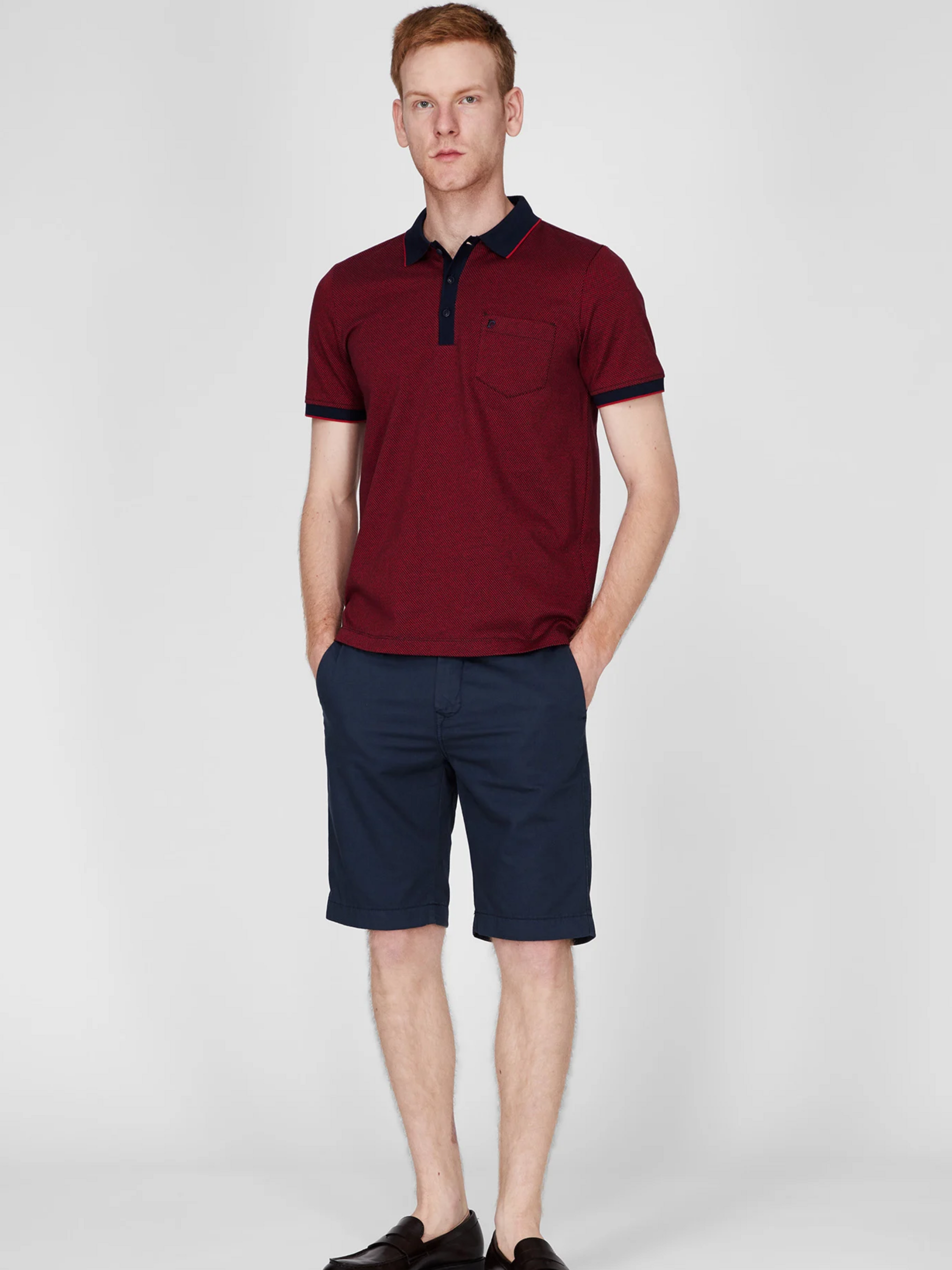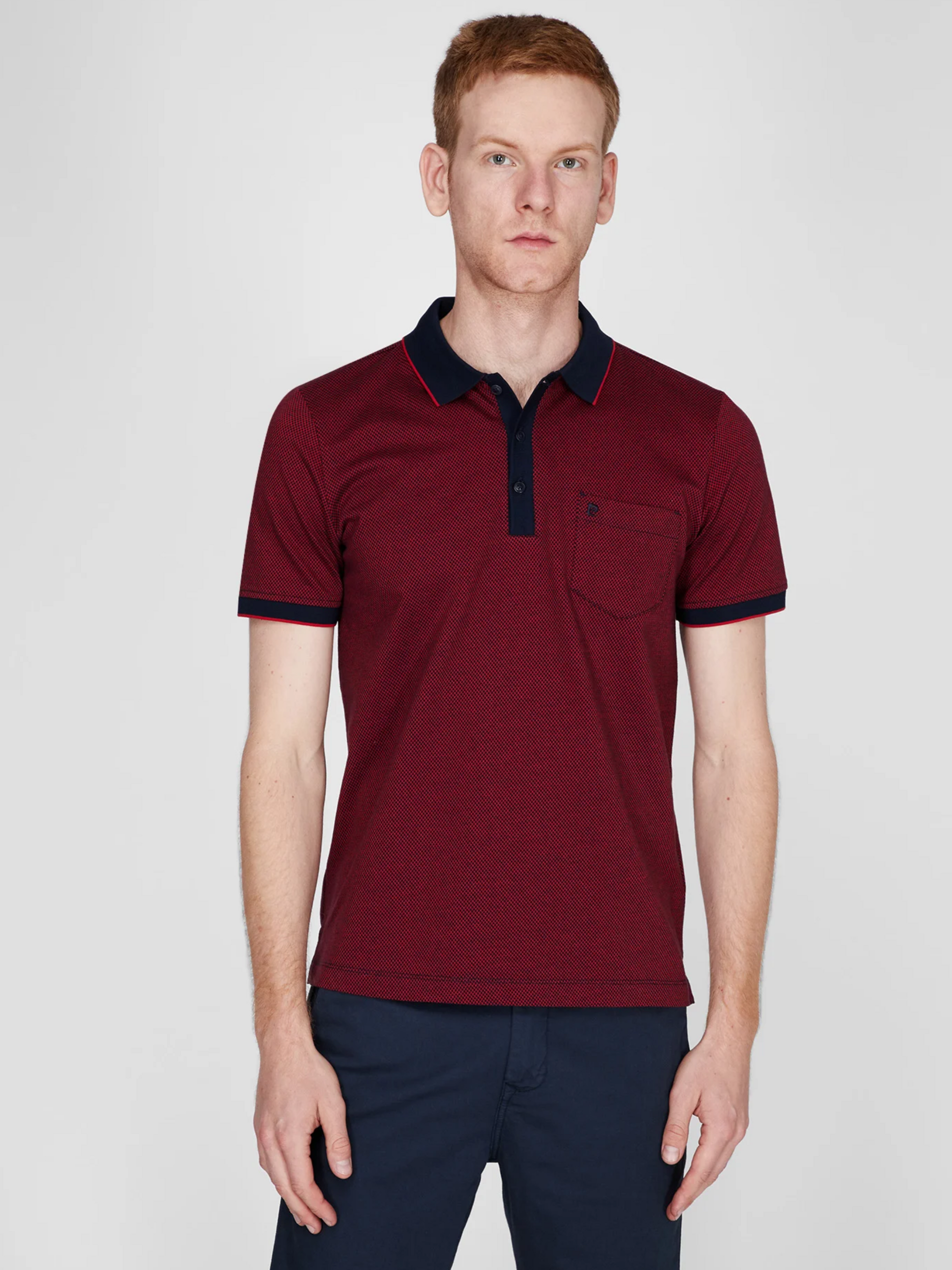 Это поло — настоящая находка для любителей smart-casual стиля с характером. Изящный мелкий рисунок на яркой ткани и современный крой выглядят актуально и элегантно. Основные характеристики: Крой: Modern Fit — слегка приталенный фасон, дарящий свободу движений и подчеркивающий форму фигуры. Состав: 100% мерсеризованный хлопок — гладкий, дышащий, с легким блеском, прочный в носке . Ткань: piqué с двухцветной текстурой — приятная на ощупь и хорошо держит форму . Узор: мелкий графический принт (тонкие точки или геометрические элементы) равномерно по всей поверхности ткани — придает объем и интерес. Цветовая гамма: базовый бордовый тон в сочетании с синим — создает свежий и динамичный образ. Воротник: классический поло-воротник с короткой пуговичной планкой — аккуратно и универсально. Детали: нагрудный карман, логотип Pierre Cardin на груди — сдержанный брендовый акцент . Длина: примерно 70 см в размере M — комфортная посадка для ежедневного ношения. Преимущества: Высокое качество ткани: мерсеризованный хлопок сохраняет цвет и форму даже после многократных стирок. Светлый паттерн: мелкий узор добавляет текстурности без чрезмерной яркости. Брендовый стиль: логотип и нагрудный карман делают образ завершенным. Гармоничная универсальность: легко комбинируется с джинсами, чиносами или кэжуальными шортами.