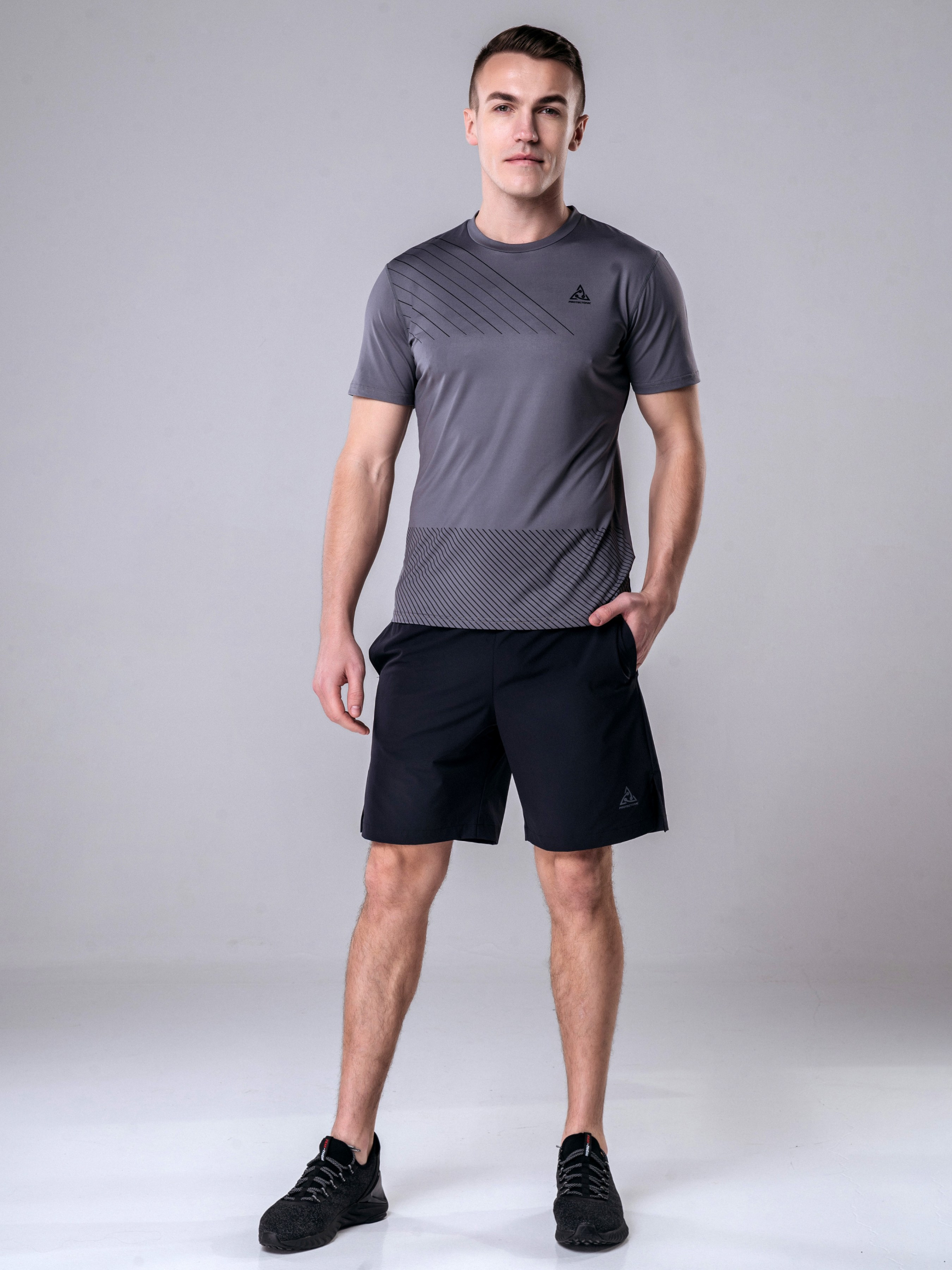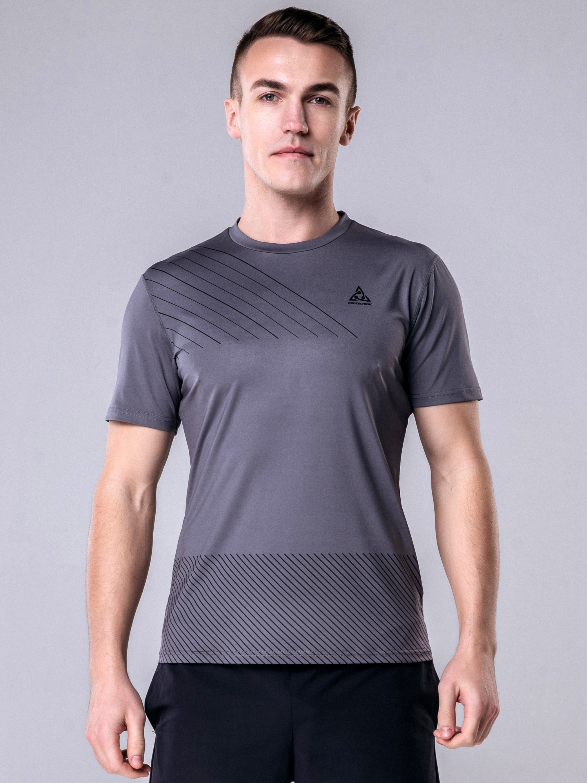 Футболка мужская, серого цвета. - Ткань приятна к телу, эластичная, не сковывает движения. - Поишта по европейским стандартам. - Модель с круглым вырезом и коротким рукавом. - На спине присутствует вставка из сетки для лучшего воздухообмена. - Декорирована косыми полосками черного цвета - Идеальный вариант для занятий спортом как в зале, так и на улице. Материал: 88% полиэстер 12% спандекс