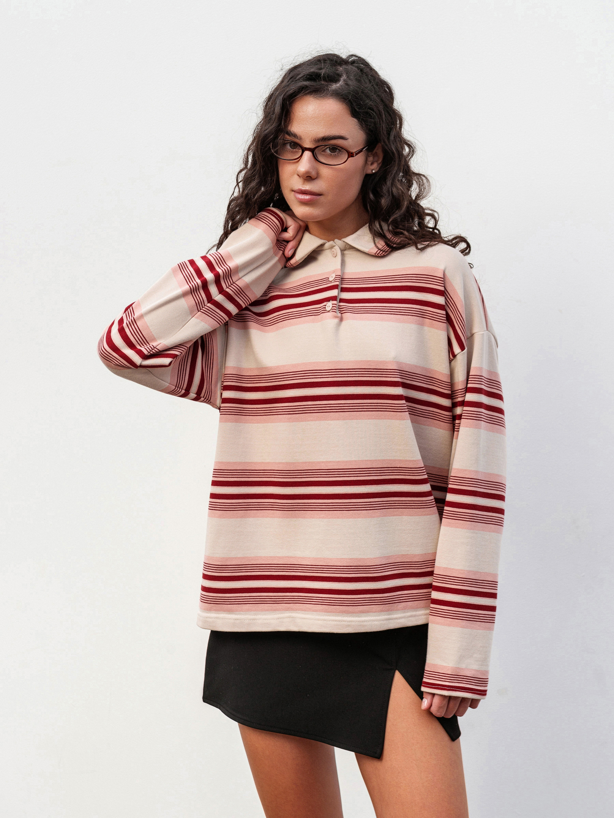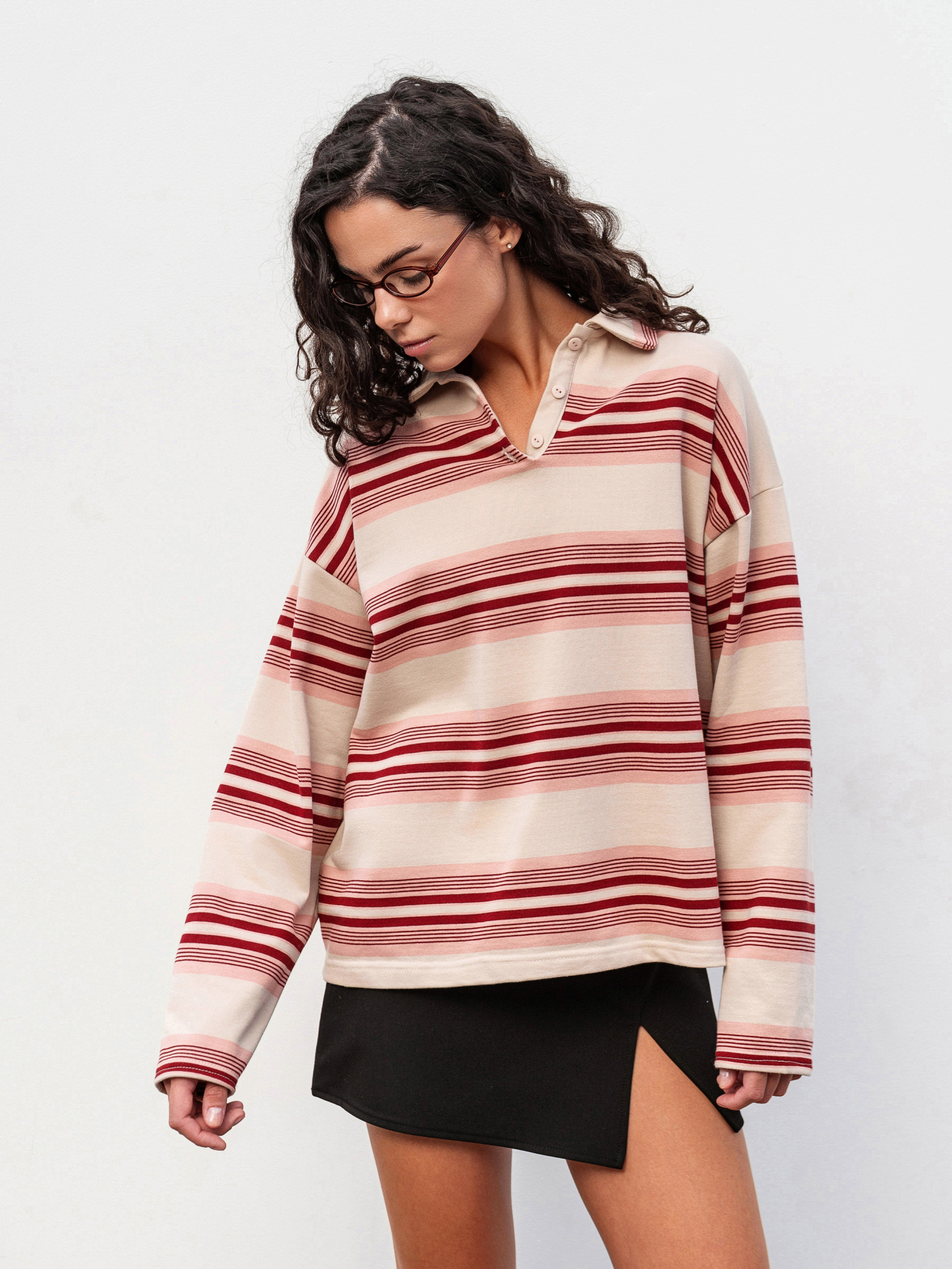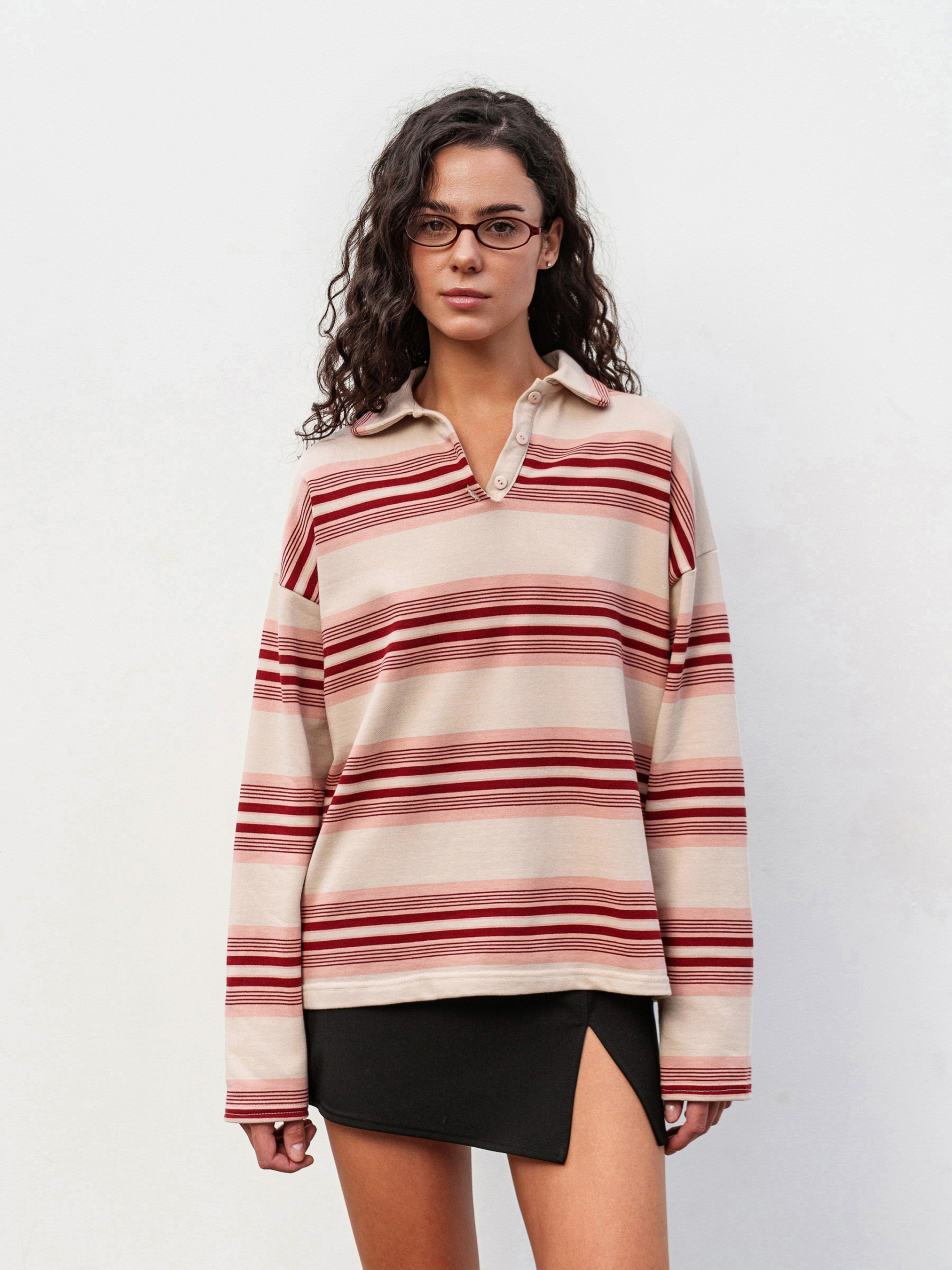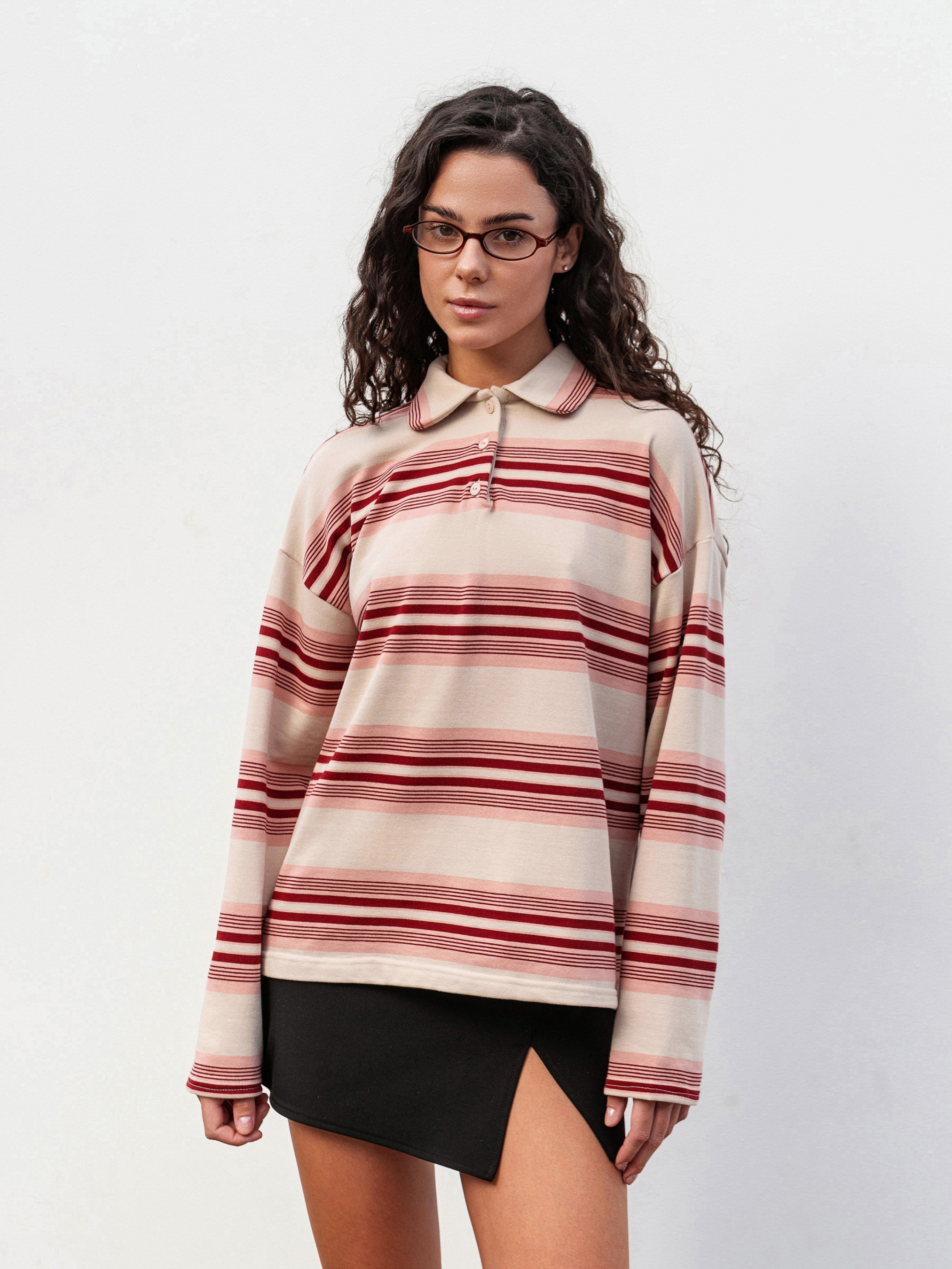 Свободное поло в полоску - стильный акцент для повседневных образов. Выполненное из плотной, но мягкой трехнитевой ткани (70% хлопок, 30% полиэстер), оно приятно к телу и хорошо держит форму. Модель имеет спущенное плечо, полукруглую горловину и небольшие разрезы по бокам для удобства. Благодаря принтованной ткани расположение полоски может незначительно отличаться, делая каждое изделие уникальным. Доступный цвет: молочный в сочетании с полосатым принтом. ХС-С Длина по спине: 61 см Длина рукава: 54 см Полуобхват груди: 52 см Плечи: 53 см Полуобхват талии: 52 см С-М Длина по спине: 61 см Длина рукава: 54 см Полуобхват груди: 55 см Плечи: 55 см Полуобхват талии: 55 см М-Л Длина по спине: 62 см Длина рукава: 55 см Полуобхват груди: 57 см Плечи: 58 см Полуобхват талии: 57 см Л-ХЛ Длина по спине: 62 см Длина рукава: 55 см Полуобхват груди: 60 см Плечи: 58 см Полуобхват талии: 61 см