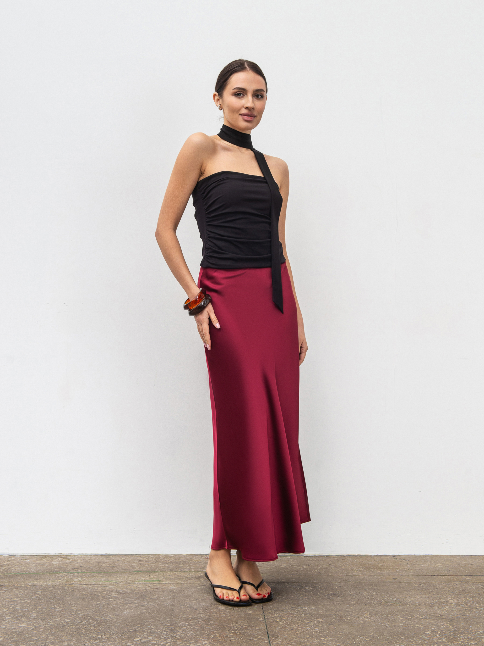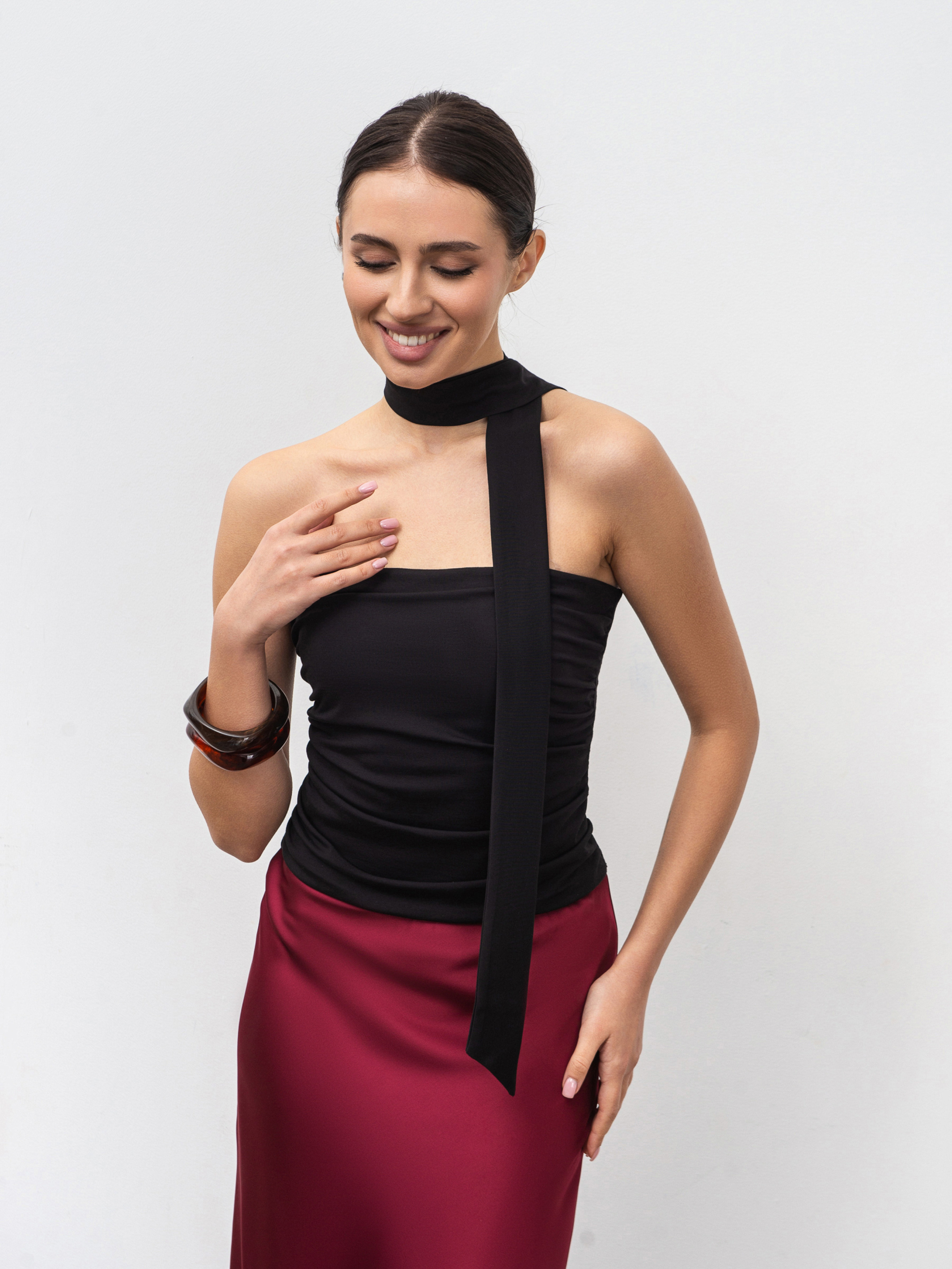 Стильный топ с шарфом-галстуком в комплекте - элегантное сочетание базы и акцента. Модель выполнена из качественного трикотажа (65% вискоза, 30% нейлон, 5% спандекс), который отличается плотностью, эластичностью и приятной текстурой. Спереди двойная ткань и драпировка, которые формируют изящный силуэт и обеспечивают идеальную посадку. Топ легко сочетается как с жакетами или брюками для вечернего выхода, так и с денимом для стильного дневного образа. ХС-С Длина по спине: 32 см Полуобхват груди: 32 см Полуобхват талии: 28 см С-М Длина по спине: 32 см Полуобхват груди: 34 см Полуобхват талии: 29 см М-Л Длина по спине: 35 см Полуобхват груди: 36 см Полуобхват талии: 32 см Л-ХЛ Длина по спине: 35 см Полуобхват груди: 37 см Полуобхват талии: 34 см