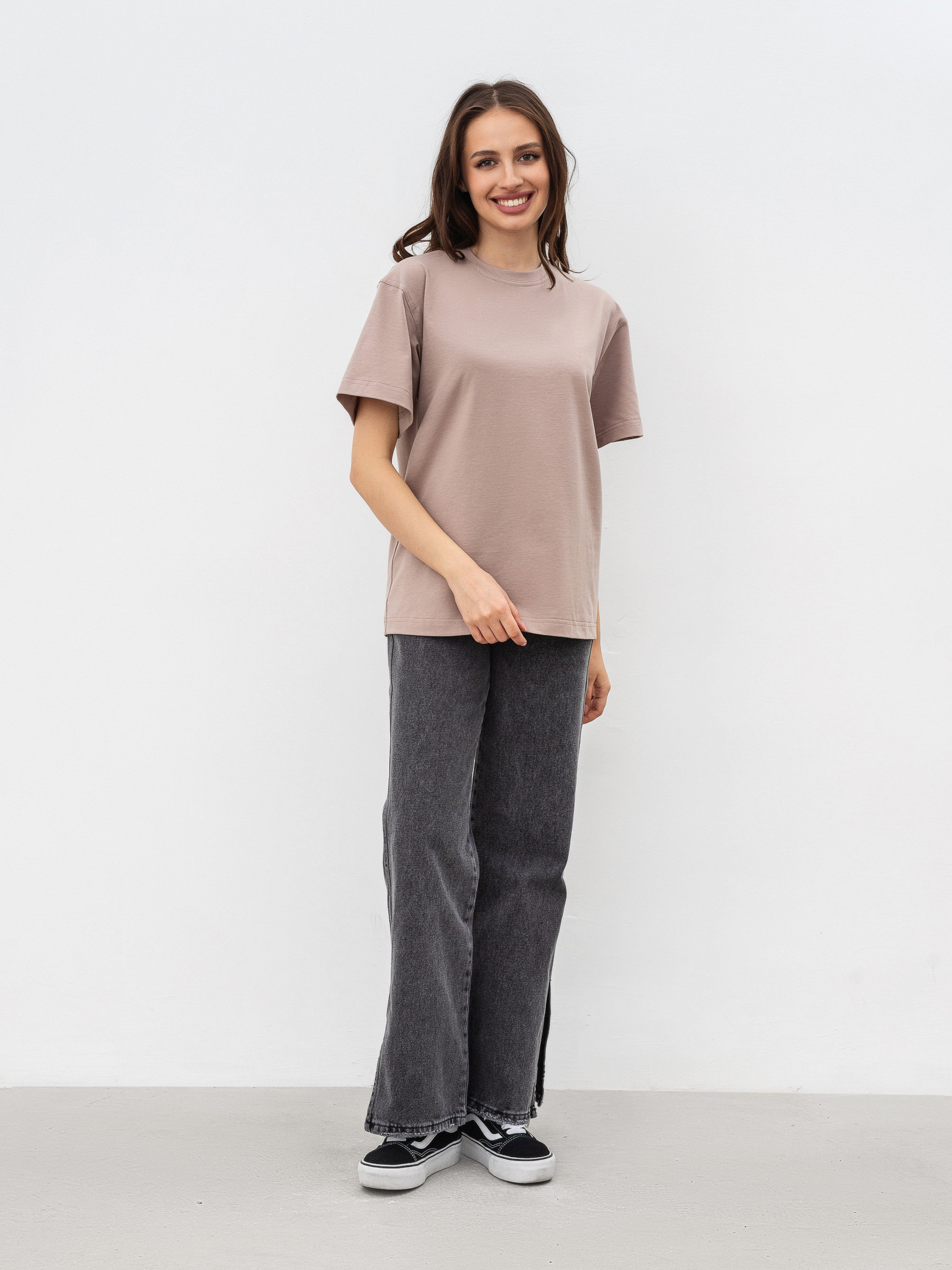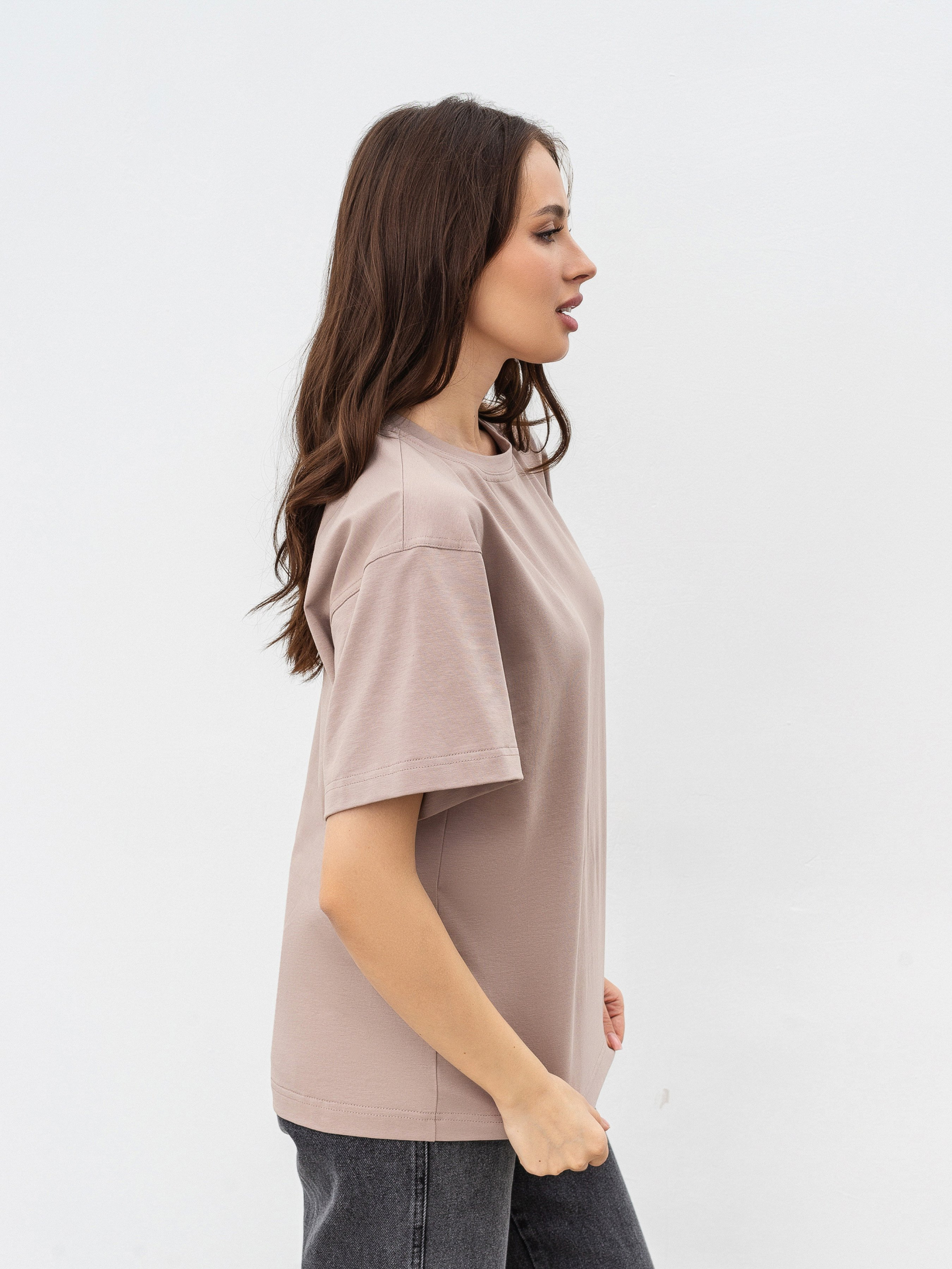 Идеальная базовая футболка на все случаи жизни в 6 цветах. Фасон оверсайз. Выполнена из мягкого и приятного материала кулир (50% хлопок, 47% вискоза, 3% эластан). Хорошо держит форму. За счет качественно обработанных швов, широких рукавов и плотного материала выглядит качественно и дорого. Можно сочетать абсолютно со всем джинсами, классическими брюками, юбками, шортами, леггинсами. Будет служить идеальной базой для многослойных образов на весенне-осенний сезон и совершенным верхом на лето. Прослужит вам много сезонов подряд. Советуем брать сразу в нескольких цветах ;) Советуем выбрать вариант футболки Petite девушкам невысокого роста или высоким девушкам, которые хотят более короткий вариант футболки. Цвет изделия на фотографии может отличаться от реального цвета товара, что связано с особенностями цветопередачи на мониторе, настройками фотоаппаратуры или другими факторами. Длина по спине : 63 см Длина рукава : 20 см Полуобхват груди : 48 см Плечи : 47 см Ширина по низу : 49 см