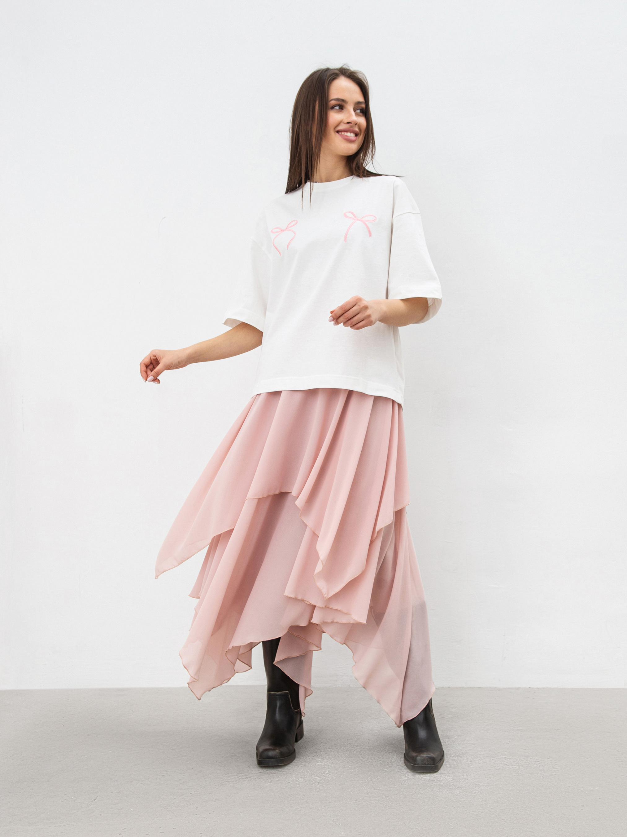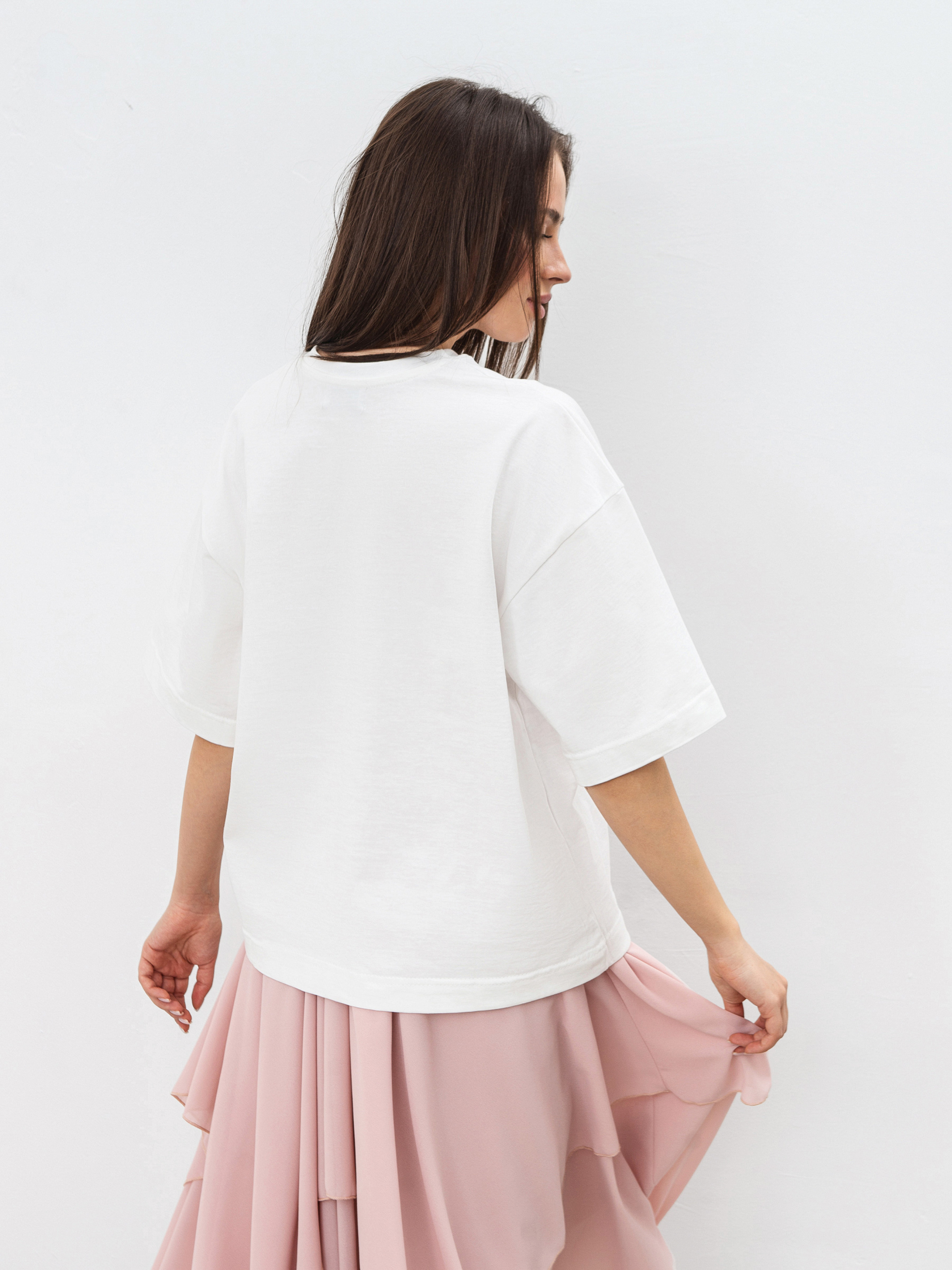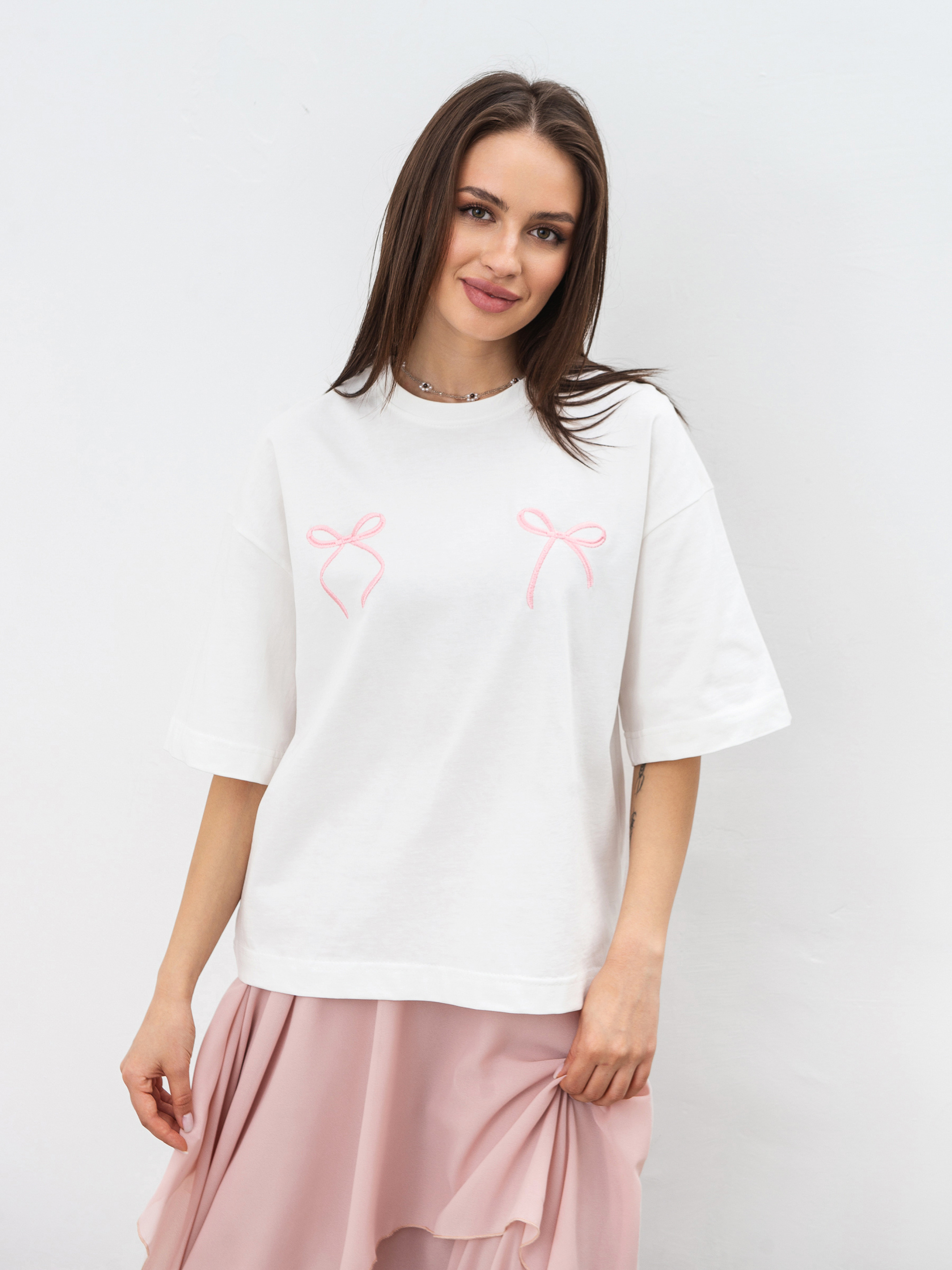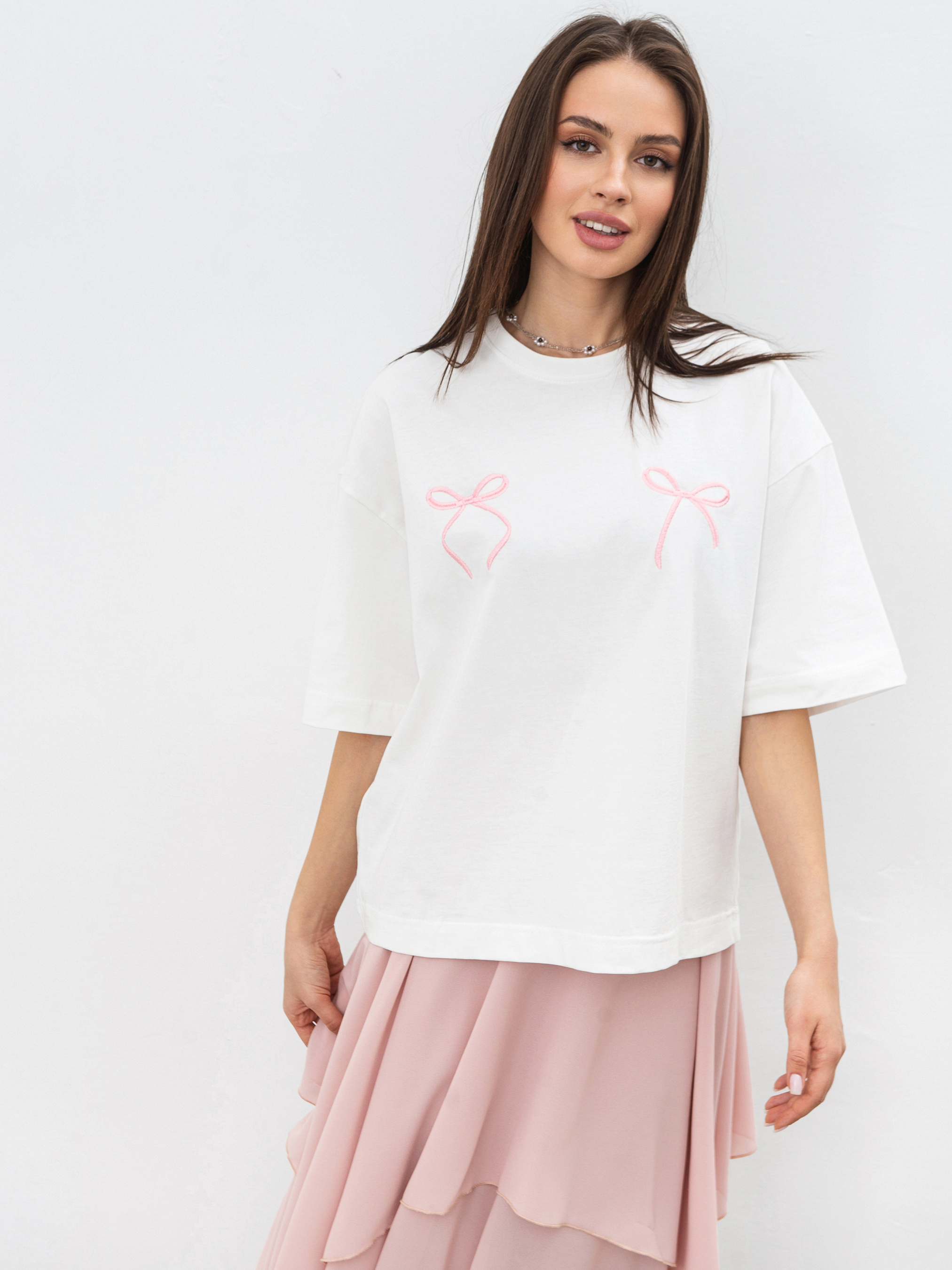 Футболка, которая сочетает базовый крой и изысканные детали. Она имеет прямой силуэт и спущенную линию плеча, что добавляет легкости и непринужденности в образ. Особый акцент - вышивка в виде двух бантов по линии груди, что придает модели нежности и оригинальности. Изготовленная из качественного трикотажа кулир, футболка приятна к телу, хорошо пропускает воздух и комфортна в носке. Натуральный состав (100% хлопок) обеспечивает мягкость и износостойкость. Универсальный молочный цвет легко сочетается с другими оттенками, что позволяет создавать как базовые, так и более выразительные образы. Идеальный вариант для демисезона - носите самостоятельно или под жакеты и кардиганы. Лаконичная, но с изюминкой - эта футболка станет стильным акцентом в гардеробе.