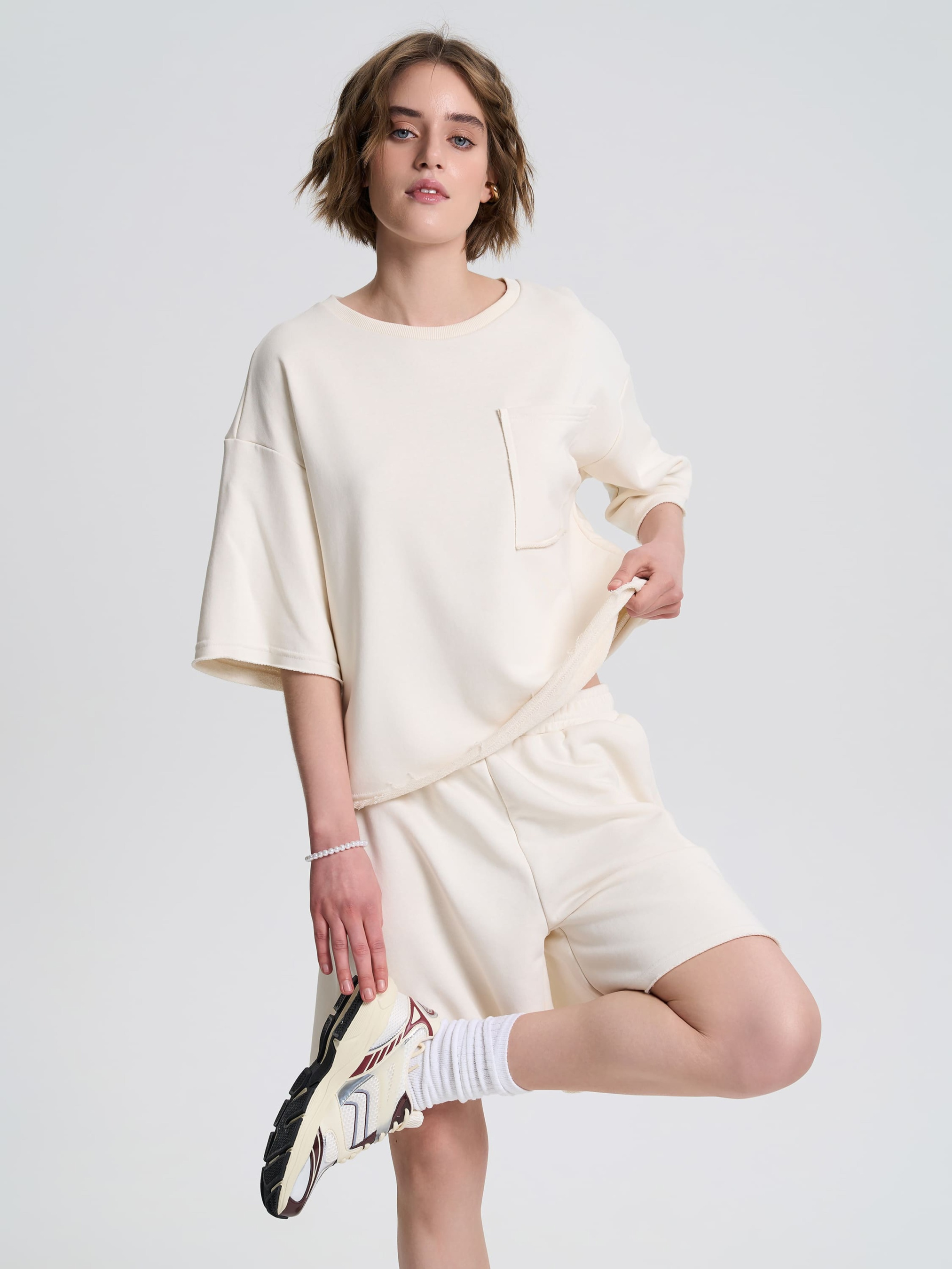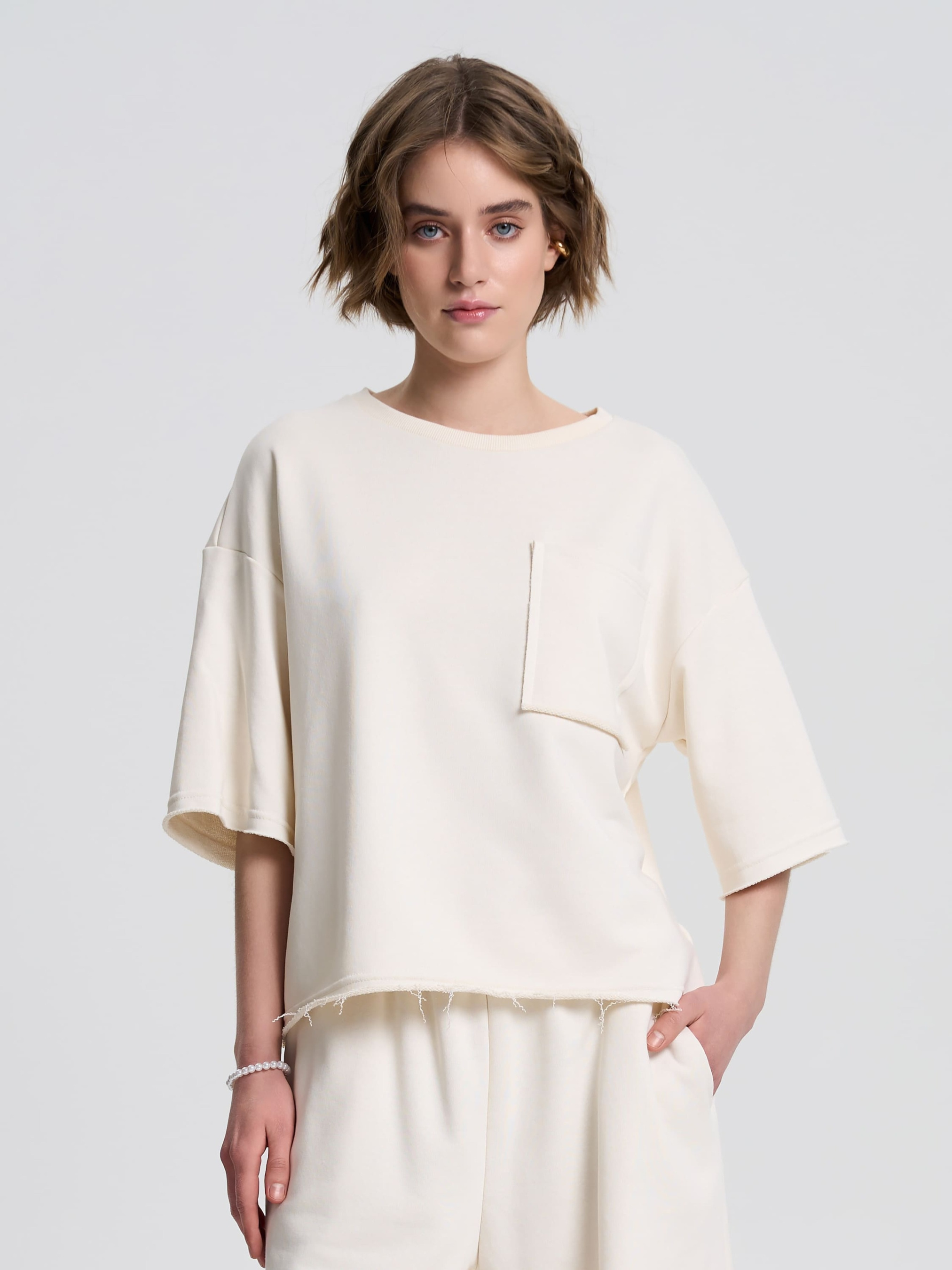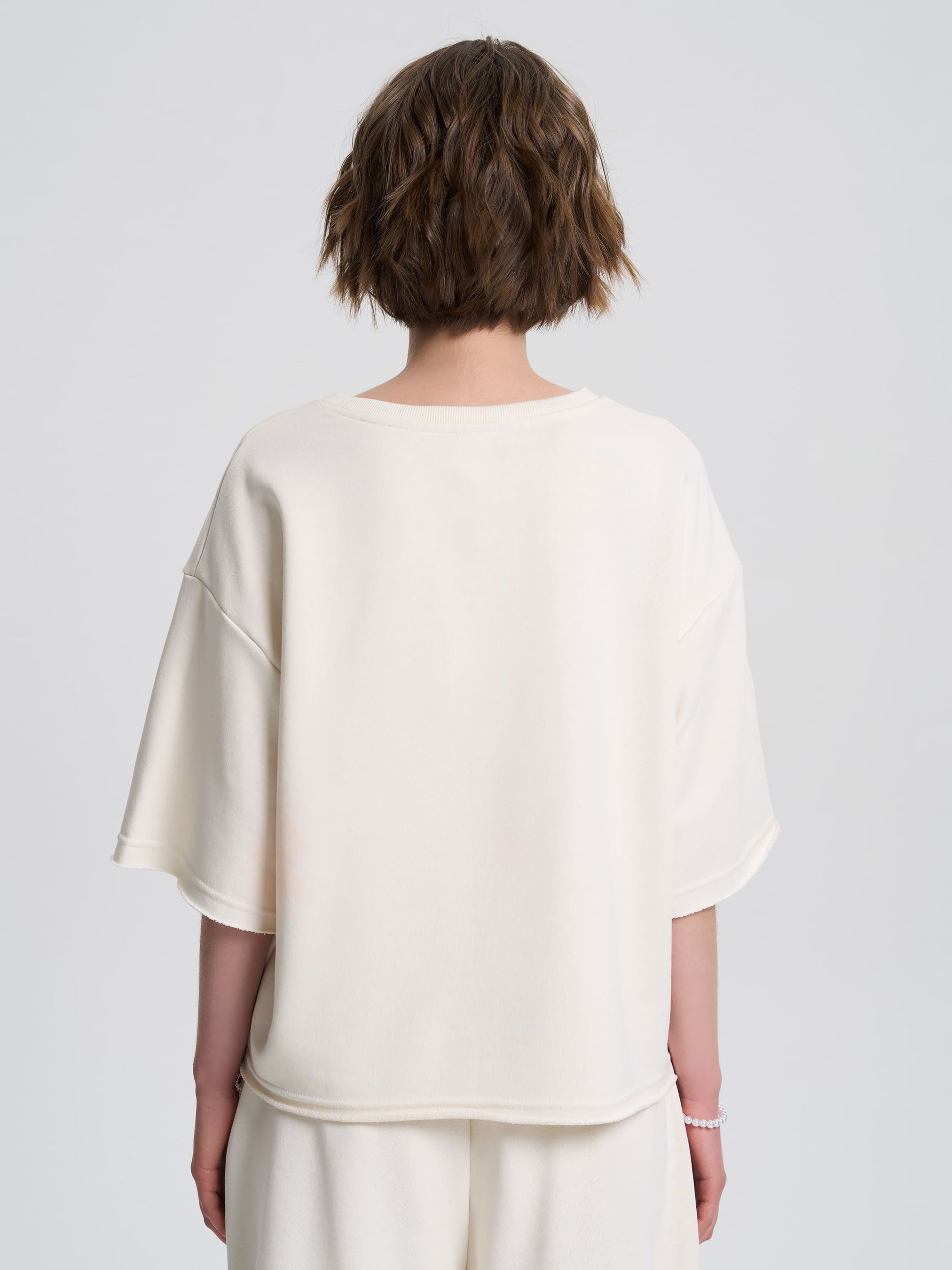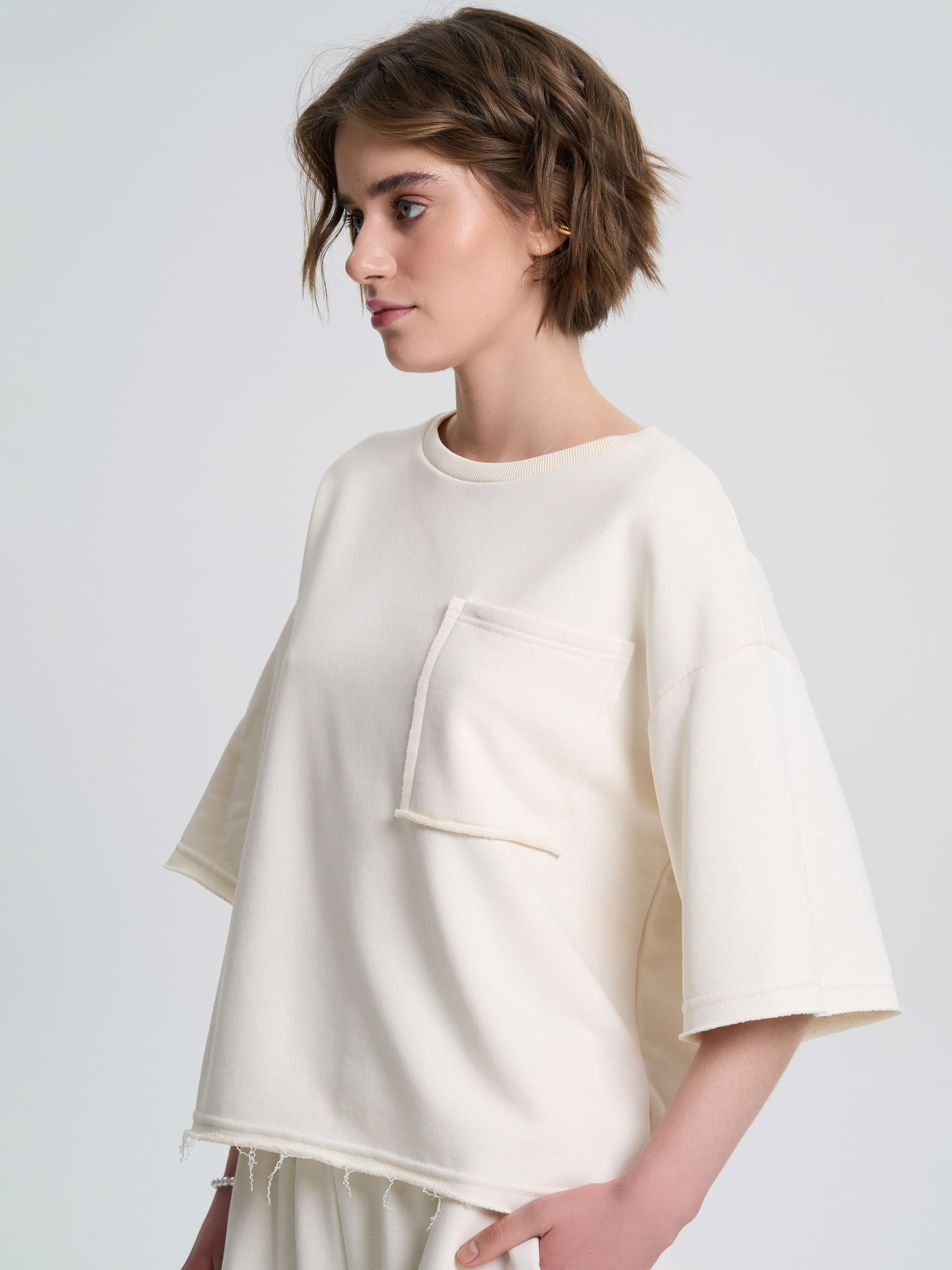 Футболка свободного кроя из плотной хлопковой ткани – идеальный выбор для стильных и комфортных образов. Приспущенный удлиненный рукав придает непринужденность, а необработанные края низа, рукавов и накладного кармана создают эффект легкой небрежности, что является особенностью этой модели. Лучше всего сочетается с шортами с необработанным краем (артикул 240612) для гармоничного завершения образа. Материал Ткань с тремя составляющими, состоящая из петелек. На изнанке ткани приятный гриф в виде петель. Технология производства обеспечивает полотну плотность, прочность и долговечность. Практичный, натуральный материал, стойкий к деформации. Хорошо пропускает воздух и отлично впитывает влагу, поддерживая комфортную температуру тела. Рекомендации по уходу Изделия из трехнитки рекомендуется стирать либо вручную, либо в стиральной машине в деликатном режиме при температуре не выше 30 градусов.