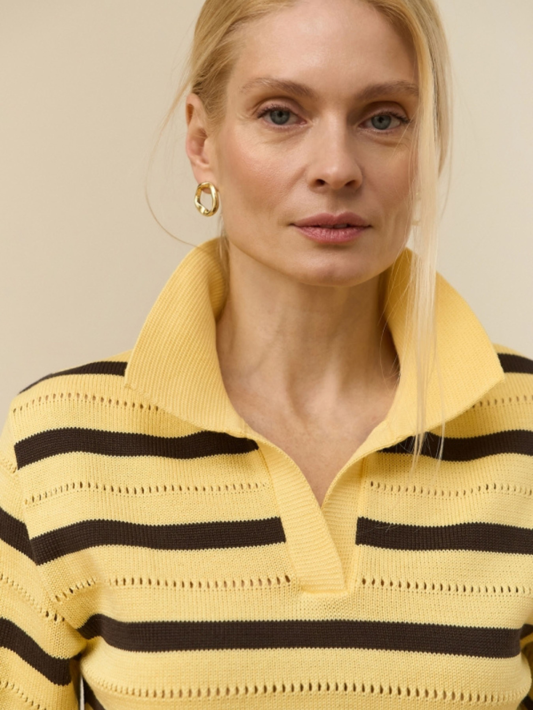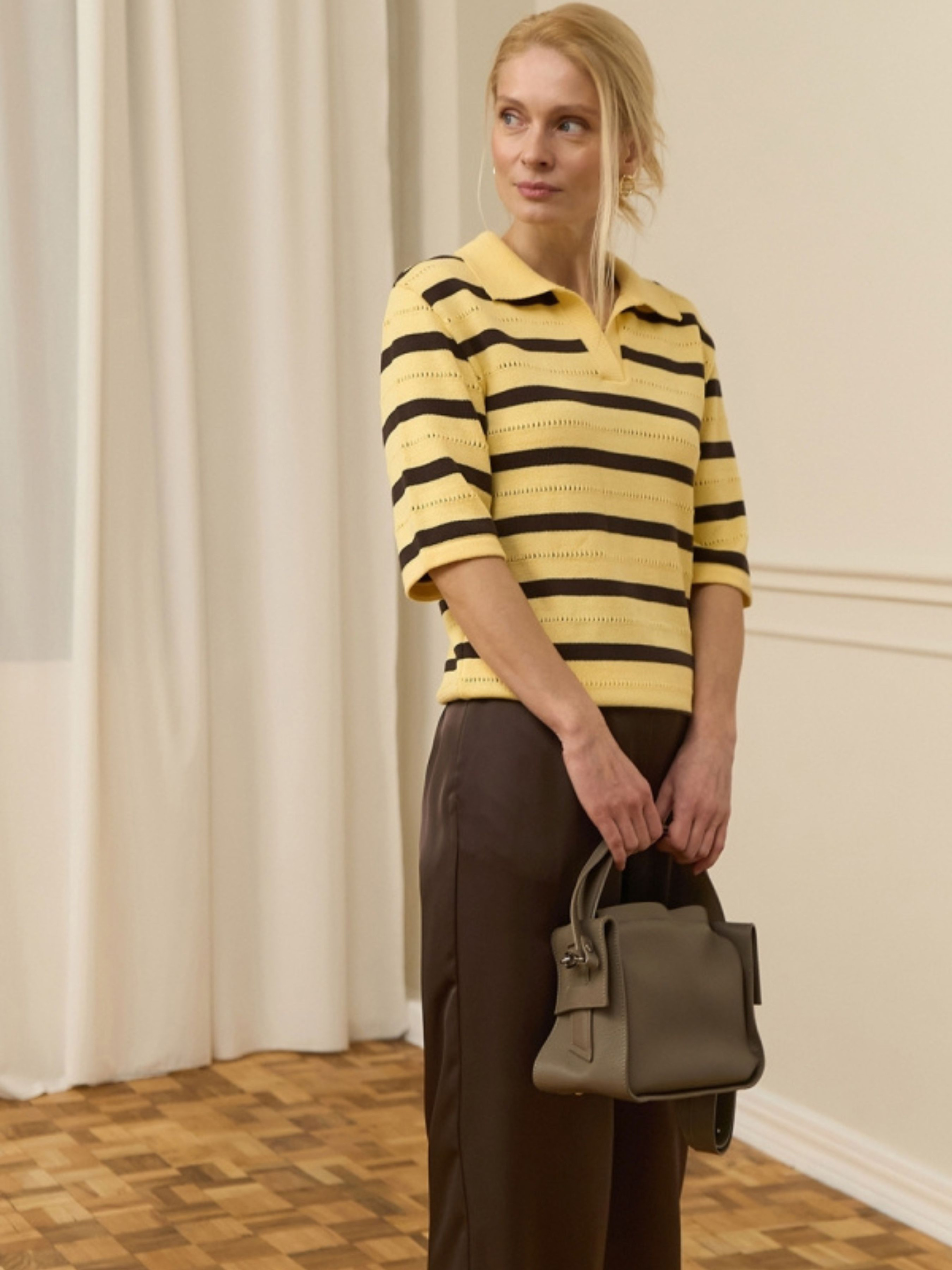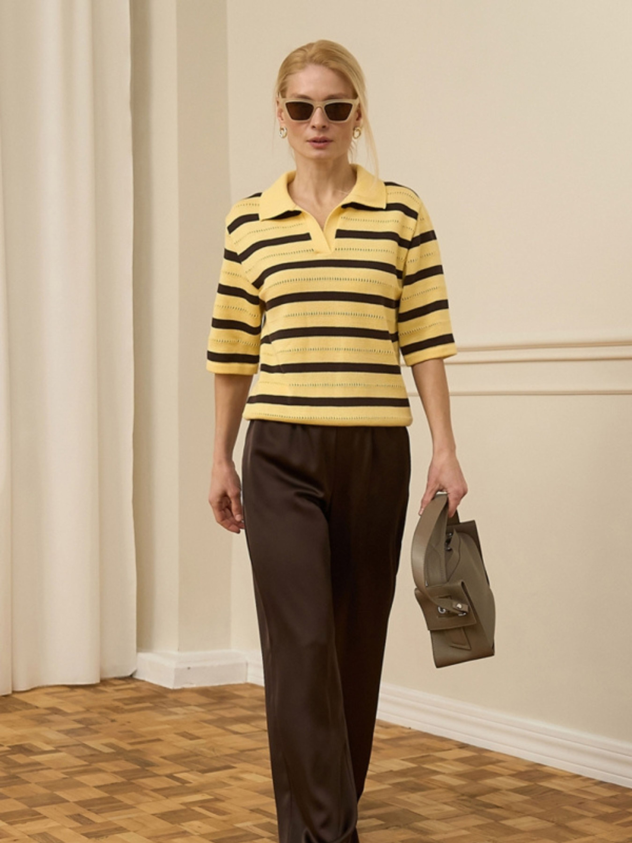 Жіноче трикотажне поло у смужку з бавовни та віскози — це ідеальне поєднання спортивної класики та сучасного повсякденного комфорту. Завдяки вільному силуету та натуральному складу, модель дарує відчуття легкості навіть у найтепліші дні. Мінімалістичний горизонтальний візерунок у смужку додає образу графічності та актуальності, роблячи це поло незамінною базою для створення стильних луків у дусі "old money" або розслабленого кежуалу. Характеристики Матеріал: Високоякісна трикотажна пряжа (м’яка та приємна до тіла). Склад: 80% бавовна, 20% віскоза (бавовна забезпечує відмінну терморегуляцію, а віскоза додає виробу ніжної шовковистості та зносостійкості). Тканина: Трикотаж (еластичний, дихаючий матеріал, що добре тримає форму). Фасон: Вільний силует (relaxed fit), що не обмежує рухів. Рукав: Короткий, комфортної ширини. Деталі: Класичний комір поло; мінімалістичний горизонтальний принт (смужка). Стиль: Кежуал (casual) / Спортивний шик / Базовий. Сезон: Літо, тепла осінь/весна. Чому це поло стане вашою улюбленою базою? Природний комфорт: Високий вміст бавовни дозволяє шкірі «дихати», а додавання віскози робить трикотаж напрочуд м'яким, що особливо важливо для щоденного носіння. Універсальний крій: Вільний силует пасує до будь-якого типу фігури, дозволяючи заправляти поло у штани для підкреслення талії або носити навипуск для створення максимально розслабленого образу. Позачасовий принт: Горизонтальна смужка — це класика, яка ніколи не виходить із моди. Вона легко комбінується з однотонним низом: від джинсів та шортів до класичних спідниць міді. Якість виконання: Щільний, але легкий трикотаж зберігає насиченість кольору та форму коміра навіть після багаторазового прання. Готове рішення для офісу та відпочинку: Поло виглядає більш зібрано, ніж звичайна футболка, тому воно чудово підходить як для робочих зустрічей із неформальним дрес-кодом, так і для активних вихідних. Рекомендації з догляду Прання: Делікатне машинне або ручне прання при температурі не вище 30°C. Рекомендується прати у вивернутому стані для захисту текстури тканини. Засоби: Використовуйте м’які рідкі гелі для кольорових речей. Уникайте агресивних засобів та відбілювачів. Сушіння: Сушіть у розправленому вигляді на горизонтальній поверхні або на вішалці в затінку. Уникайте машинної сушки. Прасування: Прасуйте з виворітного боку при низькій температурі (режим «Бавовна/Віскоза») або скористайтеся вертикальним відпарювачем.