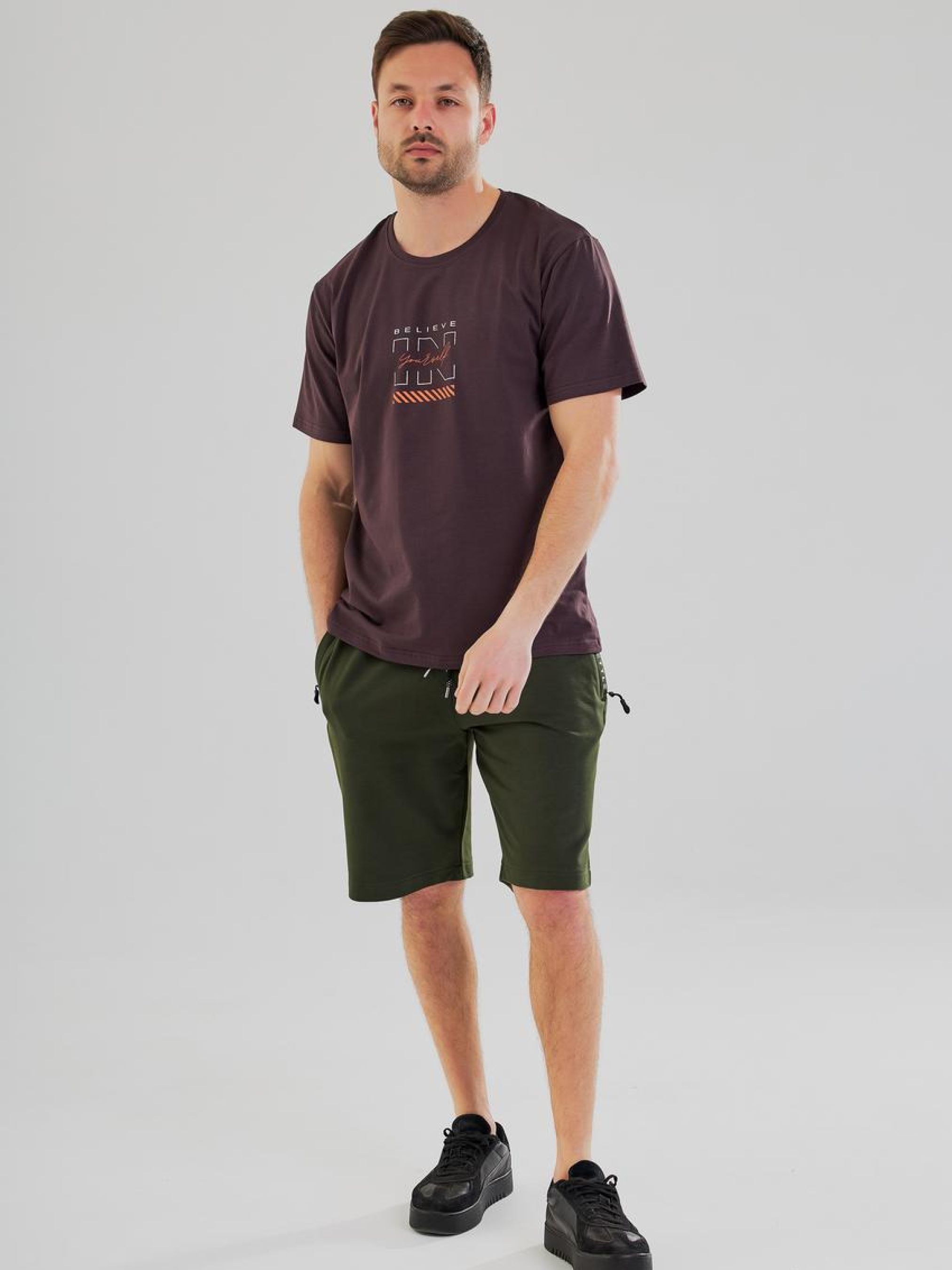 Мужская футболка с принтом "Believe in Yourself" — твоя уверенность в стиле Футболка с мотивационным принтом "Believe in Yourself" — это не просто базовый элемент гардероба, а ежедневное напоминание верить в себя. Она сочетает лаконичный дизайн, удобный крой и вдохновляющий посыл, придавая уверенности и стиля каждому образу. Идеально подходит для повседневной носки, учёбы, прогулок или активного отдыха. Материал: Мягкий и дышащий хлопковый трикотаж — комфортен даже в жаркую погоду; Износостойкий, приятный на ощупь, сохраняет форму после стирки. Крой и детали: Классический крой — отлично сидит на любой фигуре; Круглый вырез — удобный и универсальный; Принт "Believe in Yourself" — стильный акцент с глубоким смыслом; Лаконичная цветовая гамма — легко сочетается с джинсами, шортами, спортивными брюками. Преимущества: Позитивный посыл, который заряжает на день; Комфортная посадка для ежедневной носки; Универсальный вариант для города, учёбы, путешествий и повседневного стиля