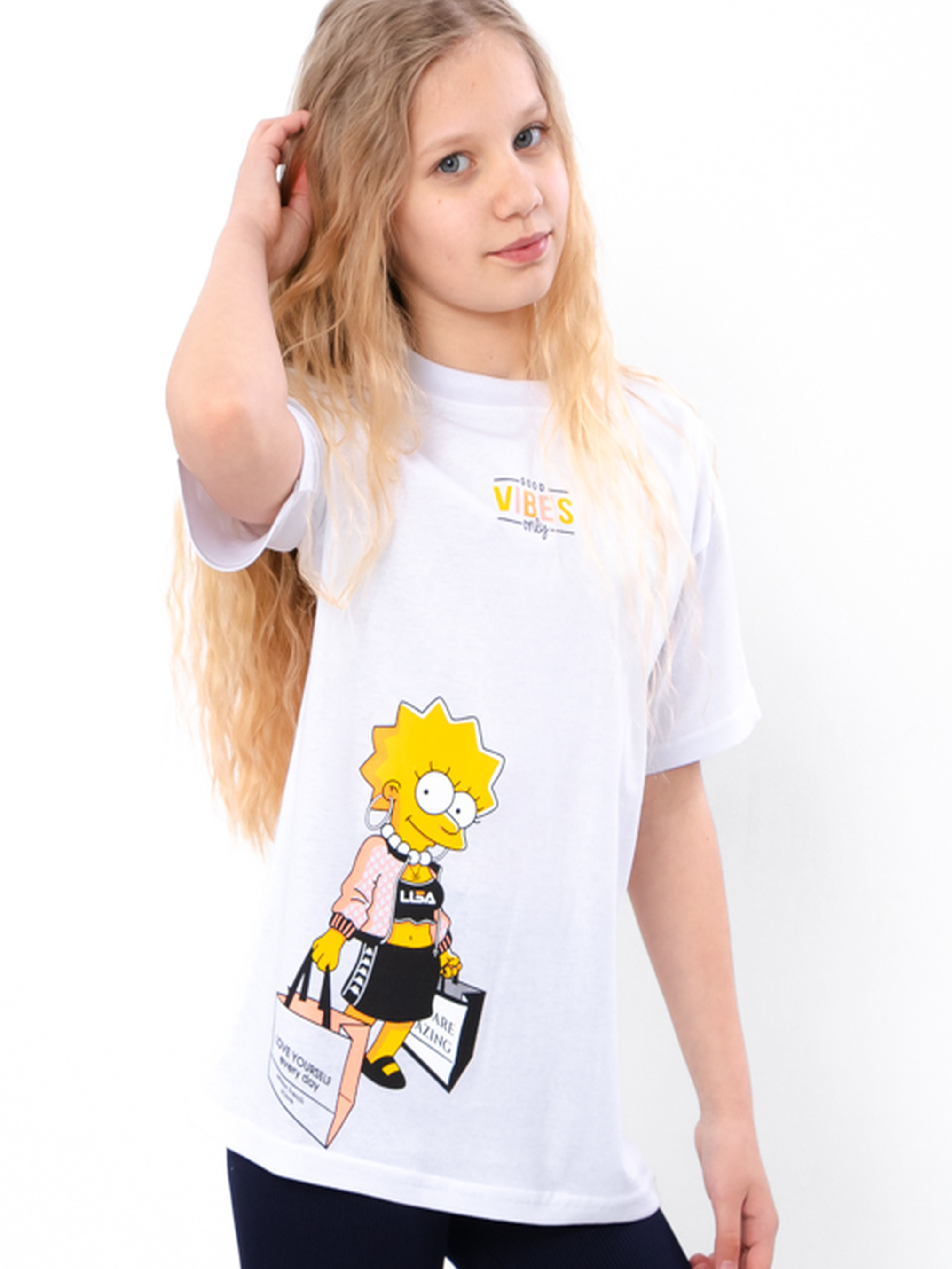 Полотно: кулір однотонний Склад полотна: 100% бавовна Зріст: 140-170 Підліткова футболка для дівчаток з модним принтом Ліза Сімпсон і написом VIBES — стильна та комфортна річ на щодень. Модель доступна в кольорах білий, персикова ваніль та світло-пісочний. Виготовлена з приємного до тіла матеріалу, футболка поєднує яскравий дизайн із зручністю, що робить її ідеальним вибором для активного підліткового гардеробу.