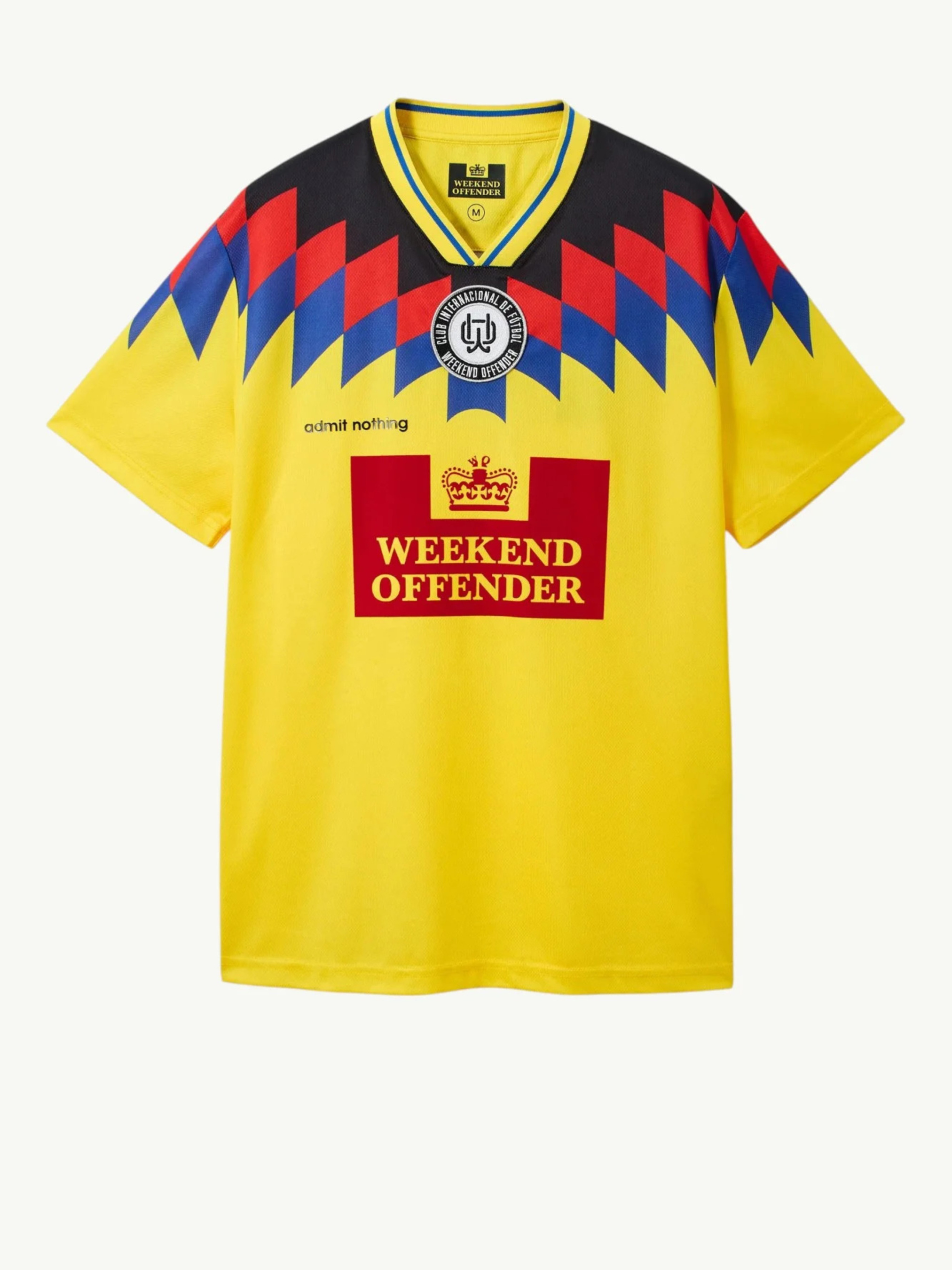 Футболка Weekend Offender Club Football Shirt Yellow — модель выполнена в насыщенном желтом цвете с контрастной геометрической вставкой в верхней части, что формирует выразительный акцент и придает силуэту ретро-настроения 90-х. Центральный принт Weekend Offender в сочетании с надписью admit nothing и эмблемой Club Internacional подчеркивают характер бренда. Футболка изготовлена из легкого дышащего полиэстера, хорошо пропускающего воздух и быстро отводящего влагу. Материал сохраняет форму, не теряет интенсивность цвета и подходит для активной повседневной носки в теплый сезон. V-образный воротник с контрастной окантовкой придает спортивную четкость, а прямой крой обеспечивает комфортную универсальную посадку. Прекрасно дополняет сумки, куртки или брюки от Weekend Offender, подчеркивая стиль бренда.