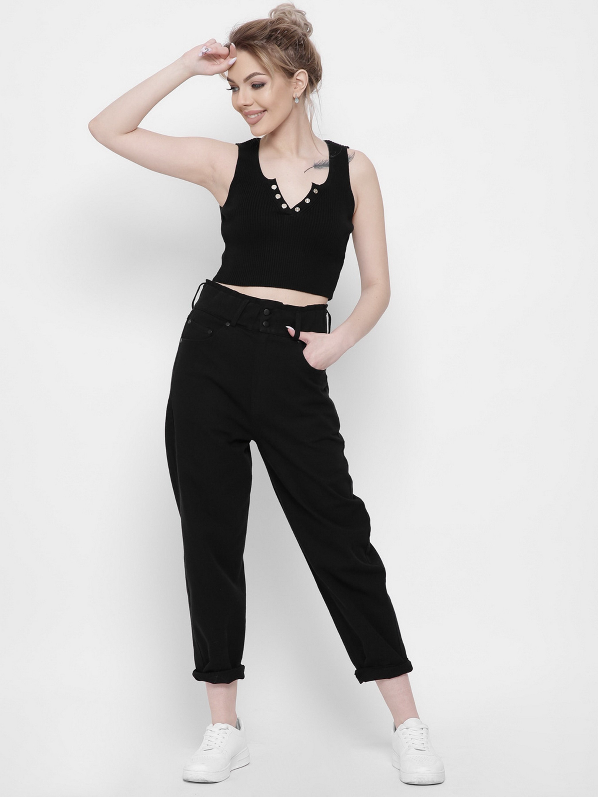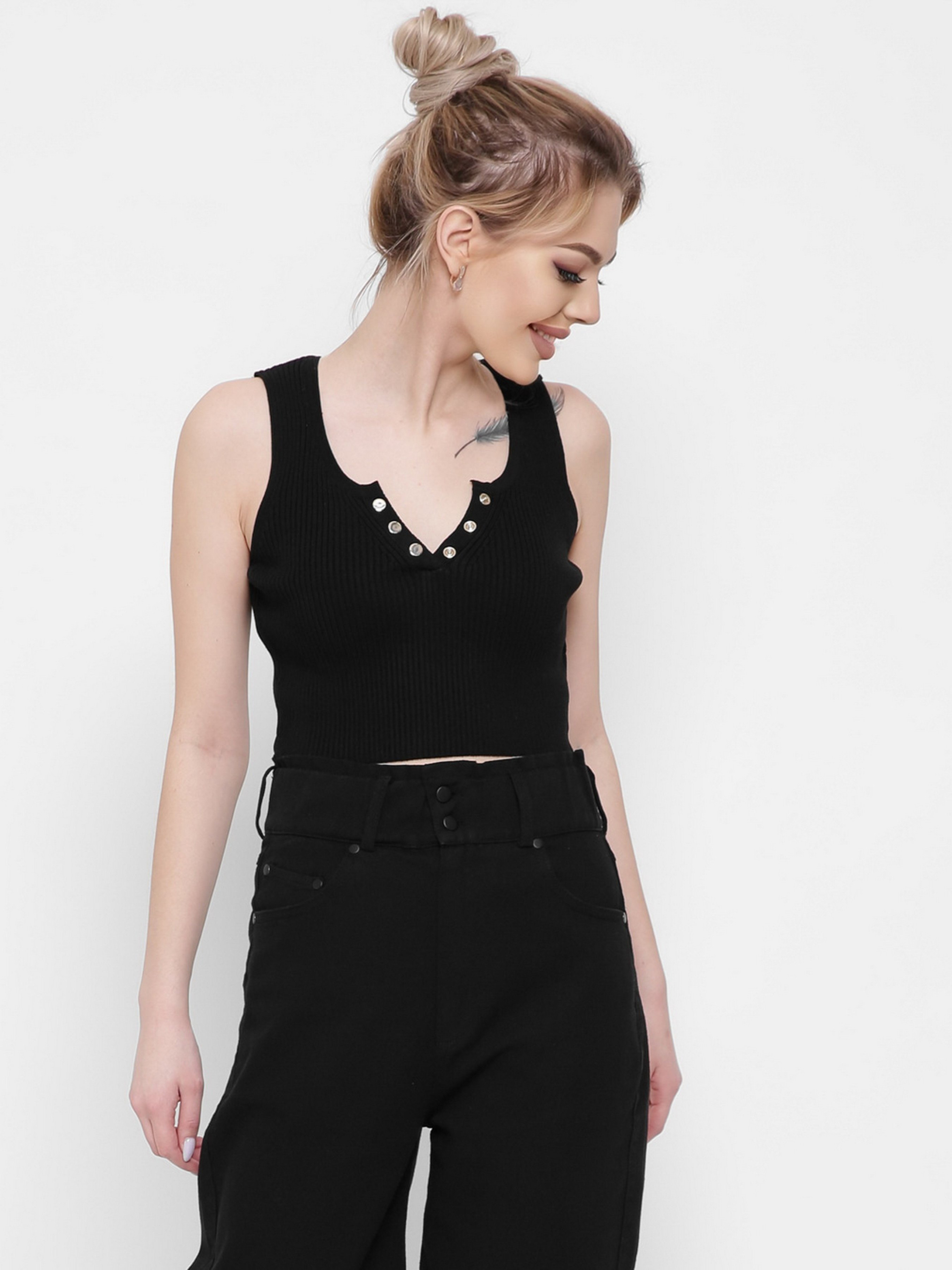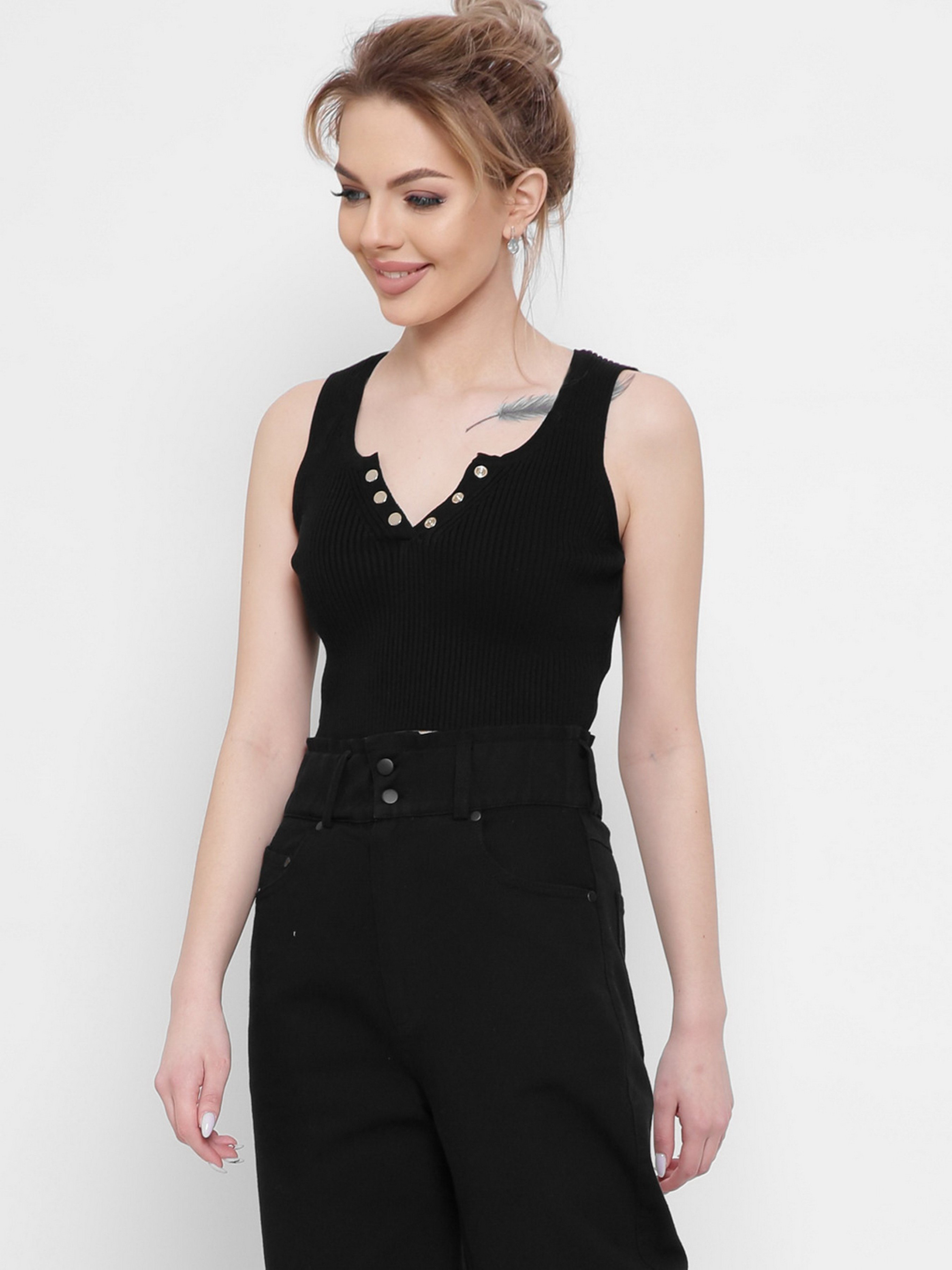 Женский облегающий топ из вискозной ткани. Глубокий вырез на широких бретелях с застежкой на пуговицах. Спинка закрытая.