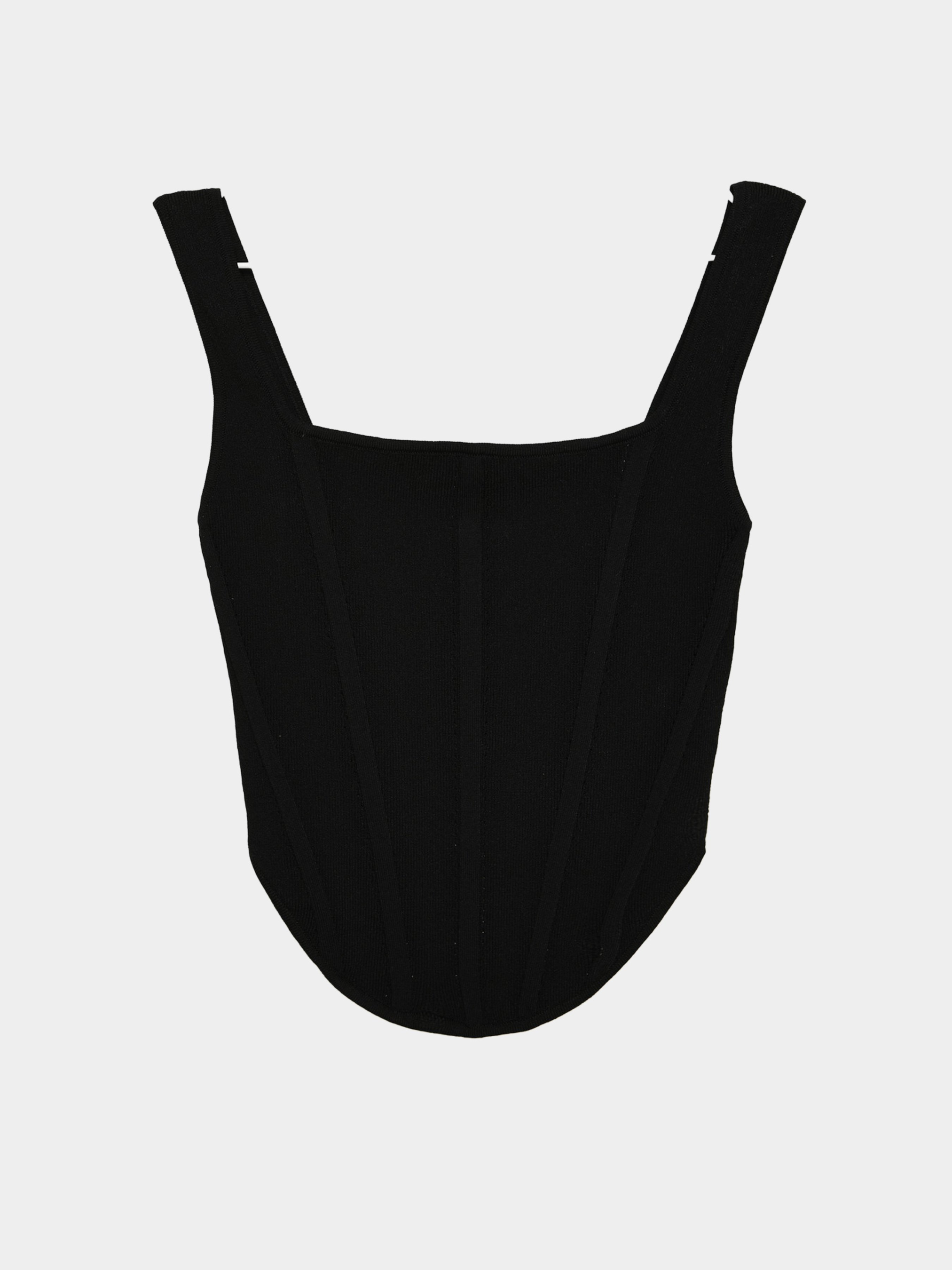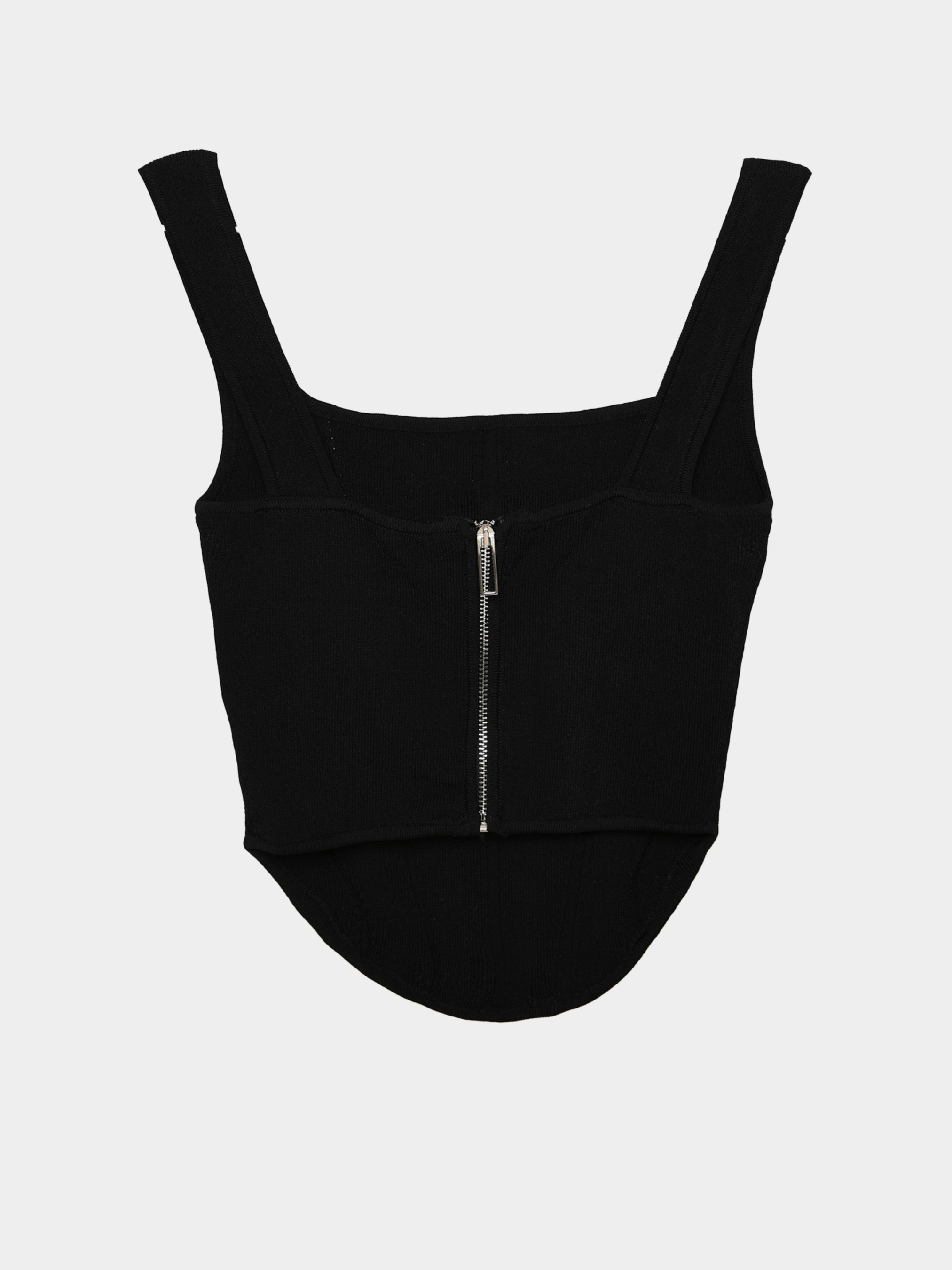Трикотажный женский топ. Квадратный вырез, спереди закругленный низ,укороченная спинка. Застежка на молнию. По ткани несколько выпуклых вертикальных полос. Сочетается с джинсами и брюками.