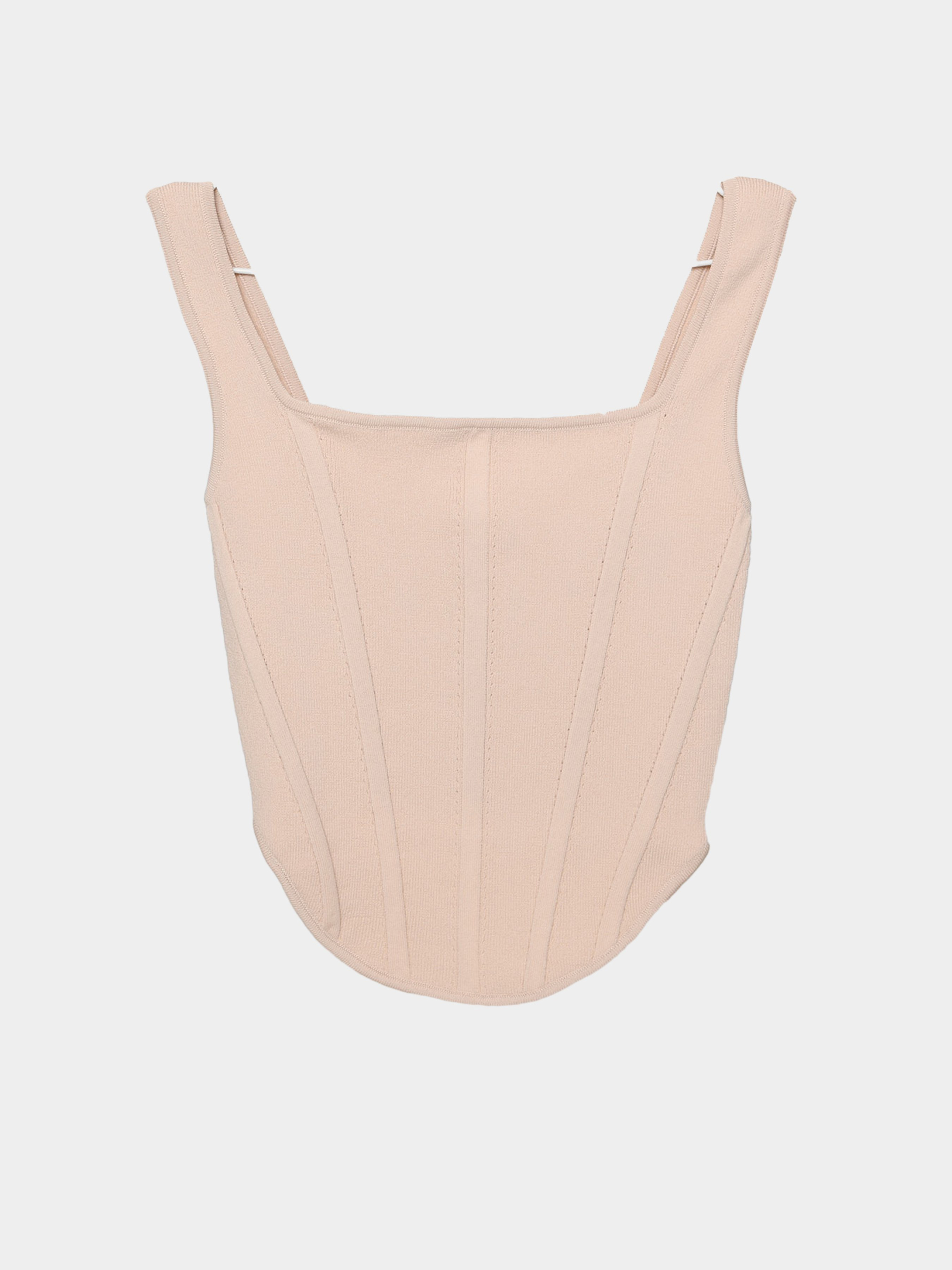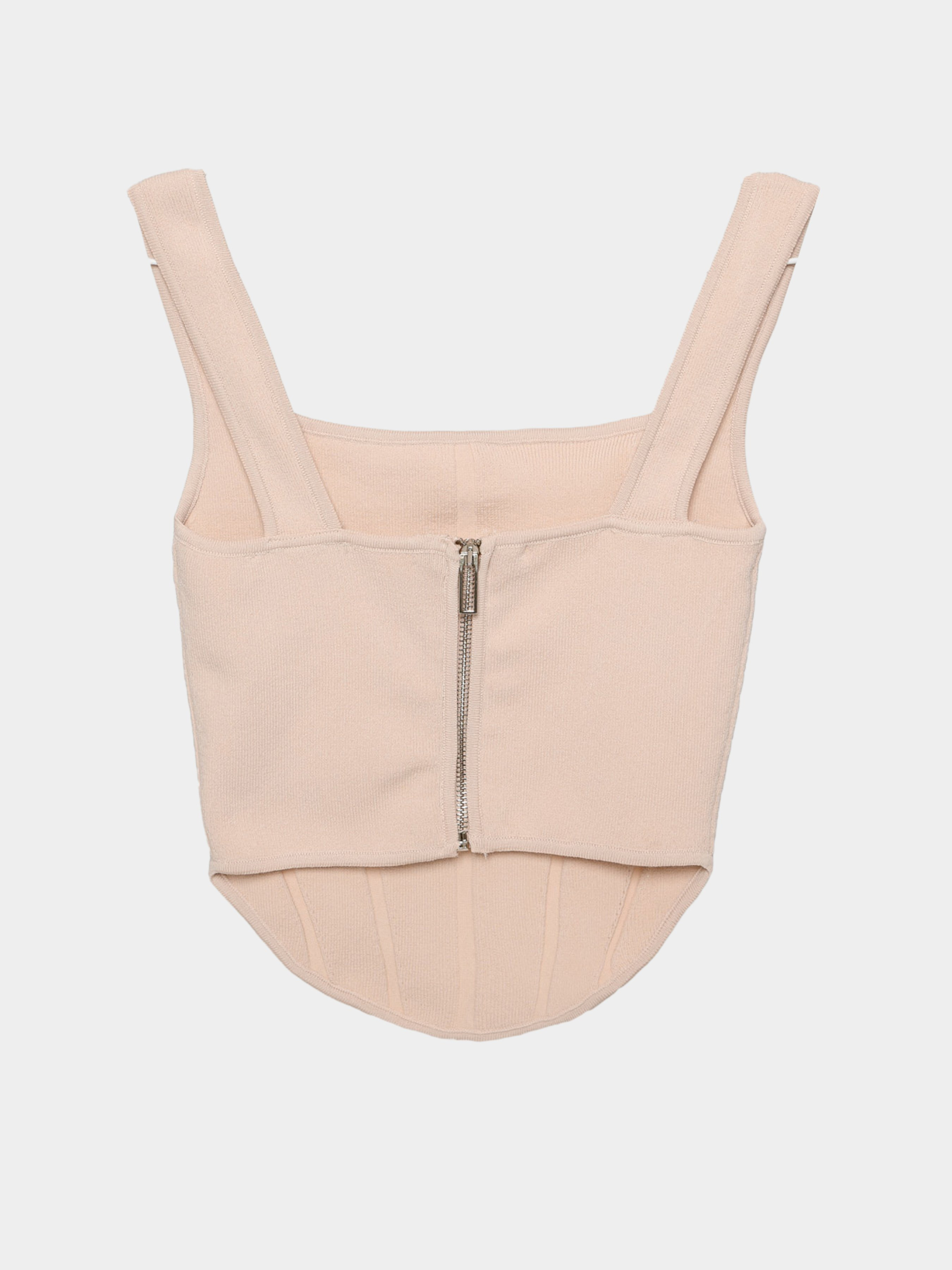 Трикотажный женский топ. Квадратный вырез, спереди закругленный низ,укороченная спинка. Застежка на молнию. По ткани несколько выпуклых вертикальных полос. Сочетается с джинсами и брюками.