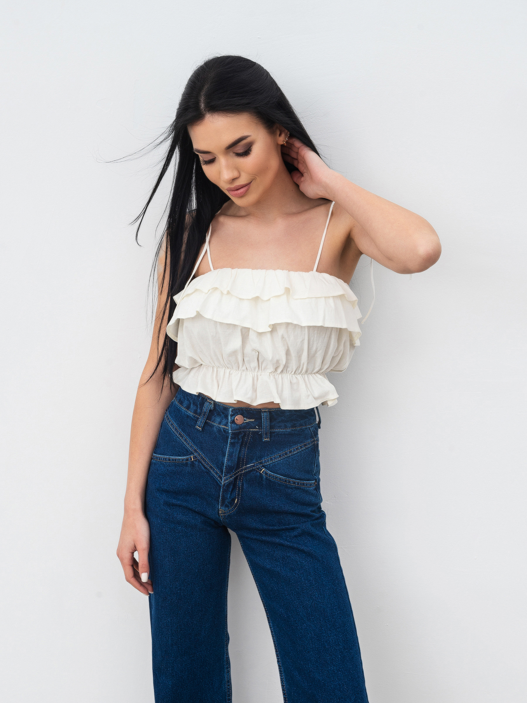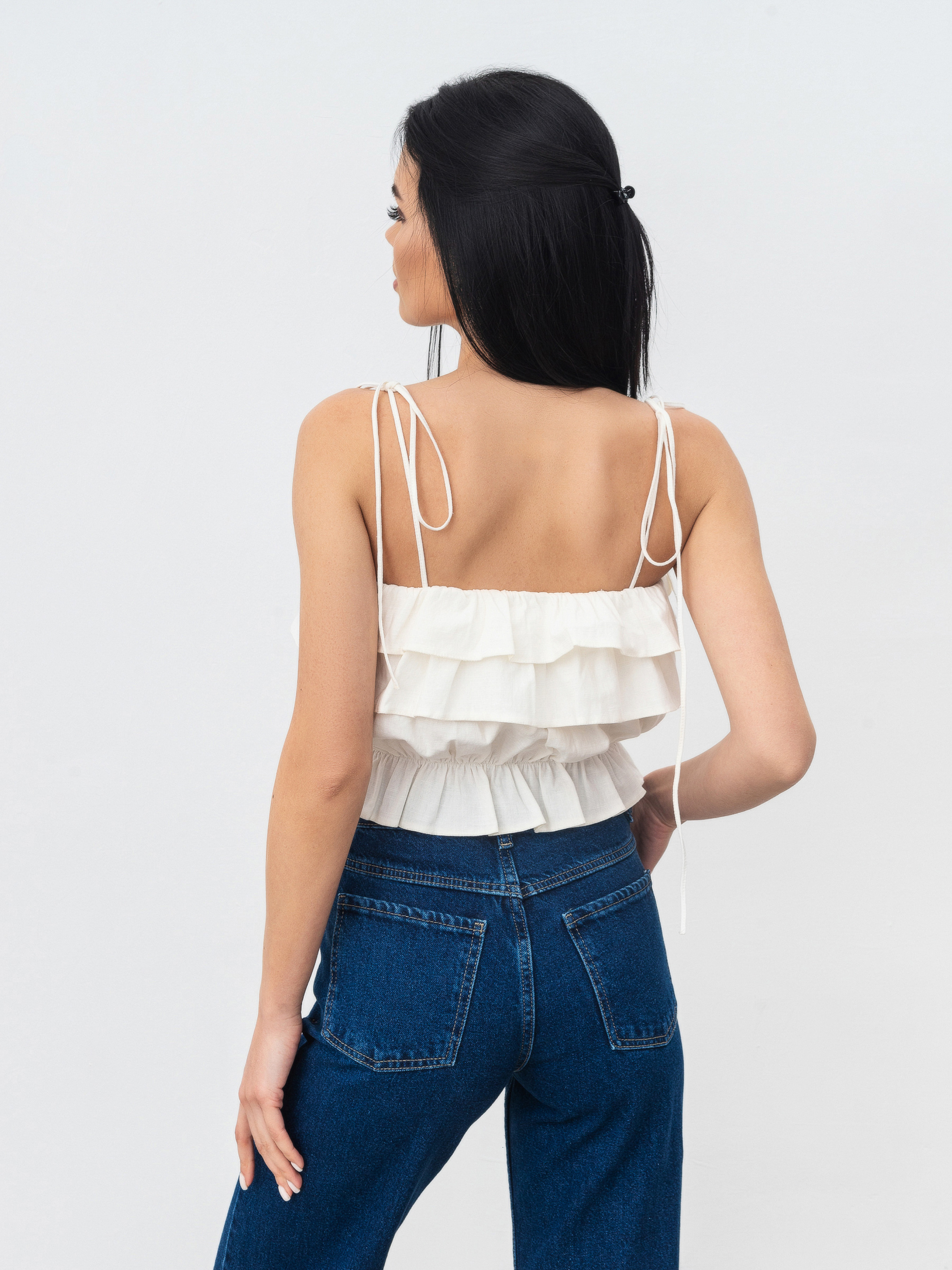 Укороченный топ с рюшами. Топ на тонких бретелях, которые завязываются на плечах, за счет чего можно выбрать желаемую посадку. Верх и талия на резинке. Топ станет отличным акцентом летнего гардероба и подойдет на любой случай. XS-S Длина по спине: 26 см Полуобхват груди: 34 см Полуобхват талии: 29 см S-M Длина по спине: 26 см Полуобхват груди: 35 см Полуобхват талии: 31 см M-L Длина по спине : 27 см Полуобхват груди: 42 см Полуобхват талии: 32 см