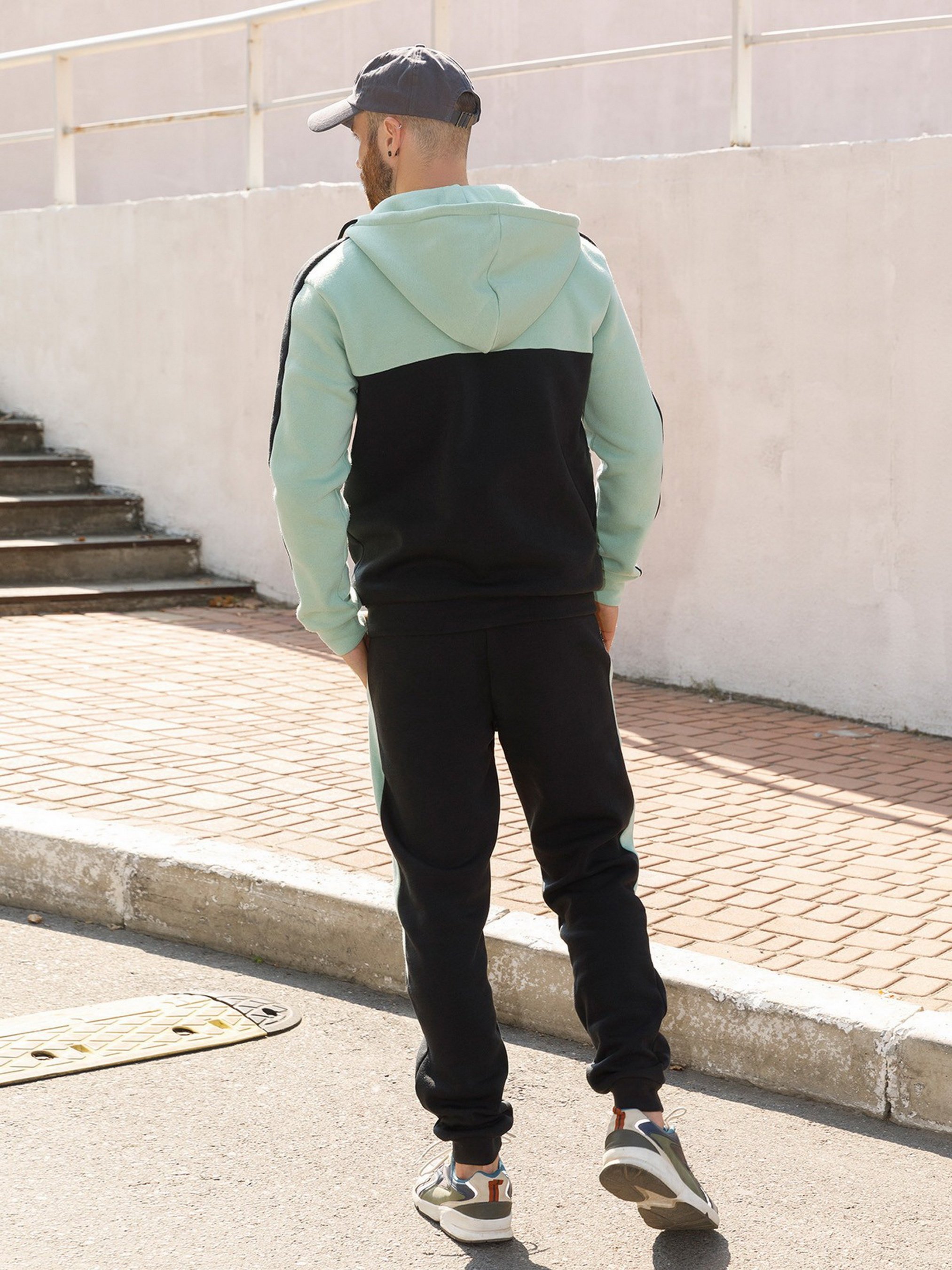 Теплый костюм из серого и темно-серого трикотажа на флисе с лампасами. Толстовка с капюшоном и манжетами оснащена длинными рукавами и молнией. Модель с карманами. Брюки с манжетами, резинкой на поясе и боковыми карманами. Материал: Трикотаж на флисе Состав: 50%, хлопок, 50%, полиэстер